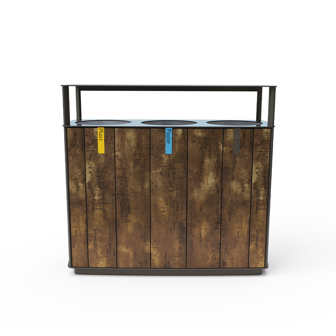 A designer waste bin with a capacity of 3x50 liters, suitable not only for outdoor areas such as parks and playgrounds but also for indoor spaces like shopping centers, airport terminals, lobbies, and more.
