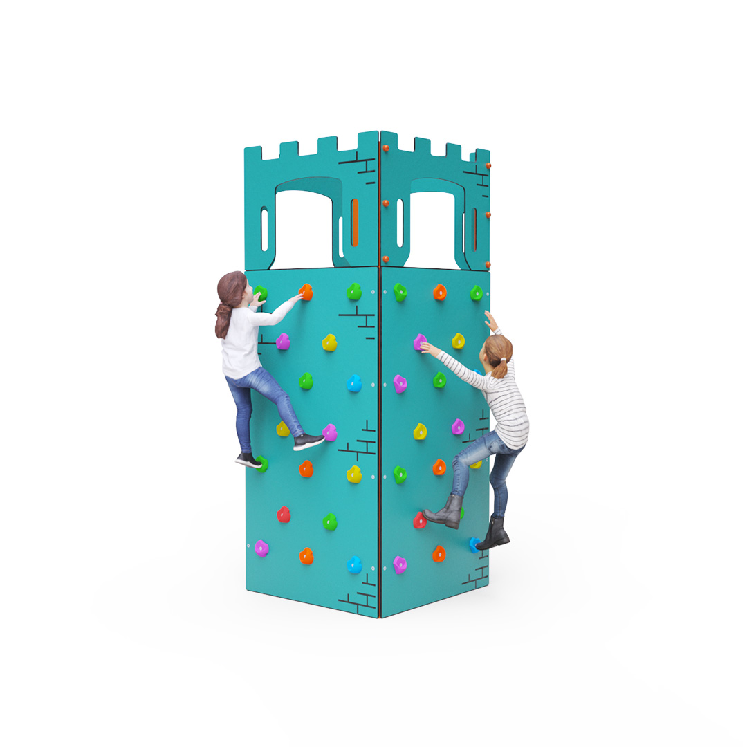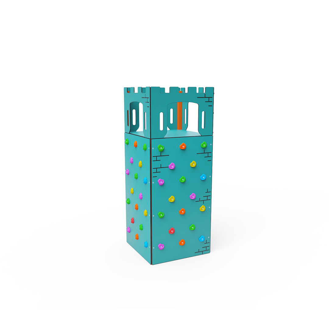 A climbing tower made from HPL material with climbing stones. Children love climbing, and with this tower, up to 4 children can compete in climbing simultaneously. The construction of the climbing tower is made of galvanized steel coated with powder-baked paint, designed for long-lasting durability and safety. The walls are made of HPL material, with climbing holds cut into them. For the landing area, it is recommended to use a grass reinforcement mat.