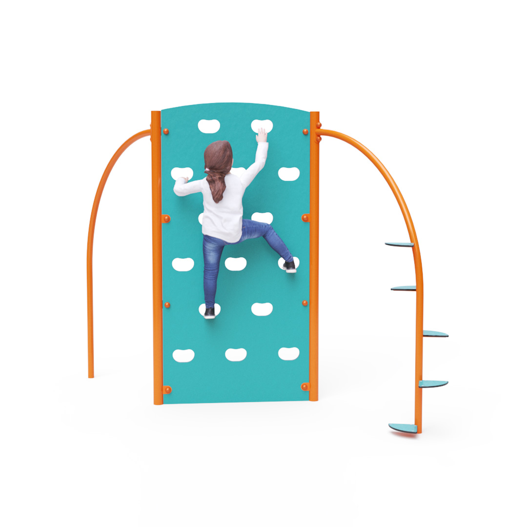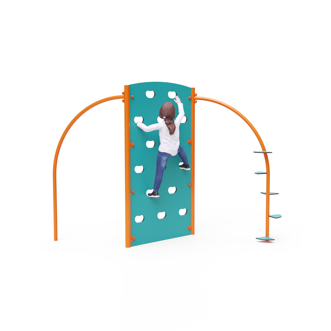 A double-sided climbing wall with climbing bars and footholds. Although this play element may seem more suitable for older youth and not ideal for playgrounds, children love climbing walls. The construction of the climbing tower is made from galvanized steel, coated with powder-baked paint for durability and safety. The walls are made from HPL material and feature cut-out climbing grips.A grass reinforcement mat is recommended as the impact surface.