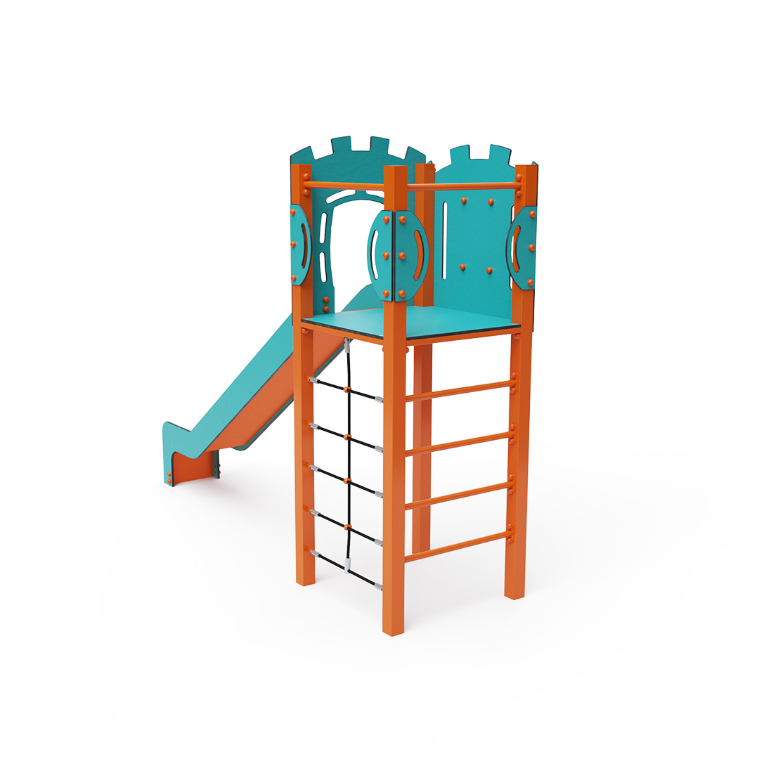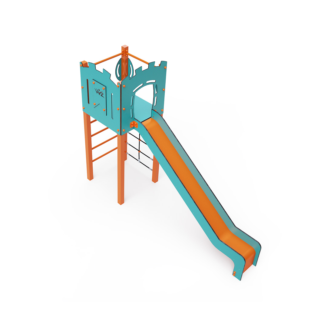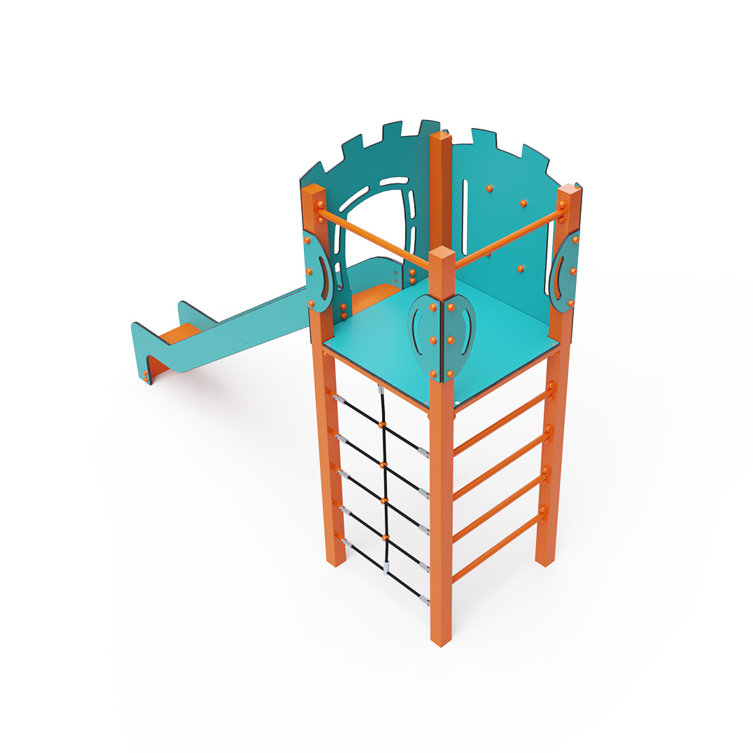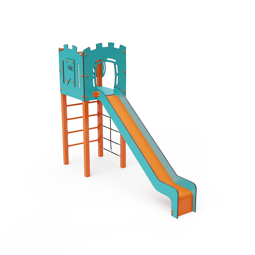 A single-tower combination set where children can climb using a ladder or a rope climb and slide down via a slide. The turquoise-orange design is inviting from a distance. The steel construction is weather-resistant due to hot-dip galvanizing and durable powder coating. The HPL material used is chemically resistant, UV-resistant – colorfast, non-toxic, recyclable, and unbreakable, ensuring there is no risk of injury to children from sharp edges or fragments. The ropes are made of polyester fibers wound around a central reinforcement, enhancing the rope's strength and resistance to mechanical stress. Polyester is resistant to microorganisms and weather conditions, dries quickly after rain, is colorfast, and has high strength. All joints are stainless steel and covered with plastic caps for increased durability and safety.