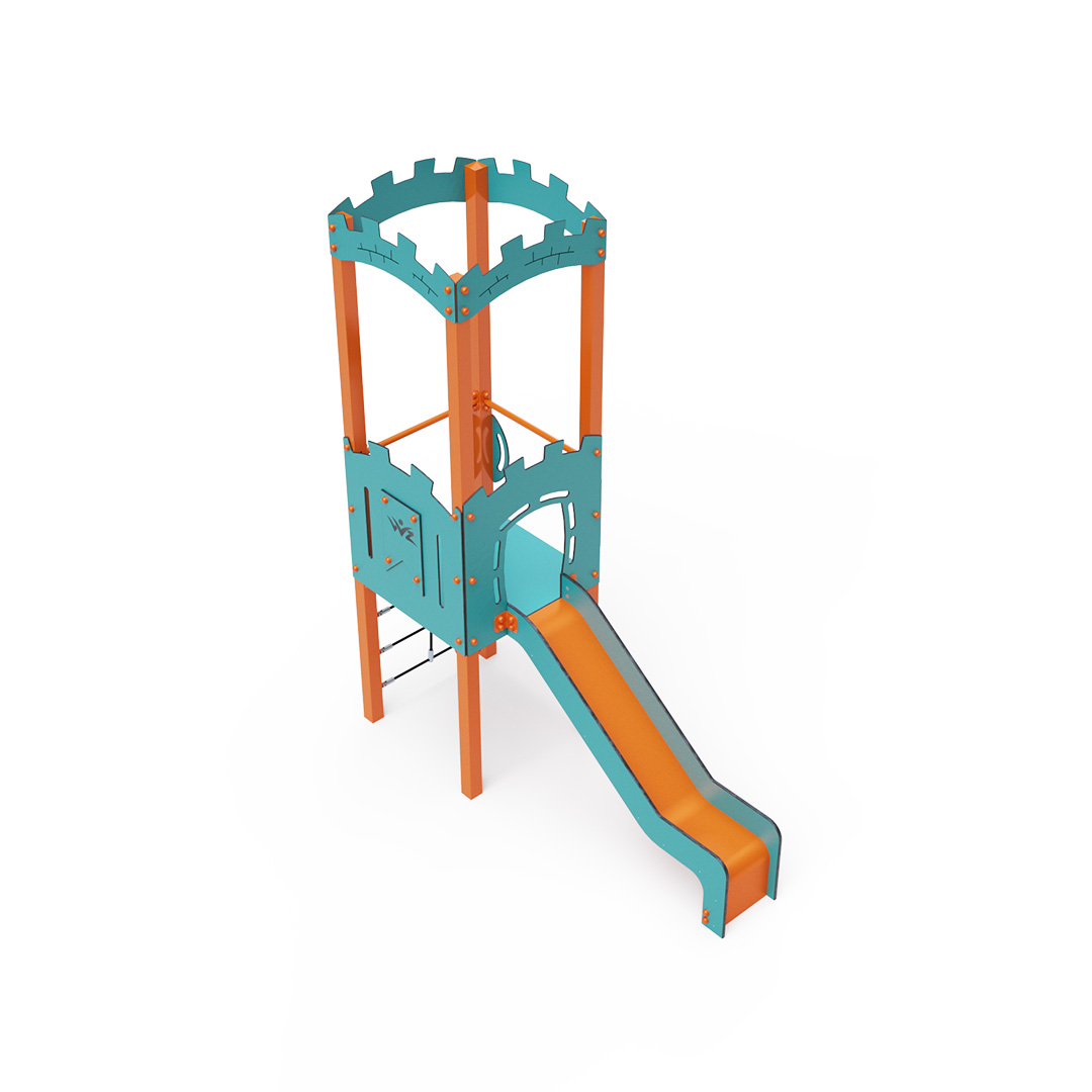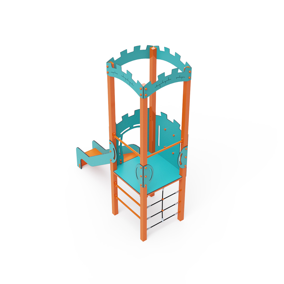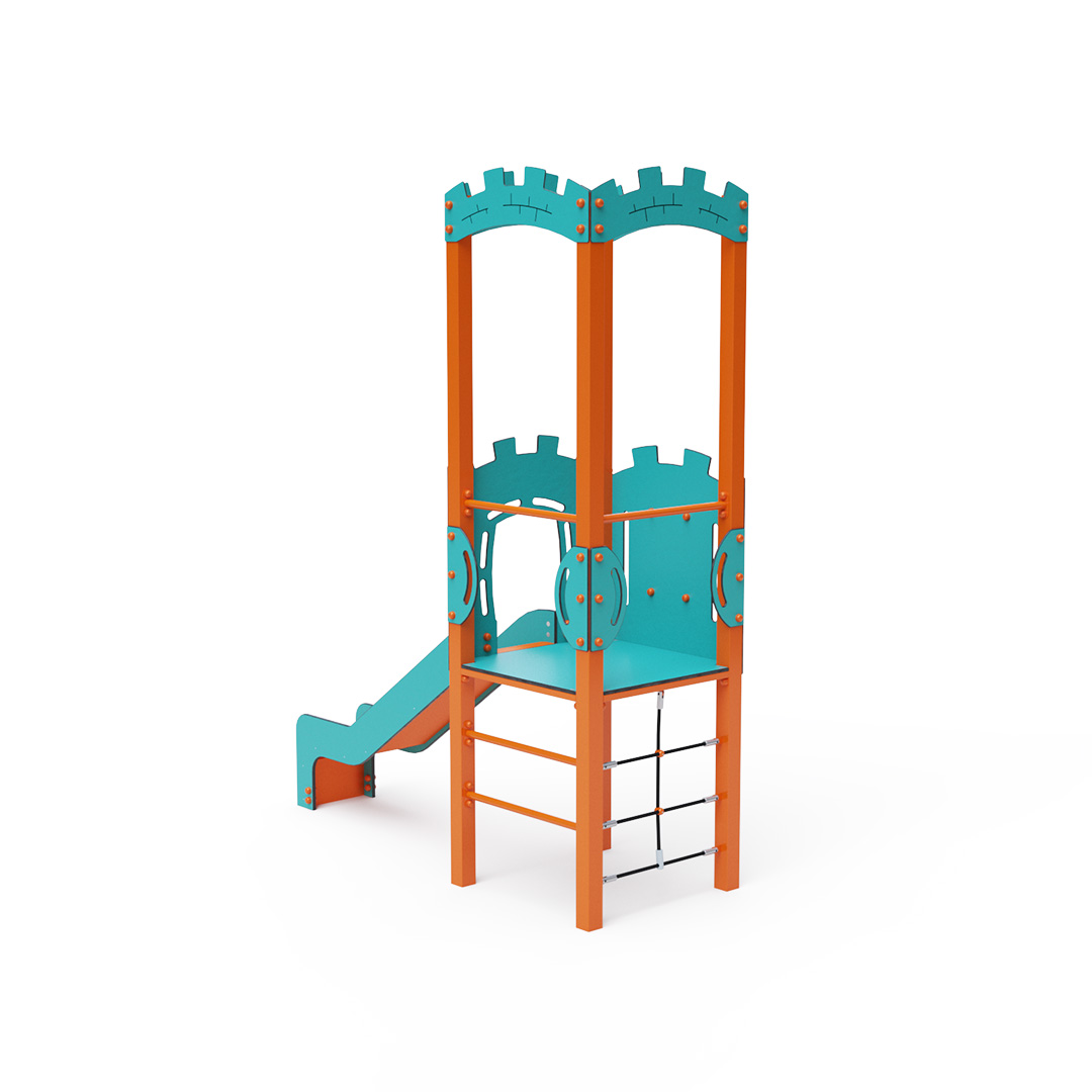 A single-tower combination set – featuring a tower with battlements, where children can climb using a rope climbing wall or a ladder and slide down via a slide. The turquoise-orange design is inviting from a distance. The steel construction is weather-resistant due to hot-dip galvanizing and durable powder coating. The HPL material used is chemically resistant, UV-resistant – colorfast, non-toxic, recyclable, and unbreakable, ensuring there is no risk of injury to children from sharp edges or fragments. The ropes are made from polyester fibers wound around a central reinforcement, enhancing the rope's strength and resistance to mechanical stress. Polyester is resistant to microorganisms, weather conditions, dries quickly after rain, is colorfast, and features high strength. All joints are stainless steel and covered with plastic caps for increased durability and safety.