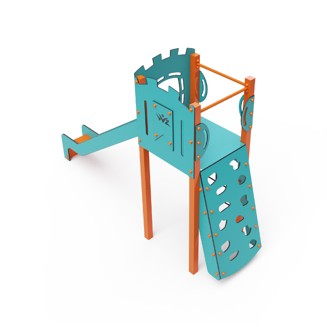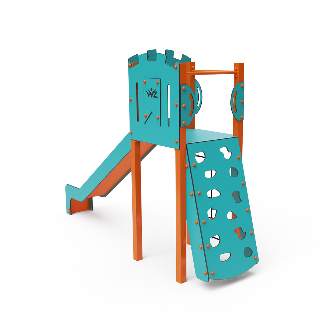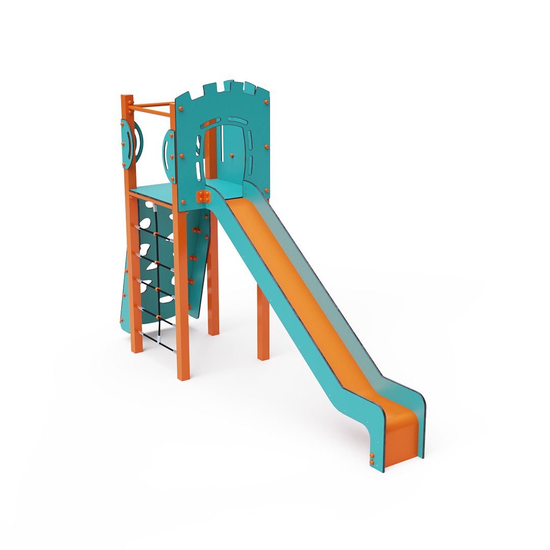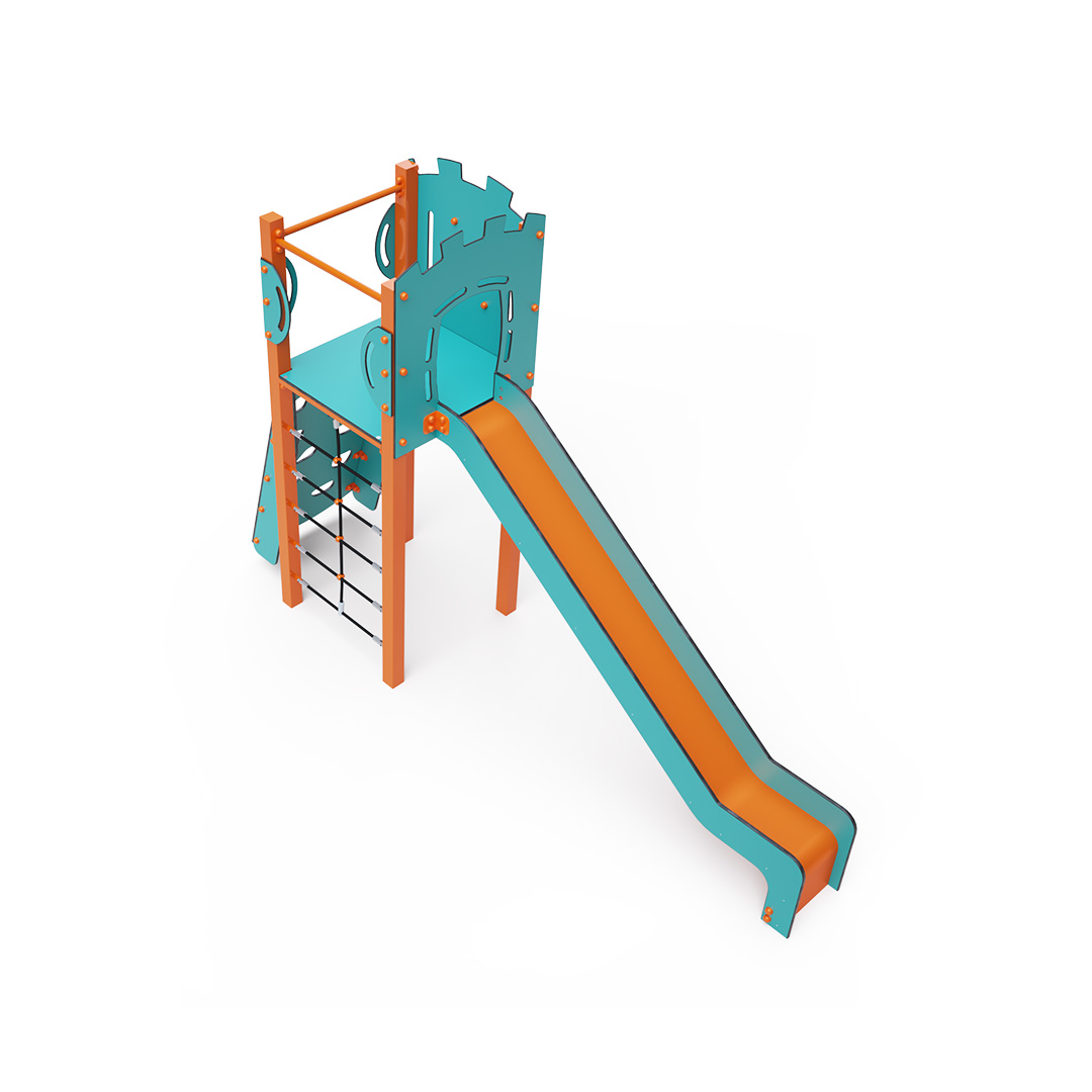 A single-tower combination set – featuring a tower where children can climb using a rope climbing wall or a climbing wall with grips and slide down via a slide. The turquoise-orange design is inviting from a distance. The steel construction is weather-resistant due to hot-dip galvanizing and durable powder coating. The HDPE plastic used is chemically resistant, UV-resistant – colorfast, non-toxic, recyclable, and unbreakable, ensuring there is no risk of injury to children from sharp edges or fragments. The ropes are made from polyester fibers wound around a central reinforcement, enhancing the rope's strength and resistance to mechanical stress. Polyester is resistant to microorganisms and weather conditions, dries quickly after rain, is colorfast, and features high strength. All joints are stainless steel and covered with plastic caps for increased durability and safety.