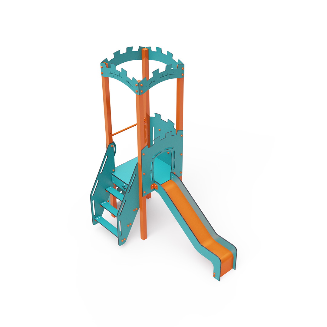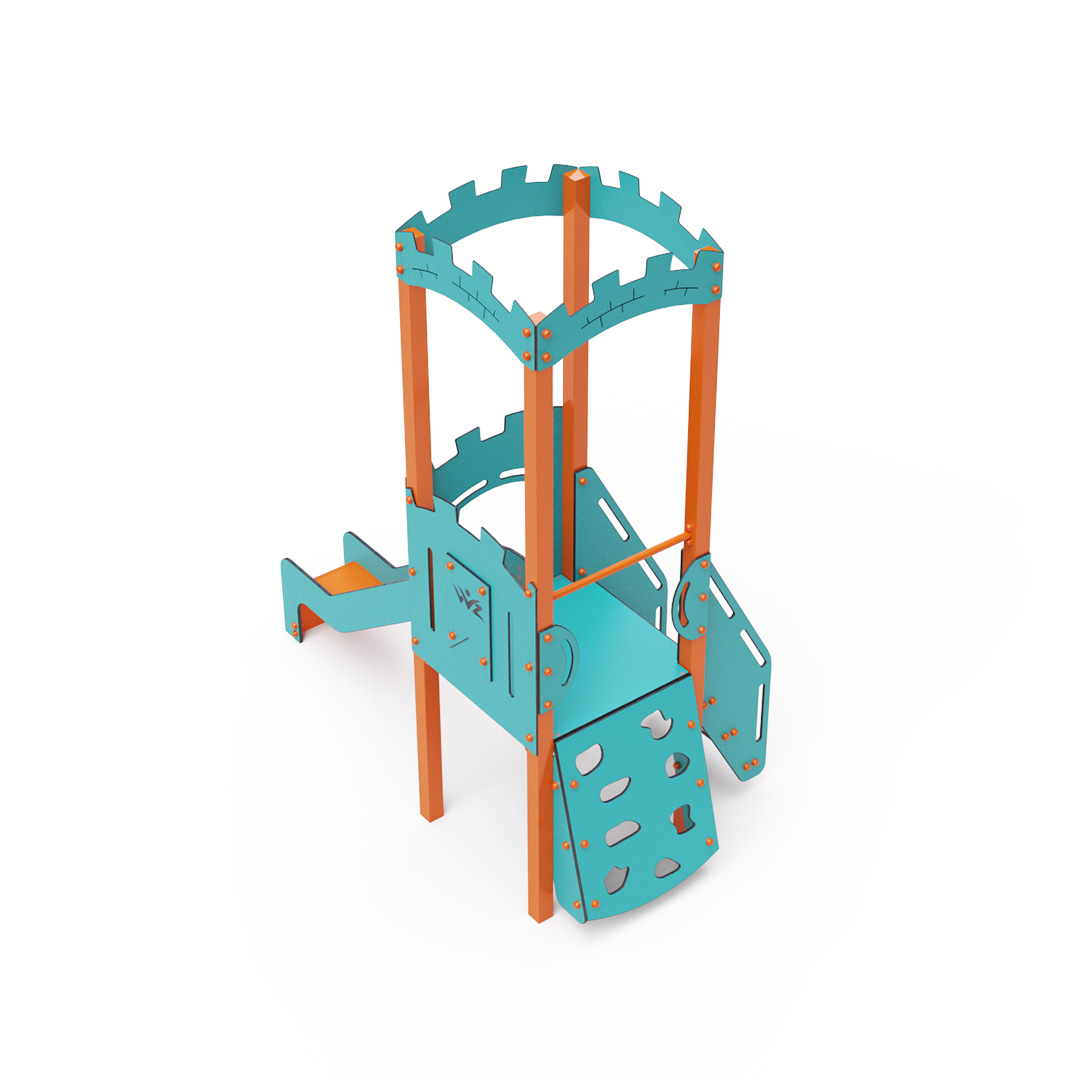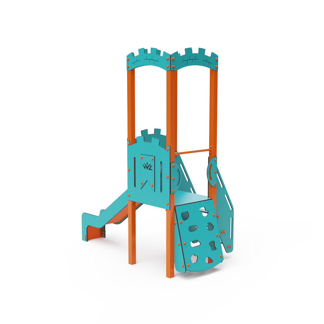 A single-tower combination set – featuring a tower with battlements, where children can climb using stairs or a climbing wall with grips and slide down via a slide. The turquoise-orange design is inviting from a distance. The steel construction is weather-resistant due to hot-dip galvanizing and durable powder coating. The HPL material used is chemically resistant, UV-resistant – colorfast, non-toxic, recyclable, and unbreakable, ensuring there is no risk of injury to children from sharp edges or fragments. All joints are stainless steel and covered with plastic caps for increased durability and safety.