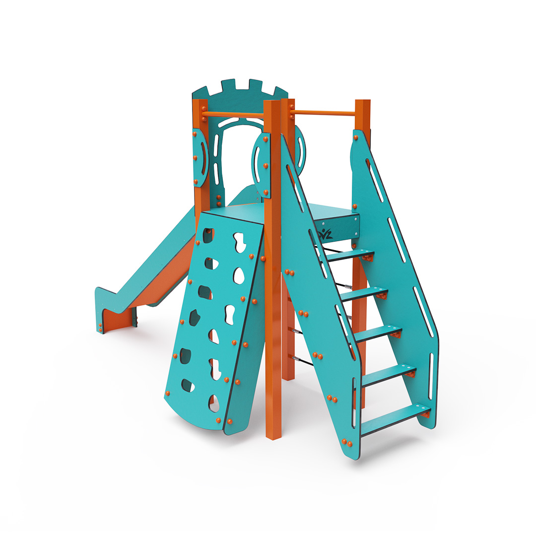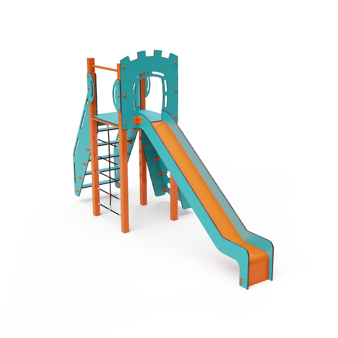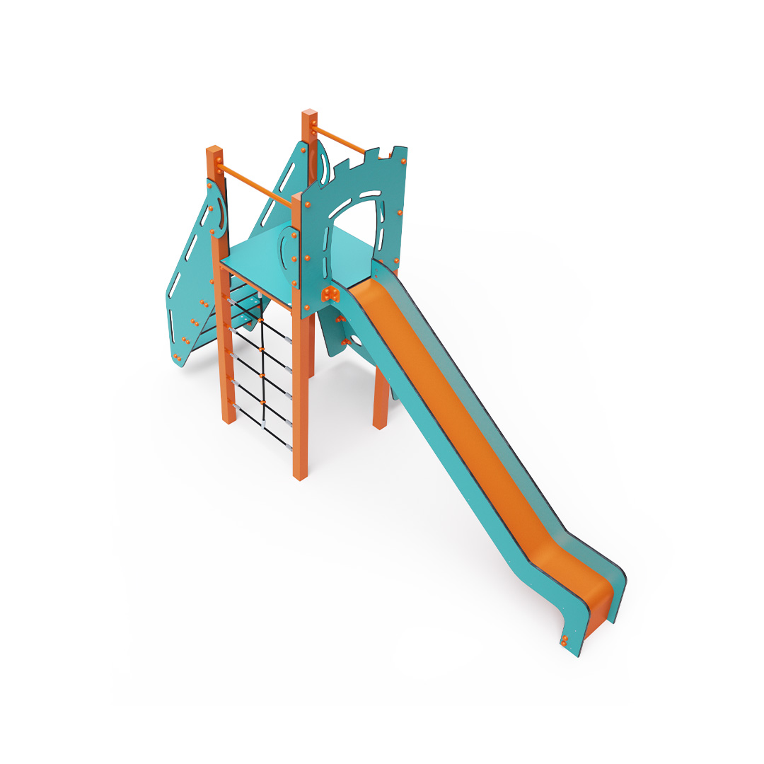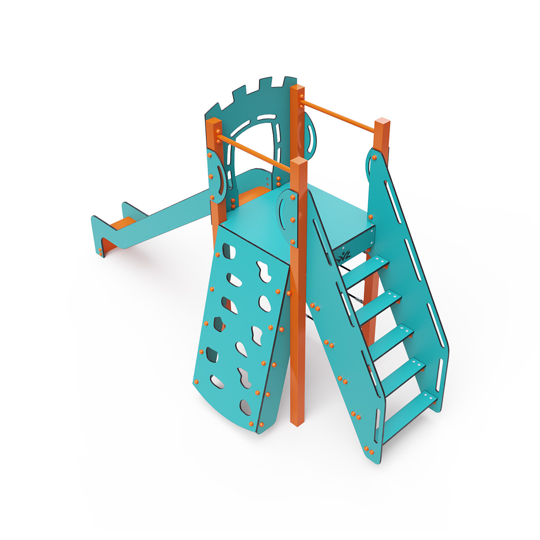 Single-tower combination set - a low tower that children can climb up using steps, an inclined climbing wall with grips, or a rope ascent, and slide down using the slide. The turquoise-orange design attracts children to play from a distance. The steel structure is resistant to weather conditions thanks to hot-dip galvanizing and coating with a durable powder paint. The HPL material used is chemically resistant, UV-resistant - colorfast, non-toxic, recyclable, and unbreakable. This prevents injuries to children from sharp edges or fragments. All connections are stainless steel and covered with plastic caps to increase durability and safety.