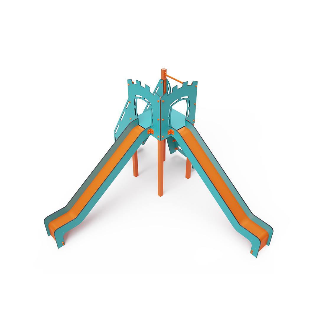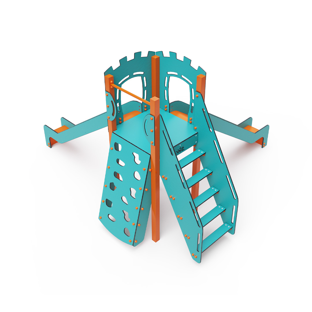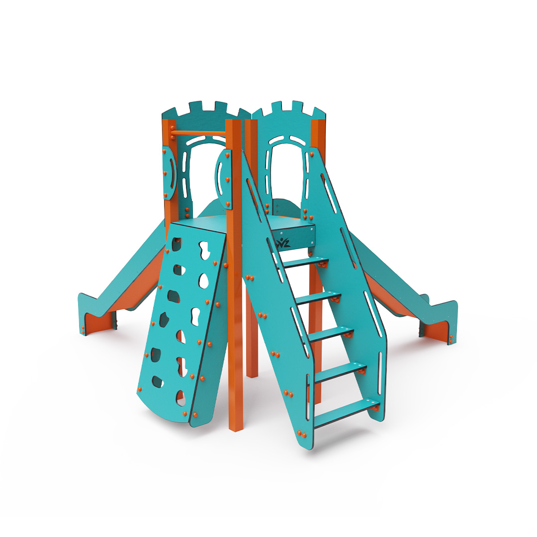 A single-tower combination set - a tower that children can climb up using steps or a climbing wall with grips and slide down using one of the two slides. The turquoise-orange design attracts children to play from a distance. The steel structure is resistant to weather conditions thanks to hot-dip galvanizing and coating with a durable powder paint. The HPL material used is chemically resistant, UV-resistant - colorfast, non-toxic, recyclable, and unbreakable. This prevents injuries to children from sharp edges or fragments. All connections are stainless steel and covered with plastic caps to increase durability and safety.