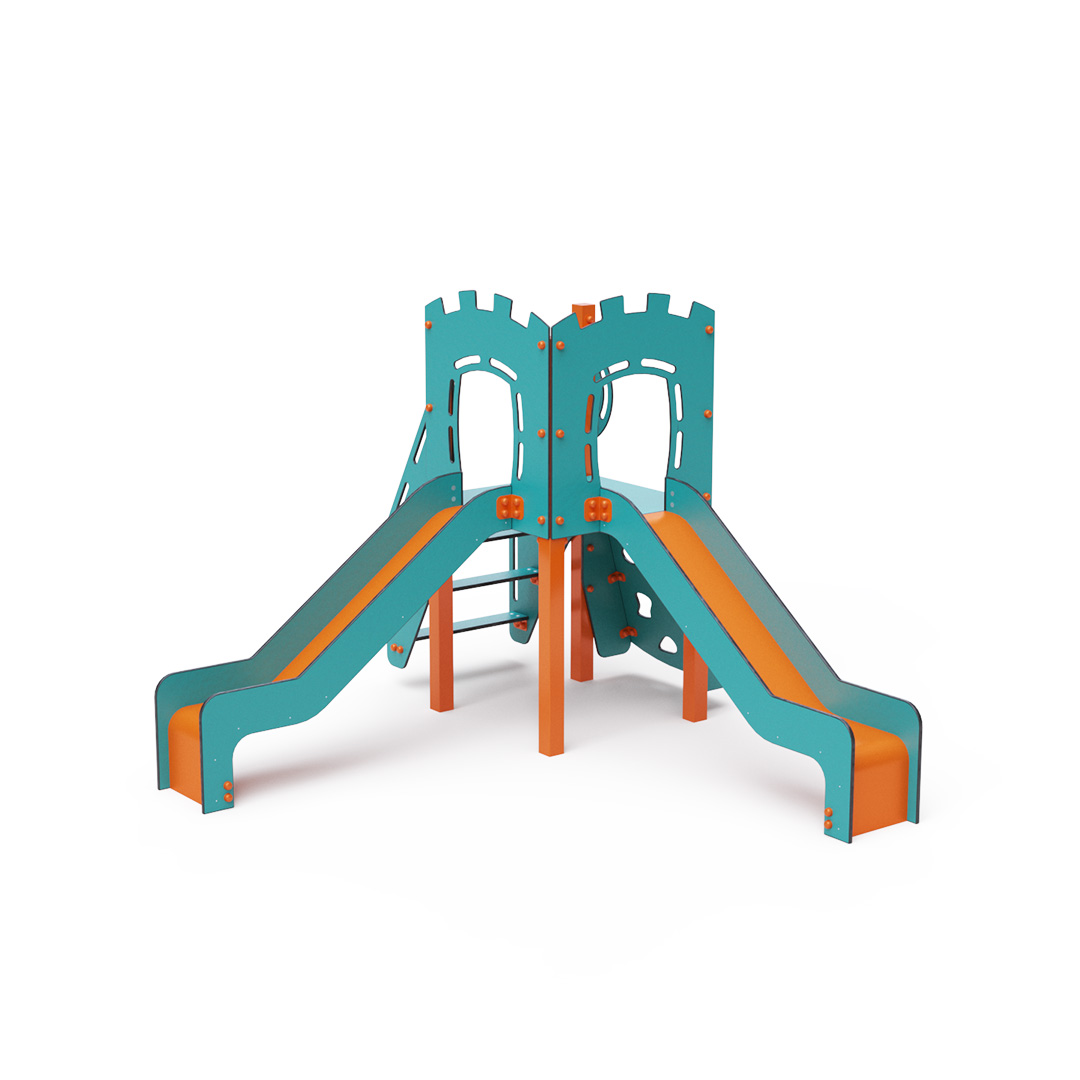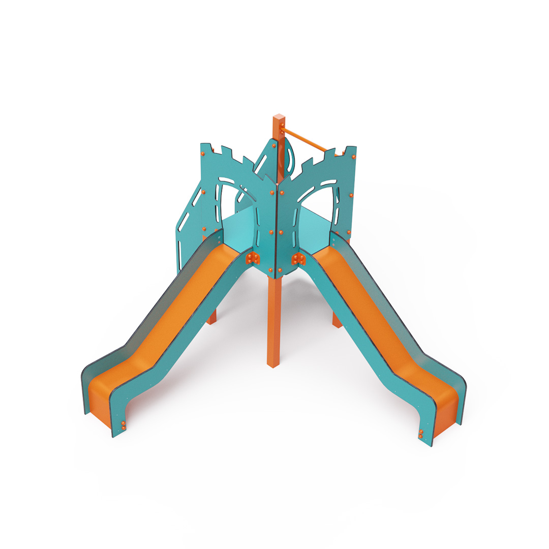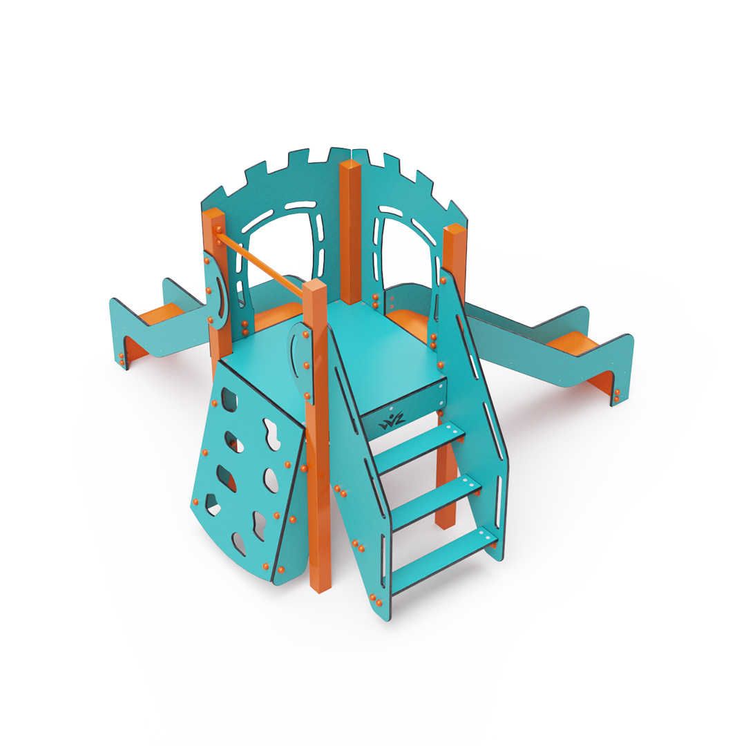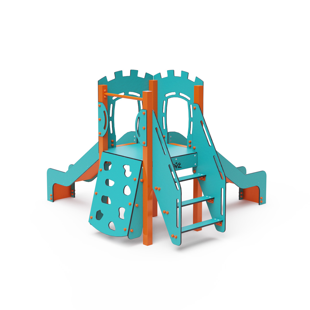 A single-tower combination set - a tower that children can climb up using steps or a climbing wall with grips and slide down using one of the two slides. The turquoise-orange design attracts children to play from a distance. The steel structure is resistant to weather conditions thanks to hot-dip galvanizing and coating with a durable powder paint. The HPL material used is chemically resistant, UV-resistant - colorfast, non-toxic, recyclable, and unbreakable. This prevents injuries to children from sharp edges or fragments. All connections are stainless steel and covered with plastic caps to increase durability and safety.