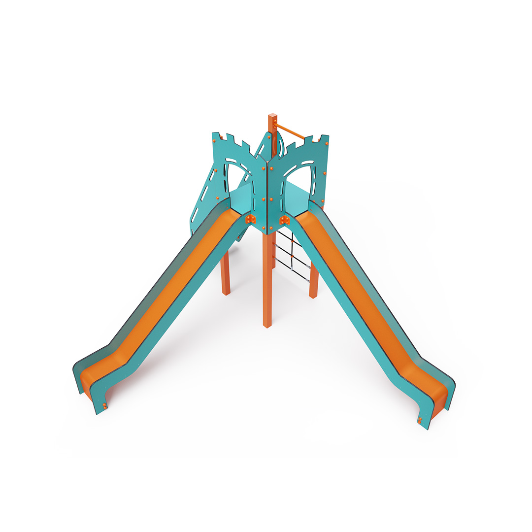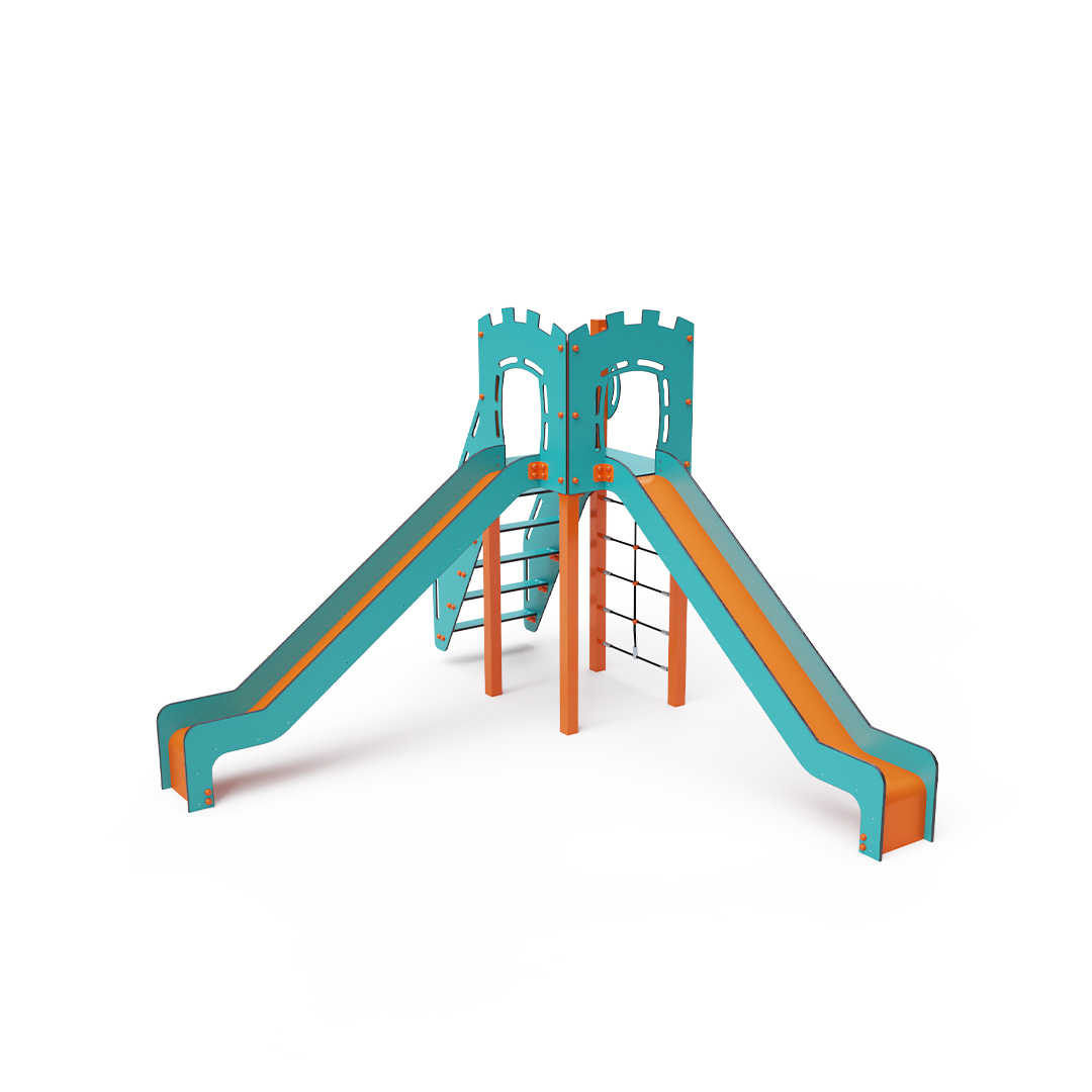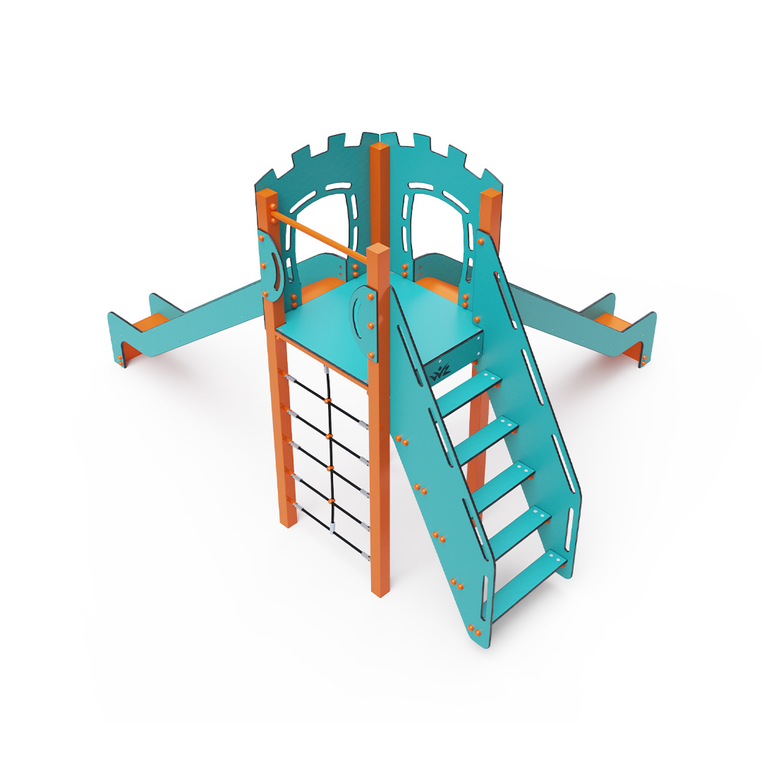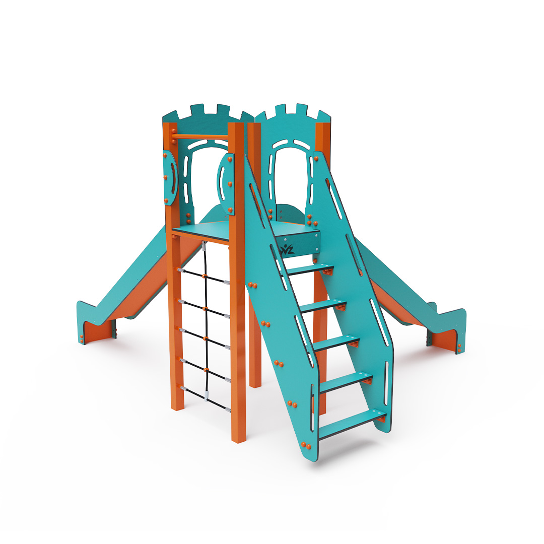 A single-tower combination set - a tower that children can climb using steps or a rope climbing wall and slide down using one of the two slides. The turquoise-orange design attracts children to play from a distance. The steel structure is resistant to weather conditions thanks to hot-dip galvanizing and coating with a durable powder paint. The HPL material used is chemically resistant, UV-resistant - colorfast, non-toxic, recyclable, and unbreakable. This prevents injuries to children from sharp edges or fragments. The ropes are made from polyester fibers wound around a central reinforcement. This rope construction increases its strength and resistance to mechanical stress. Polyester itself is resistant to microorganisms and weather conditions, dries quickly after rain, is colorfast, and has high strength. All connections are stainless steel and covered with plastic caps to increase durability and safety.
