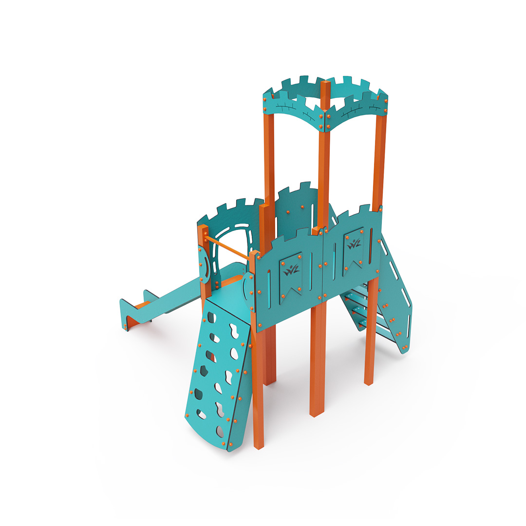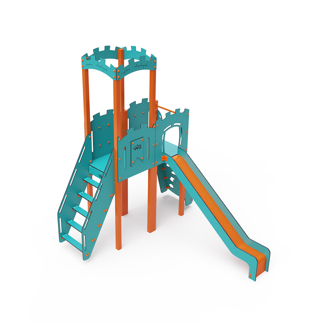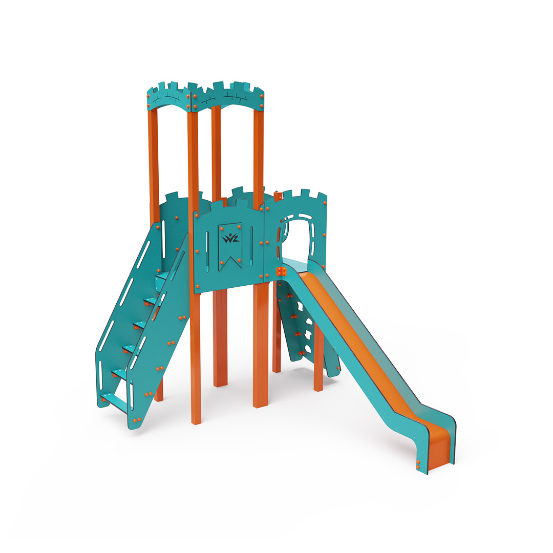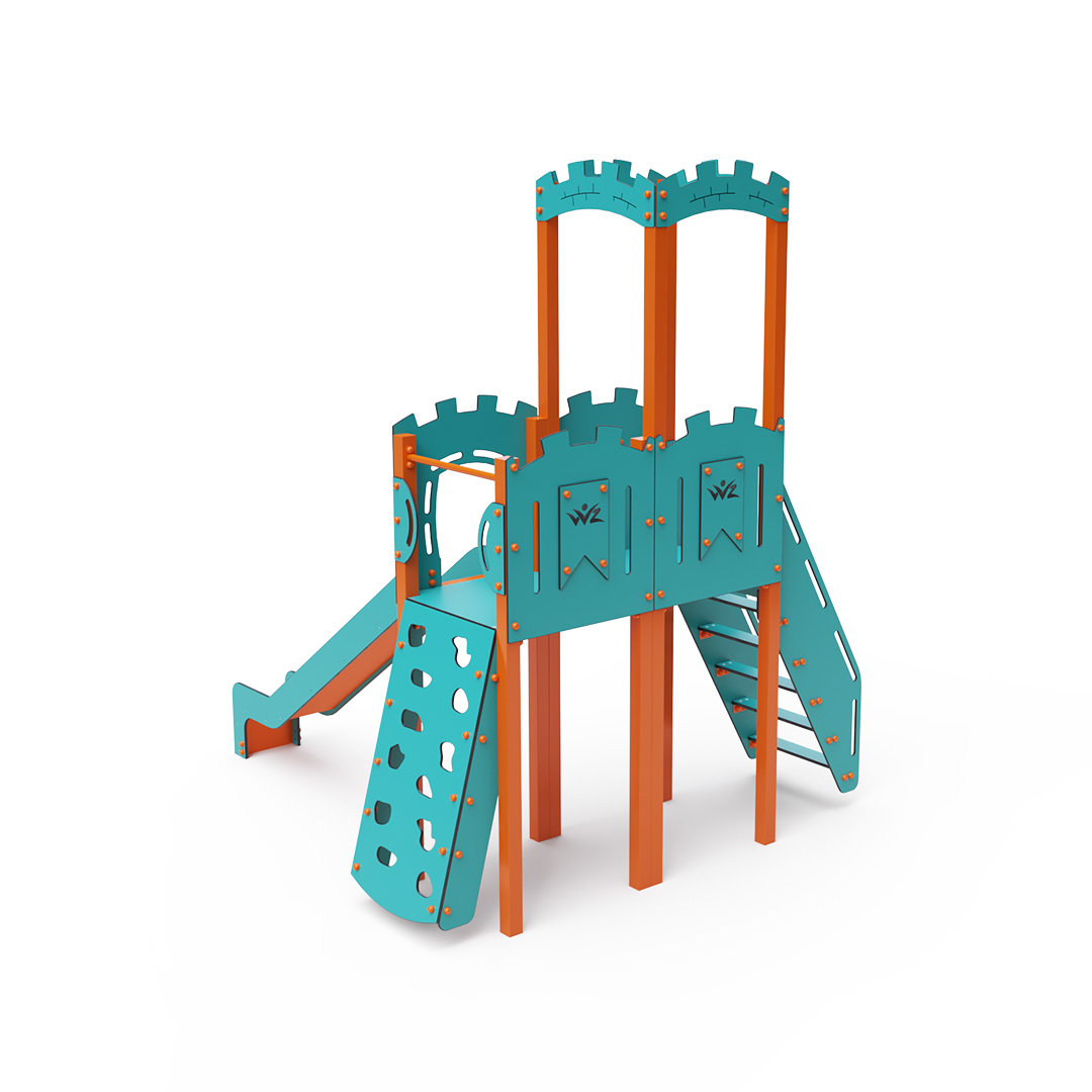 A double-tower combination set – featuring a tower with battlements and a low tower, where children can climb using stairs or a climbing wall with grips and slide down via a slide. The turquoise-orange design is inviting from a distance. The steel construction is weather-resistant due to hot-dip galvanizing and durable powder coating. The HPL material used is chemically resistant, UV-resistant – colorfast, non-toxic, recyclable, and unbreakable, ensuring there is no risk of injury to children from sharp edges or fragments. All joints are stainless steel and covered with plastic caps for increased durability and safety.