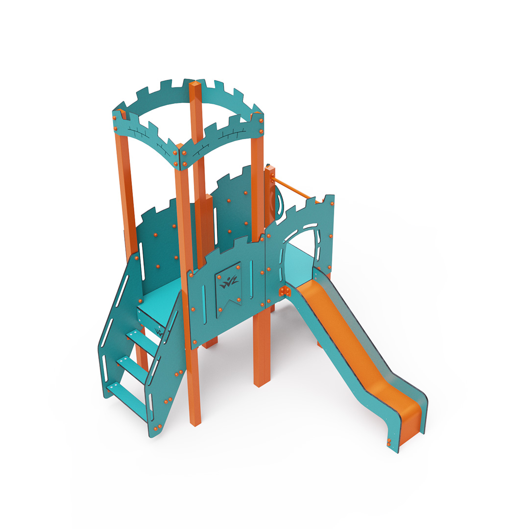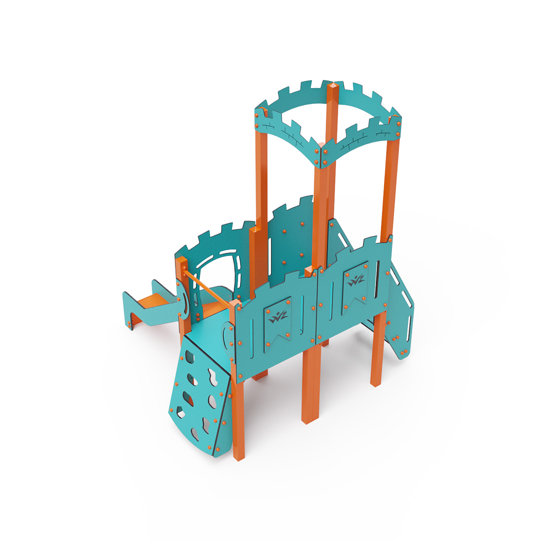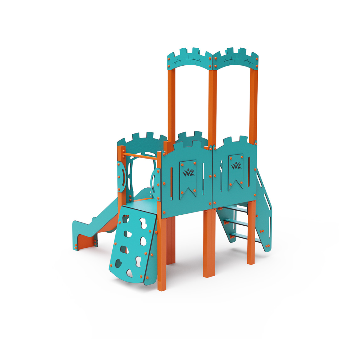 A double-tower combination set – featuring a tower with battlements and a low tower, where children can climb using stairs or a climbing wall with grips and slide down via a slide. The turquoise-orange design is inviting from a distance. The steel construction is weather-resistant due to hot-dip galvanizing and durable powder coating. The HPL material used is chemically resistant, UV-resistant – colorfast, non-toxic, recyclable, and unbreakable, ensuring there is no risk of injury to children from sharp edges or fragments. All joints are stainless steel and covered with plastic caps for increased durability and safety.