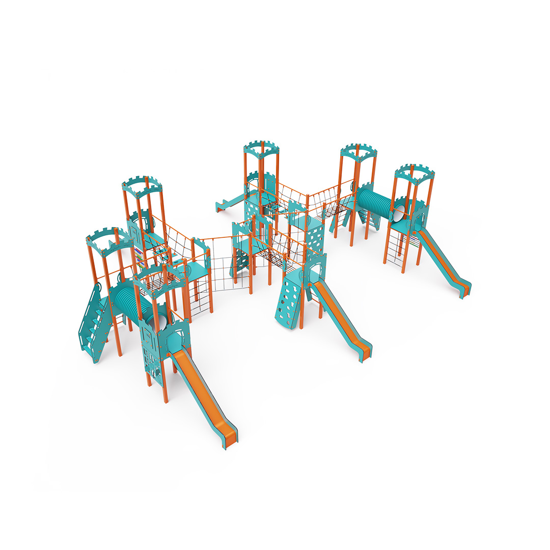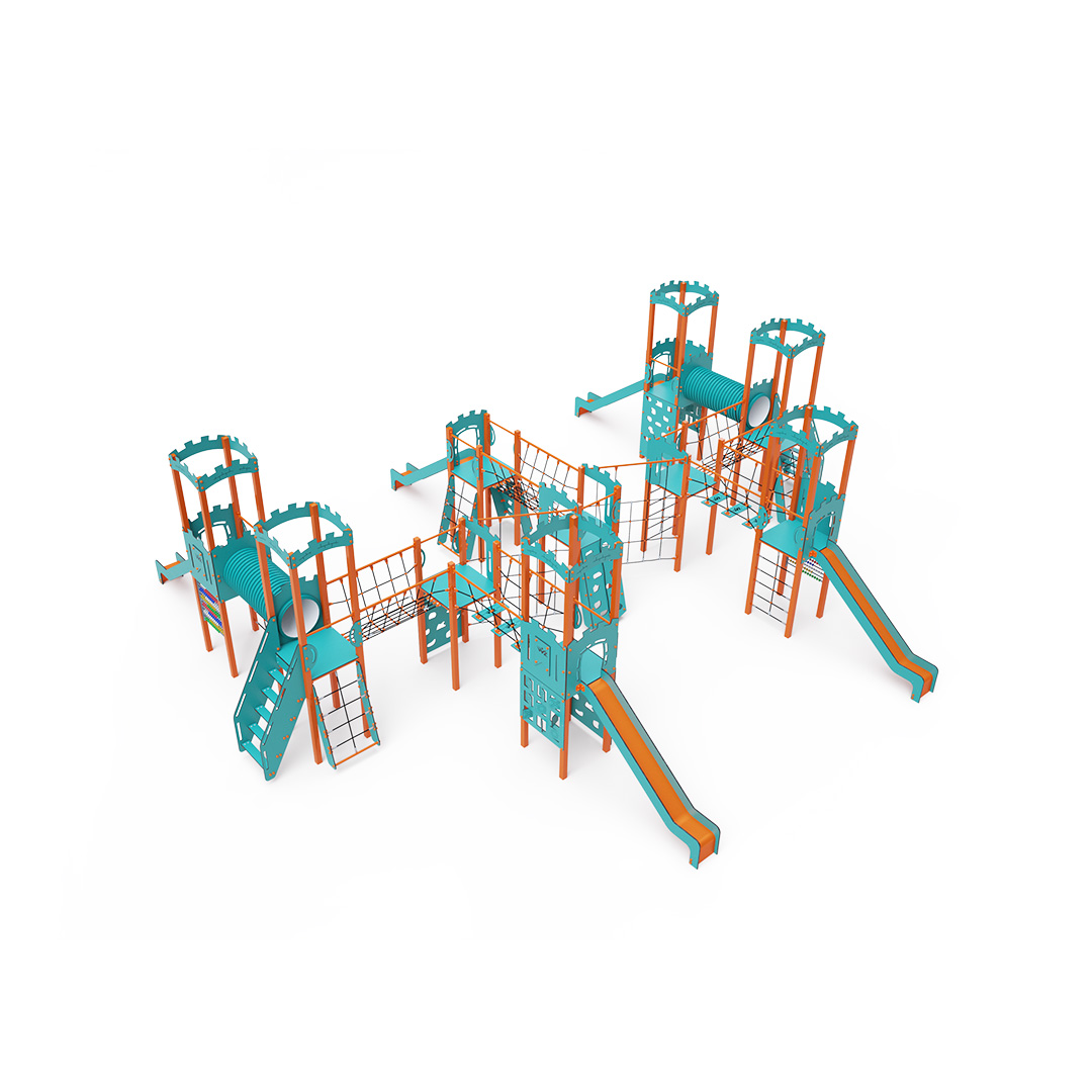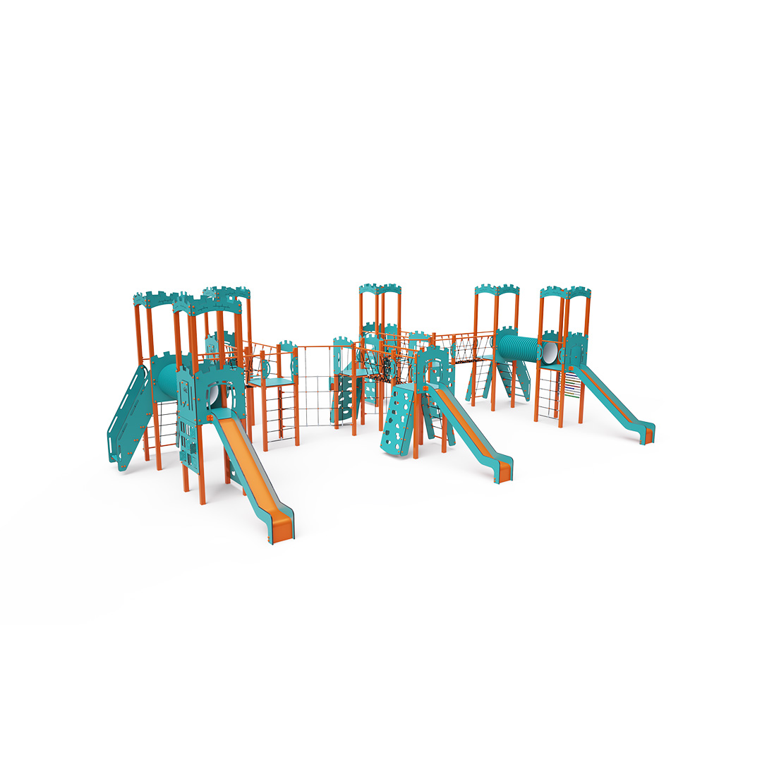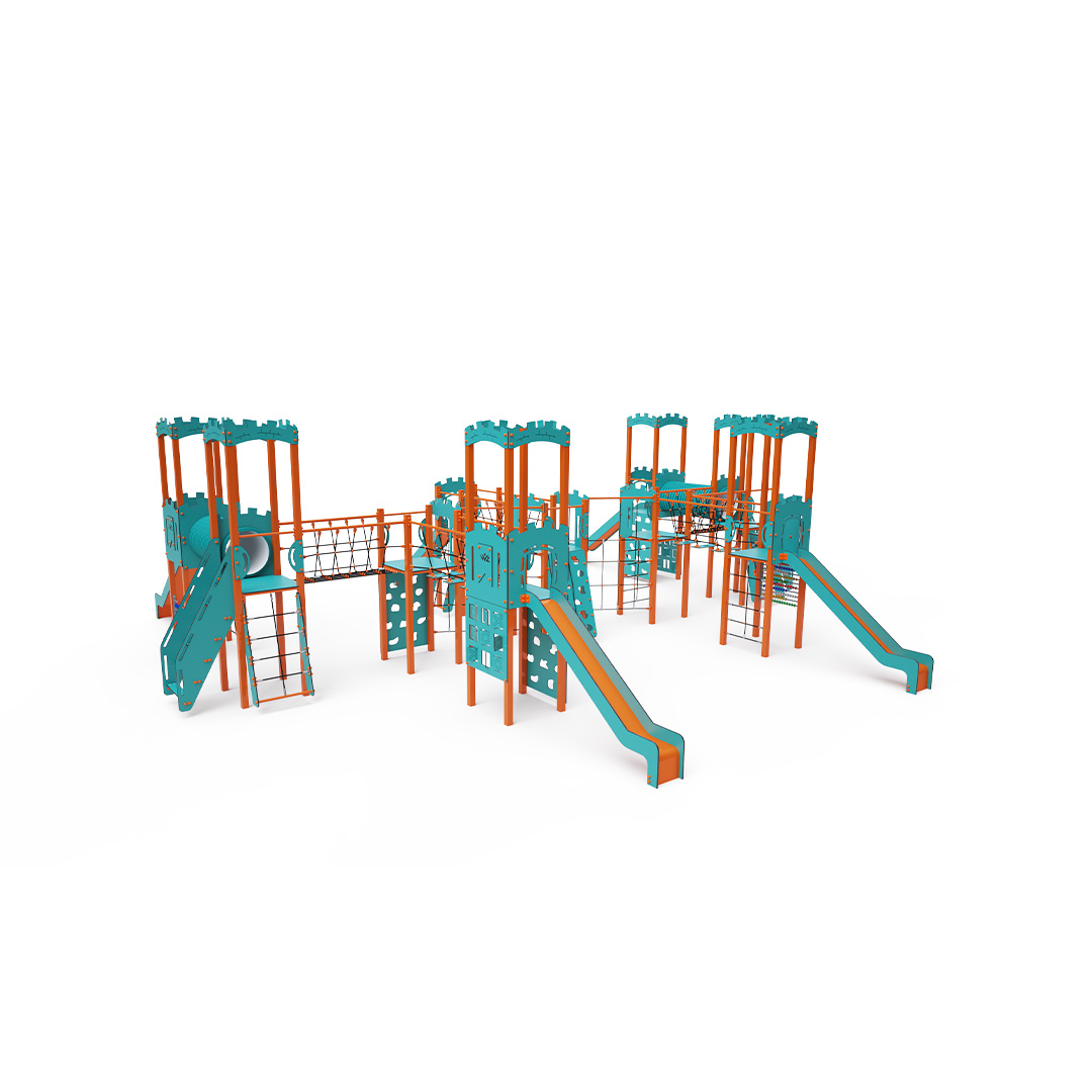 This ten-tower combination set features six towers with walls and four low towers interconnected by rope bridges, rope balance bridges, tunnels, and diagonal rope walls. The set includes steps, vertical climbing walls, slanted climbing walls, vertical rope nets, slanted rope nets, tic-tac-toe games, a counting frame, and five slides. The turquoise-orange design is attractive from a distance.The steel construction is weather-resistant due to hot-dip galvanizing and coating with durable powder paint. The HPL material used is chemically resistant, UV-resistant—colorfast, non-toxic, recyclable, and unbreakable. This design minimizes the risk of injury from sharp edges or fragments. The ropes are made from polyester fibers wrapped around a central core, which enhances their strength and resistance to mechanical stress. Polyester is resistant to microorganisms, weather conditions, dries quickly, maintains its color, and boasts high strength. All joints are made of stainless steel and covered with plastic caps to increase durability and safety.