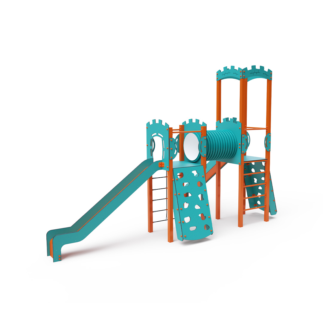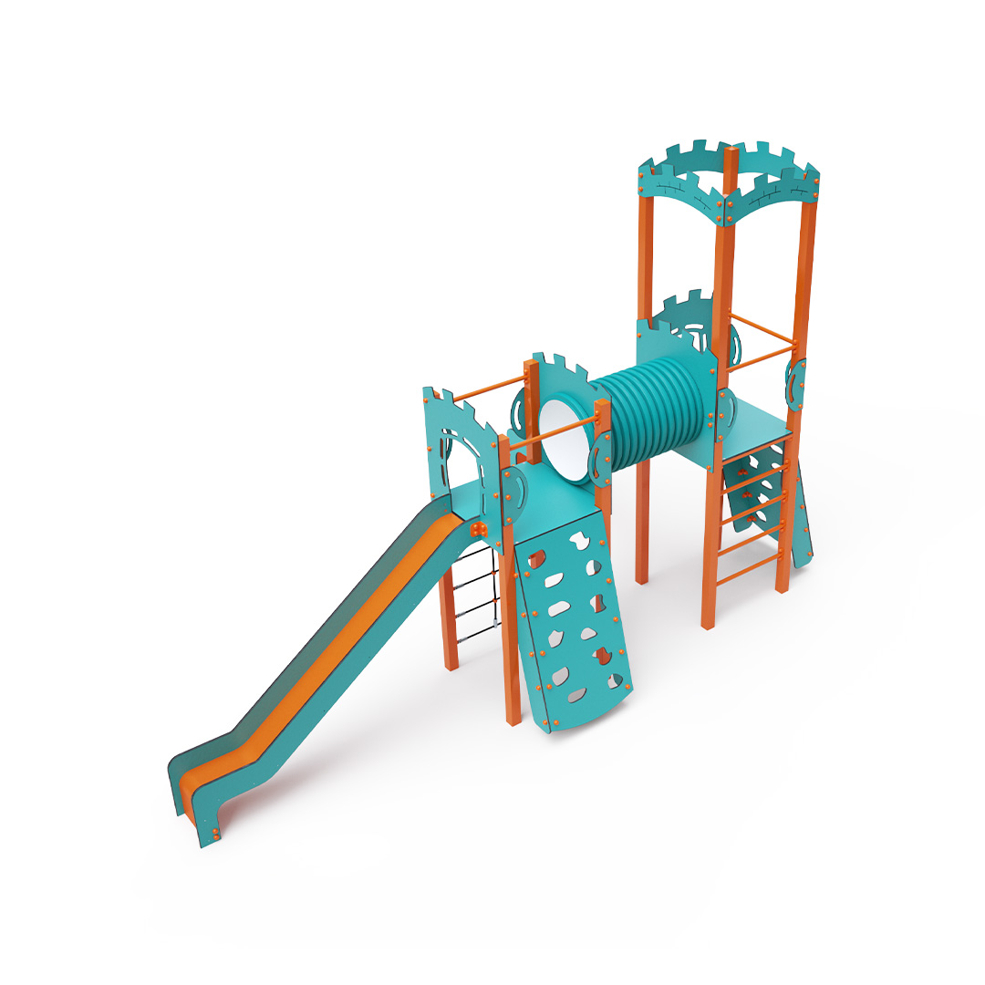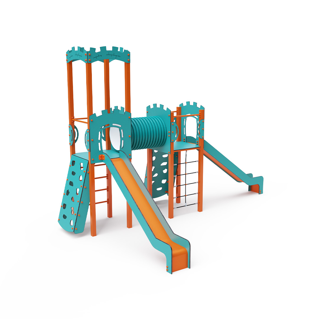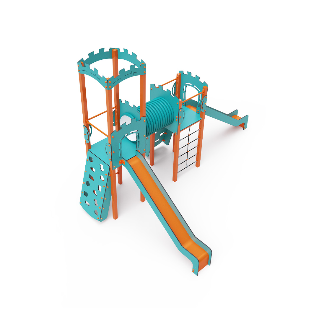 A double-tower combination set - two towers connected by a tunnel. Children can climb the set using one of two climbing walls with grips, a rope net, or a ladder, and slide down one of two slides. The turquoise-orange design attracts children to play from a distance. The steel structure is resistant to weather conditions due to hot-dip galvanizing and coating with a durable powder paint. The HPL material used is chemically resistant, UV-resistant - colorfast, non-toxic, recyclable, and unbreakable. This prevents injuries to children from sharp edges or fragments. The ropes are made from polyester fibers wrapped around a central core. This rope construction enhances its strength and resistance to mechanical stress. Polyester itself is resistant to microorganisms, weather conditions, dries quickly after rain, is colorfast, and has high strength. All joints are stainless steel and covered with plastic caps to increase durability and safety.
