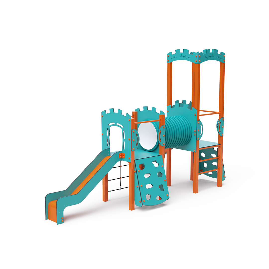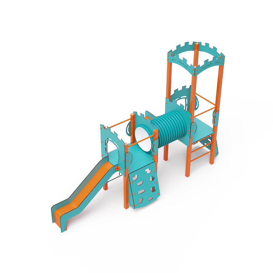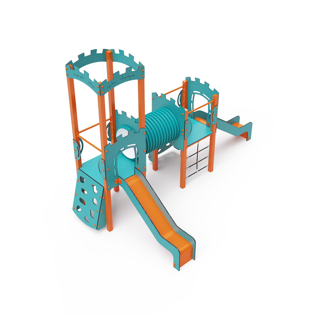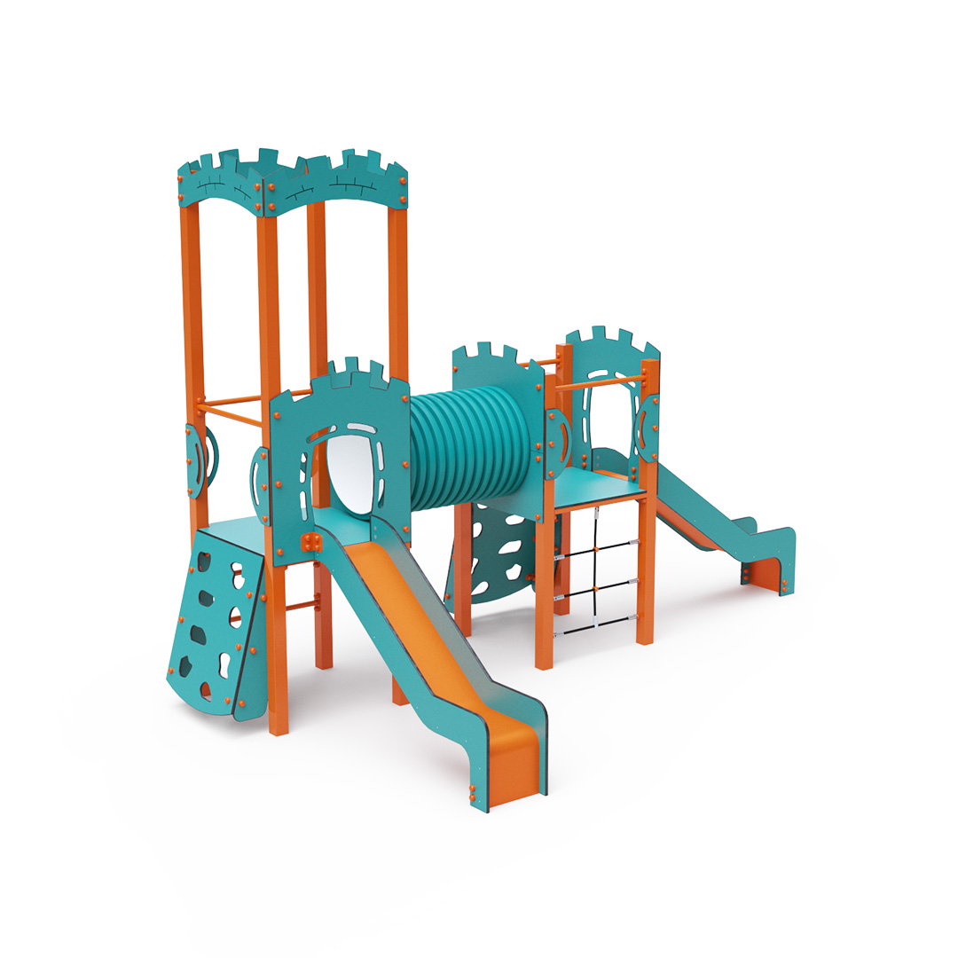 A double-tower combination set - two towers connected by a tunnel. Children can climb the set using one of two climbing walls with grips, a rope net, or a ladder, and slide down one of two slides. The turquoise-orange design attracts children to play from a distance. The steel structure is resistant to weather conditions due to hot-dip galvanizing and coating with a durable powder paint. The HPL material used is chemically resistant, UV-resistant - colorfast, non-toxic, recyclable, and unbreakable. This prevents injuries to children from sharp edges or fragments. The ropes are made from polyester fibers wrapped around a central core. This rope construction enhances its strength and resistance to mechanical stress. Polyester itself is resistant to microorganisms, weather conditions, dries quickly after rain, is colorfast, and has high strength. All joints are stainless steel and covered with plastic caps to increase durability and safety.