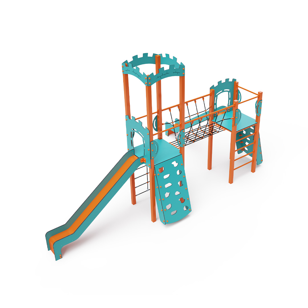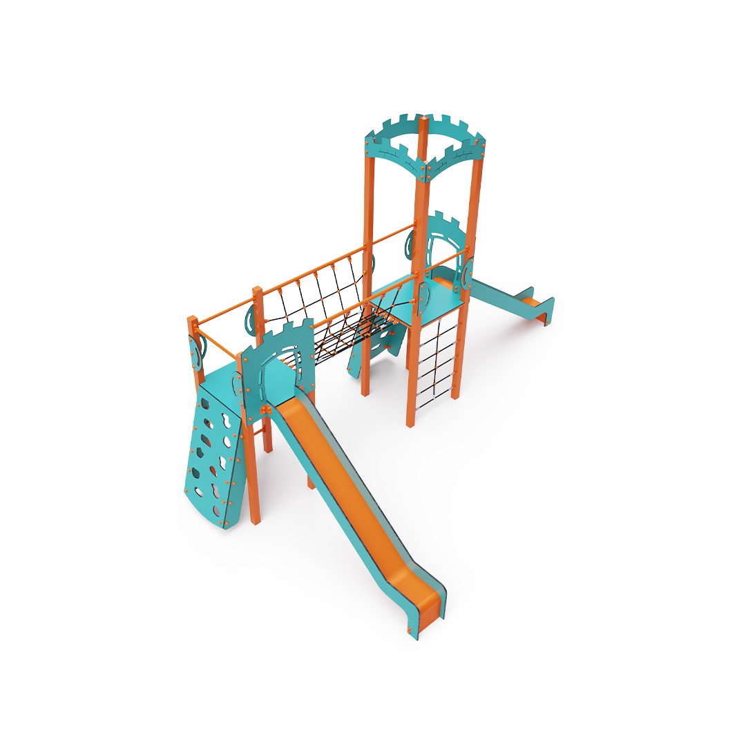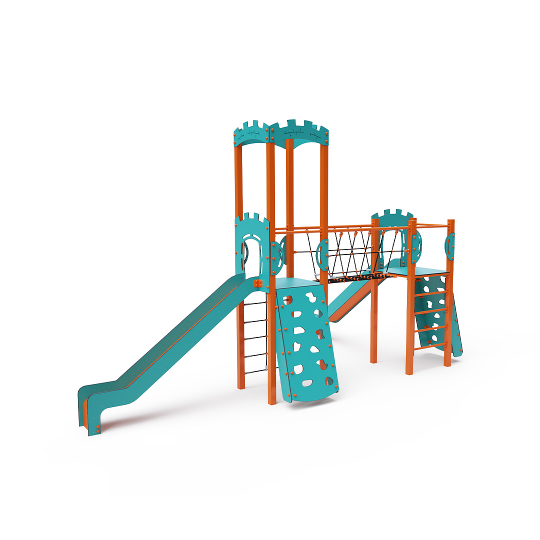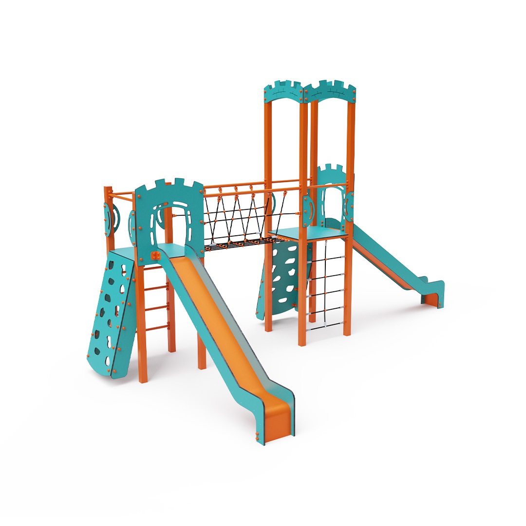A double tower combination set - two towers connected by a rope bridge. Children can climb the set using one of two climbing walls with handholds, a rope net, or a ladder, and slide down one of two slides. The turquoise-orange design attracts children to play from a distance. The steel structure is weather-resistant due to hot-dip galvanizing and coating with durable powder paint. The HPL material used is chemically resistant, UV-resistant - colorfast, non-toxic, recyclable, and unbreakable. This prevents injuries from sharp edges or fragments. The ropes are made from polyester fibers wrapped around a central core. This construction enhances the rope’s strength and resistance to mechanical stress. The polyester itself is resistant to microorganisms, weather conditions, dries quickly after rain, is colorfast, and has high strength. All joints are stainless steel and covered with plastic caps to increase durability and safety.