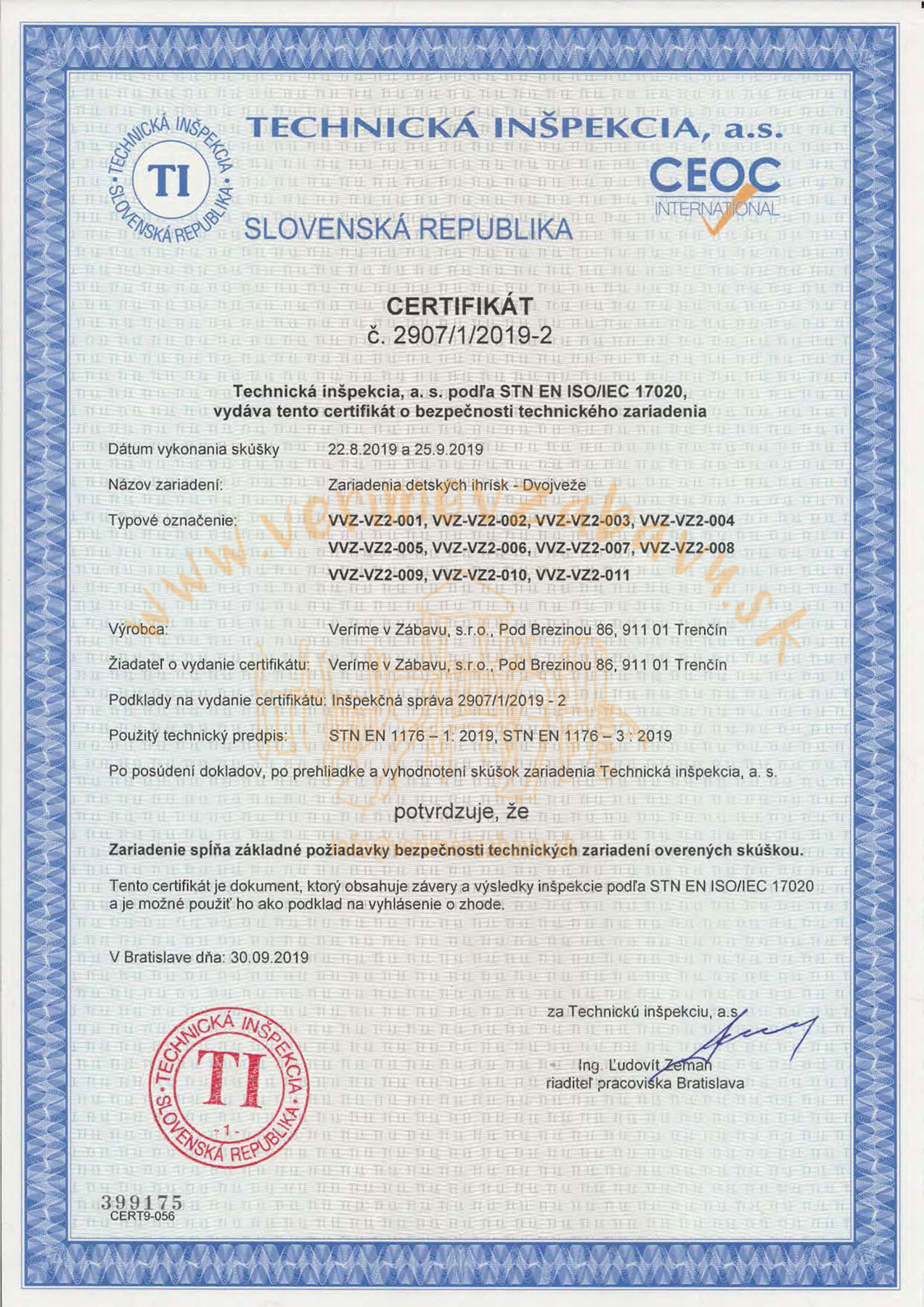 The combination tower set VVZ-VZ2-006 is certified according to STN EN 1176.