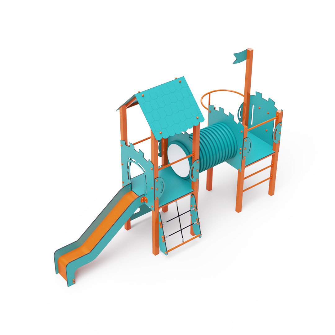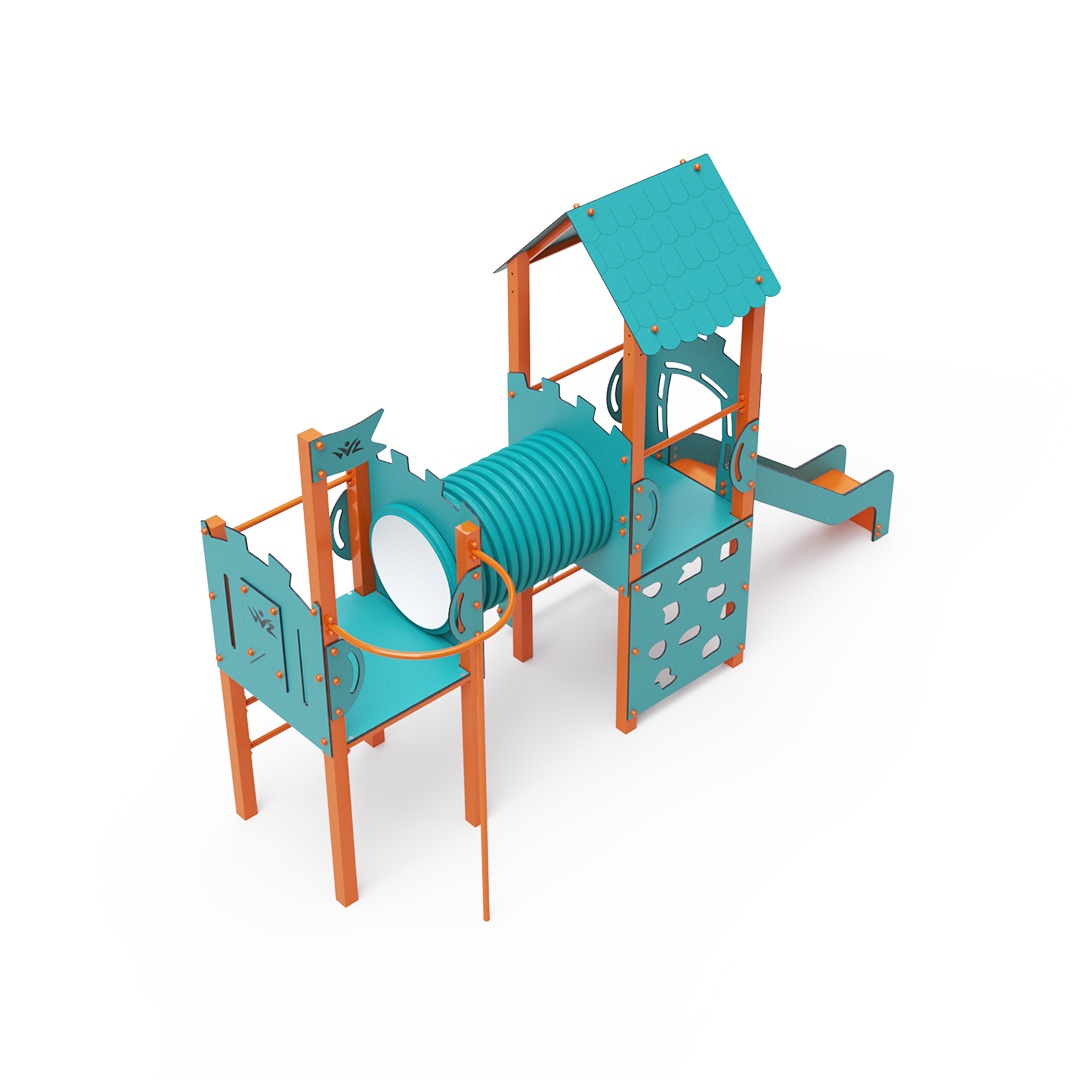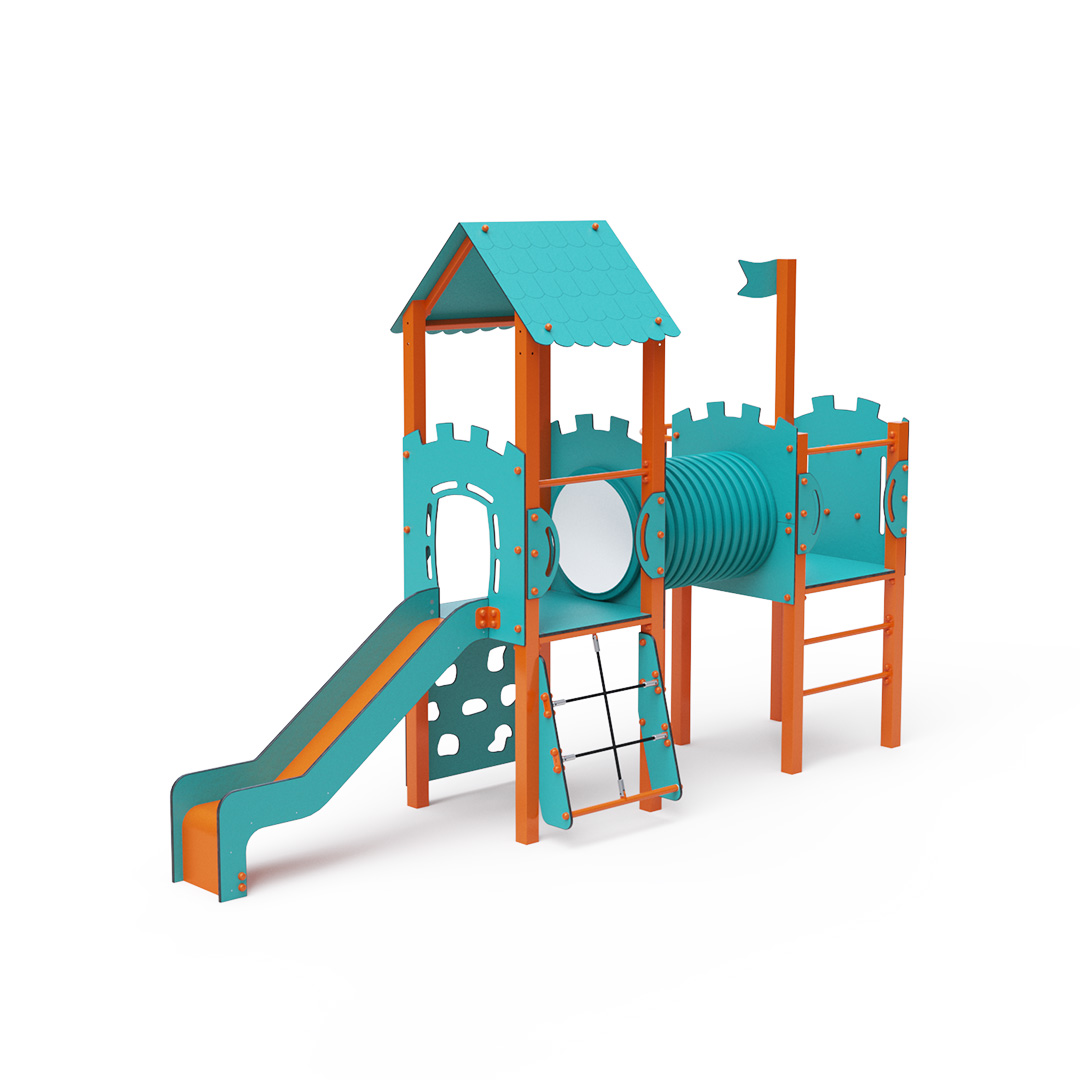 A double tower combination set - one tower with a roof and another low tower with a flag-shaped shade, connected by a tunnel. Children can climb the set using a climbing wall with handholds, an arched rope net, or a ladder and slide down a slide or a fireman's pole. The turquoise-orange design attracts children to play from a distance. The steel structure is weather-resistant due to hot-dip galvanizing and coating with durable powder paint. The HPL material used is chemically resistant, UV-resistant - colorfast, non-toxic, recyclable, and unbreakable, preventing injuries from sharp edges or fragments. The ropes are made from polyester fibers wound around a central reinforcement, increasing the rope's strength and resistance to mechanical stress. Polyester itself is resistant to microorganisms, weather conditions, dries quickly after rain, is colorfast, and has high strength. All joints are stainless steel and covered with plastic caps to increase durability and safety.