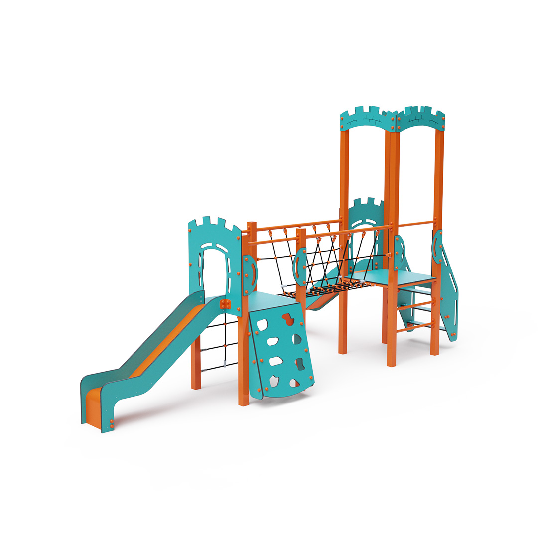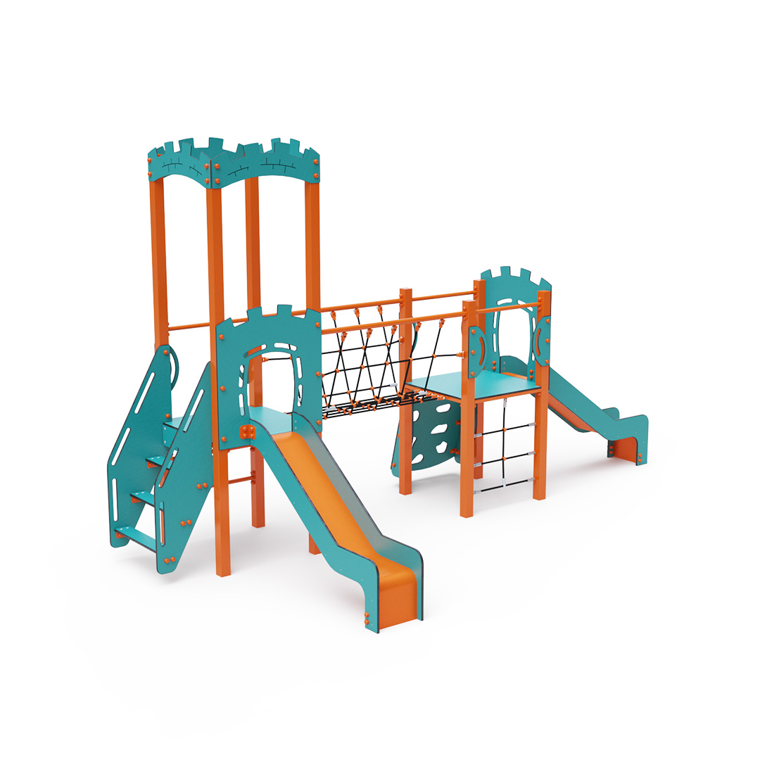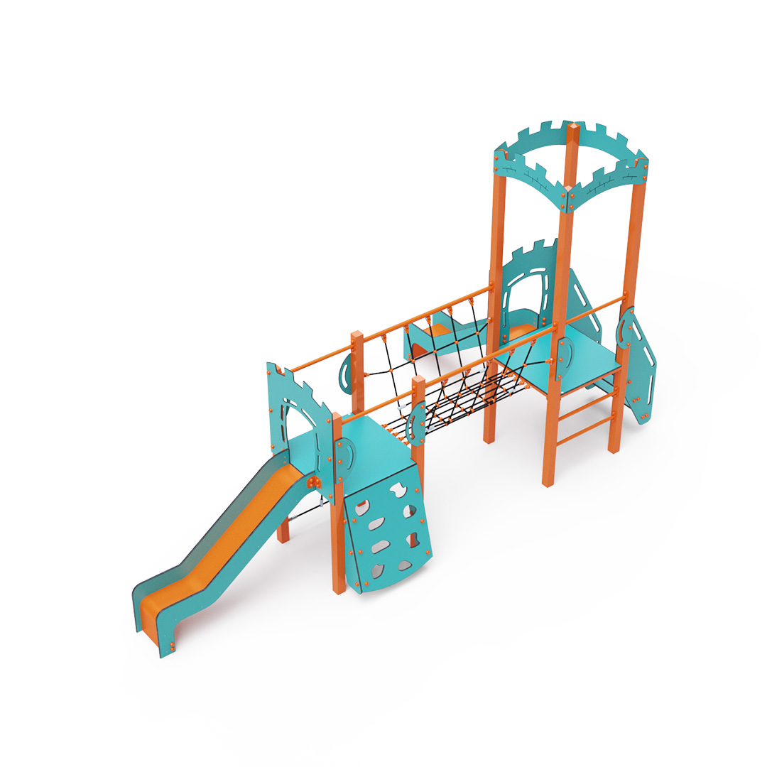 Double tower combination set - two towers connected by a rope balance bridge. Children can climb the structure using a climbing wall with holds, a ladder, a rope net, or steps, and slide down one of the two slides. The turquoise-orange design attracts children to play from a distance. The steel construction is weather-resistant due to hot-dip galvanization and coating with durable powder paint. The used HPL material is chemically resistant, UV-resistant - colorfast, non-toxic, recyclable, and unbreakable. This prevents children from being injured by sharp edges or fragments. The ropes are made of polyester fibers wound around a central core. This rope construction increases its strength and resistance to mechanical stress. Polyester itself is resistant to microorganisms, weather-resistant, dries quickly after rain, is colorfast, and has high strength. All joints are stainless steel and covered with plastic caps to increase durability and safety.