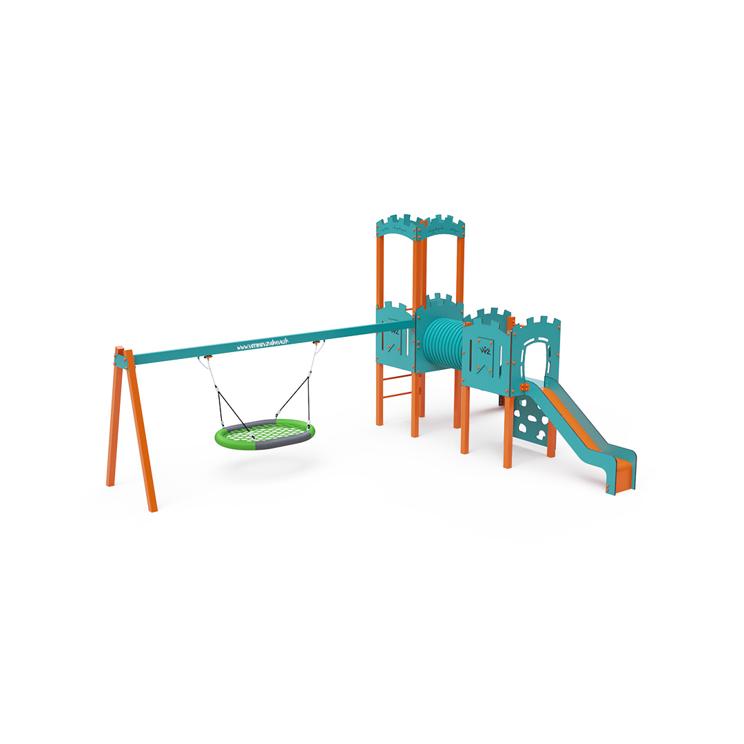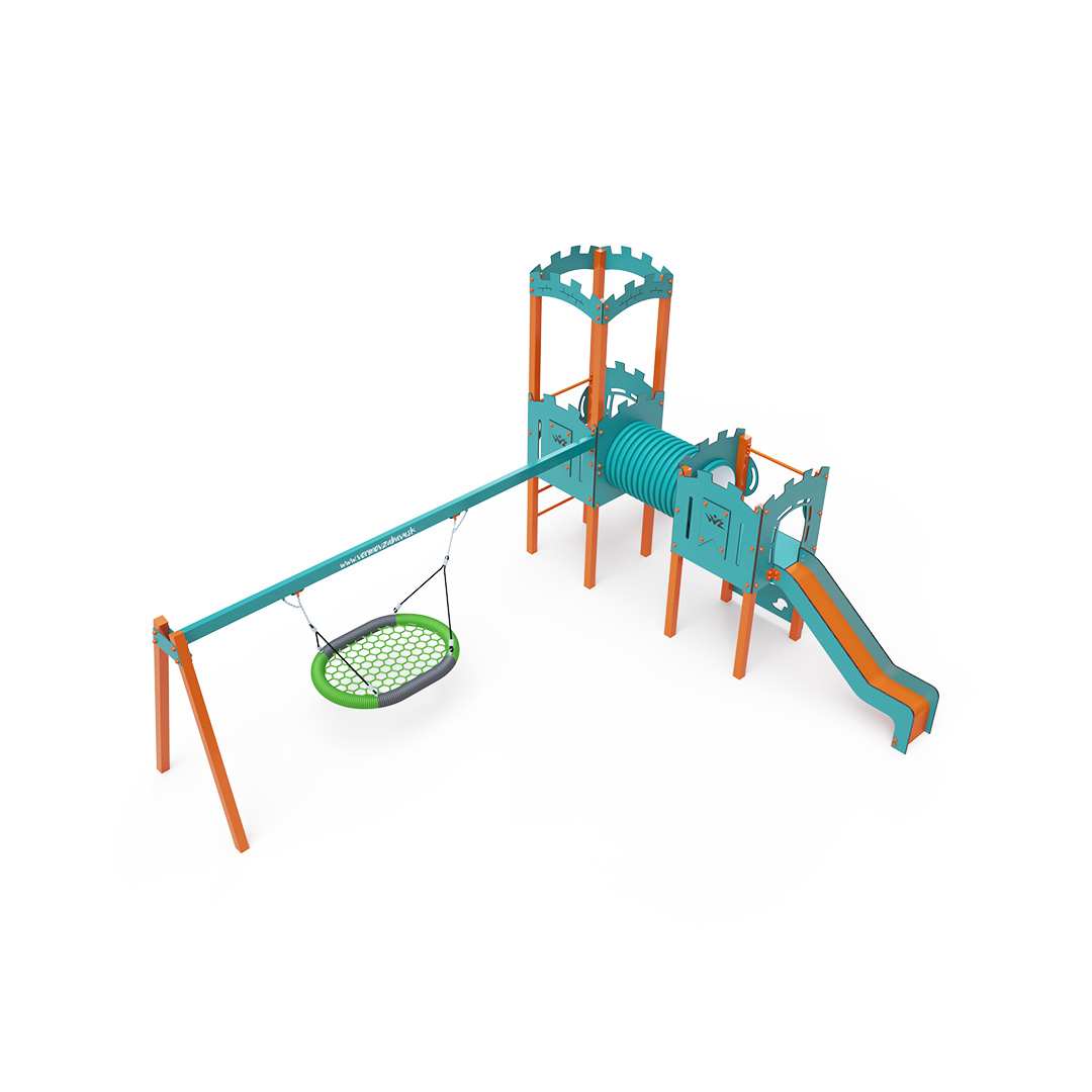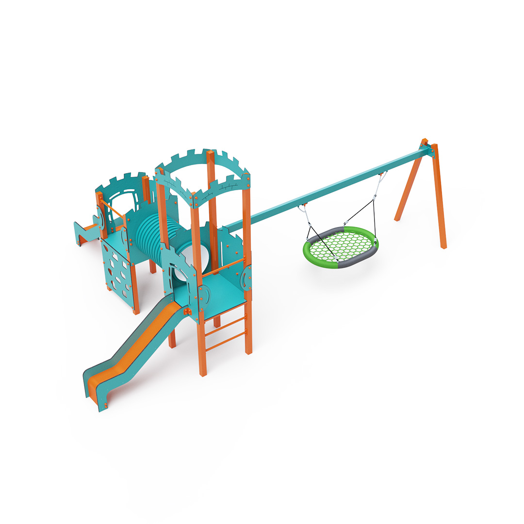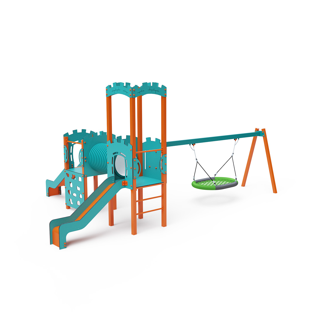 The double tower combination set features one tower with battlements and a lower tower connected by a tunnel. Children can climb the structure using a climbing wall with holds or a ladder and slide down one of the two slides. The play set includes a swing with a nest seat. The turquoise-orange design attracts children to play from a distance. The steel construction is weather-resistant due to hot-dip galvanization and coating with durable powder paint. The HPL material used is chemically resistant, UV-resistant - colorfast, non-toxic, recyclable, and unbreakable. This prevents injuries from sharp edges or fragments. All joints are stainless steel and covered with plastic caps to increase durability and safety.