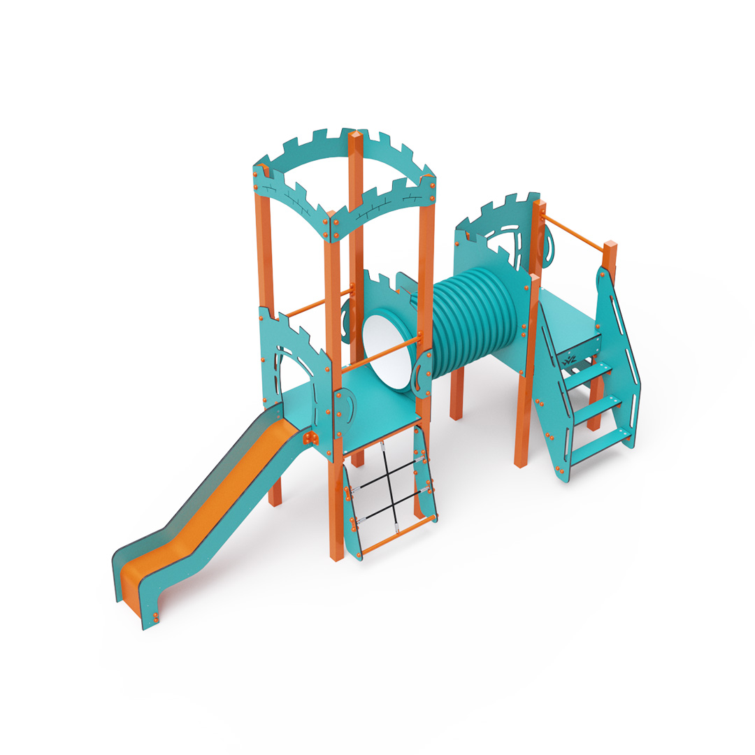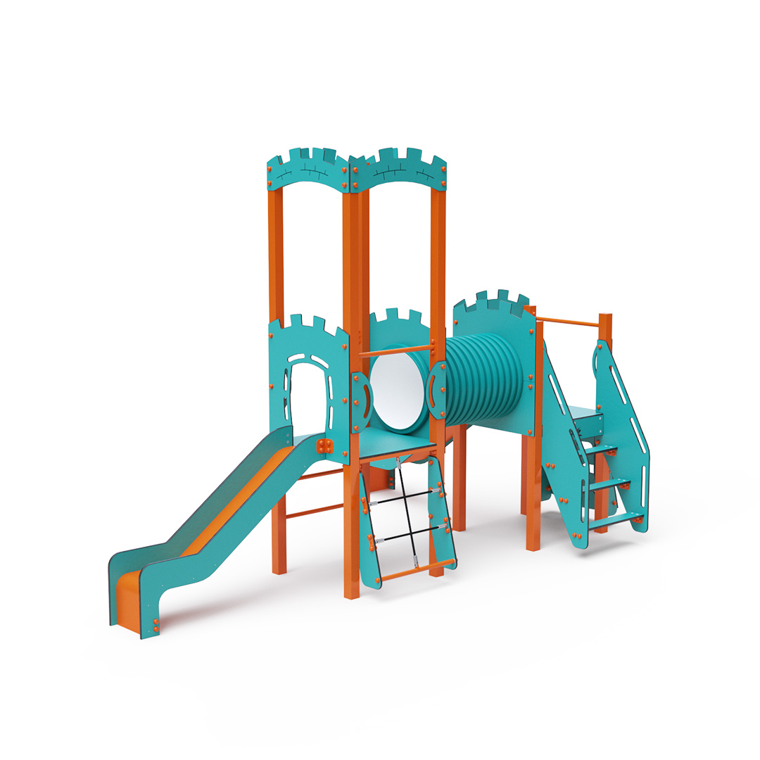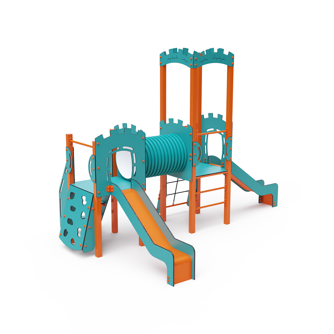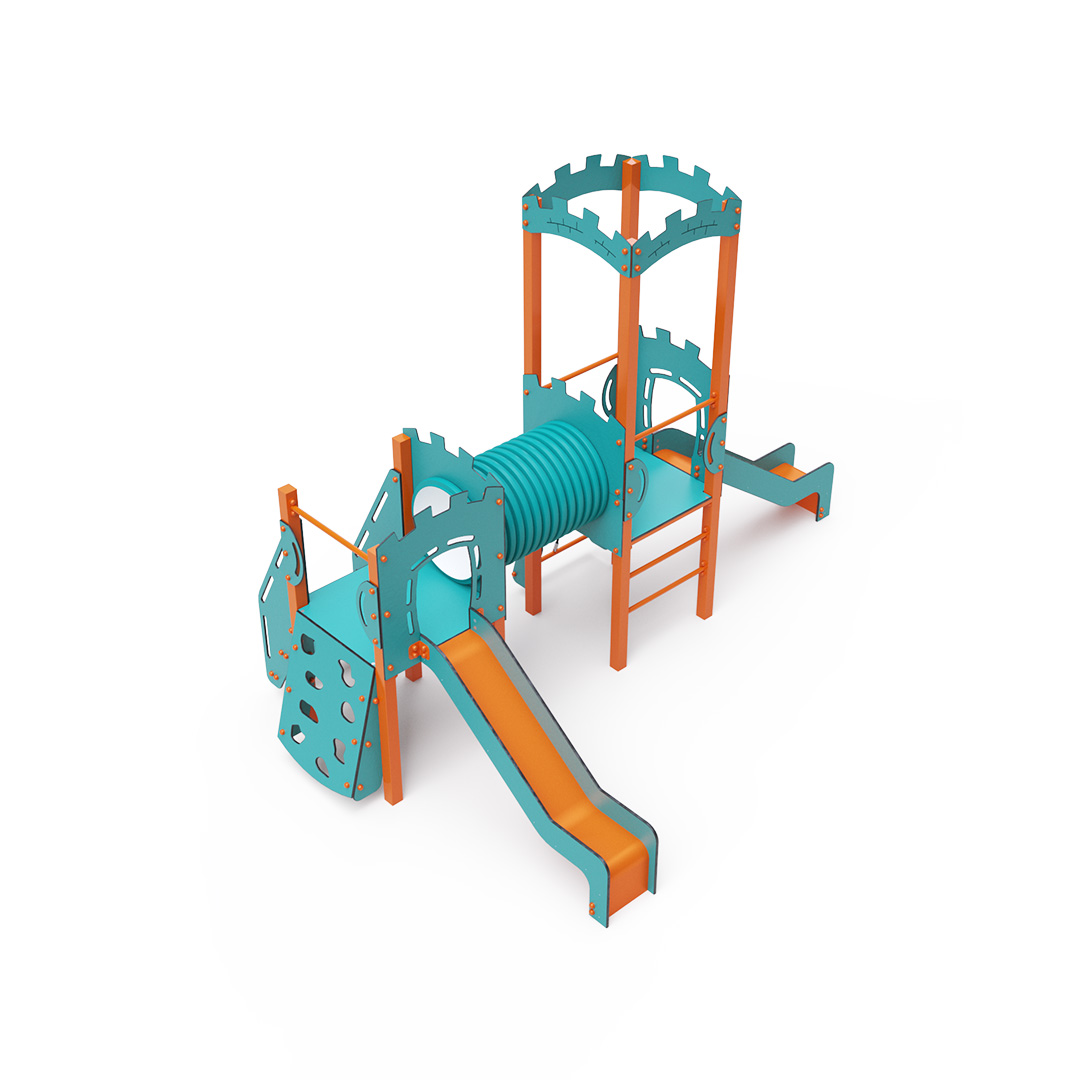 Double tower combination set - two towers connected by a tunnel. Children can climb the structure using a climbing wall with holds, a ladder, steps, or an arched rope net and slide down one of the two slides. The turquoise-orange design attracts children to play from a distance. The steel construction is weather-resistant due to hot-dip galvanization and coating with durable powder paint. The used HPL material is chemically resistant, UV-resistant - colorfast, non-toxic, recyclable, and unbreakable. This prevents children from being injured by sharp edges or fragments. The ropes are made of polyester fibers wound around a central core. This rope construction increases its strength and resistance to mechanical stress. Polyester itself is resistant to microorganisms, weather-resistant, dries quickly, is colorfast, and has high strength. All joints are stainless steel and covered with plastic caps to increase durability and safety.