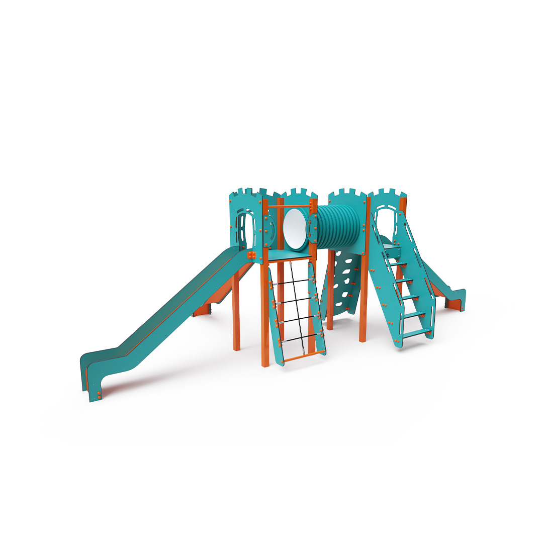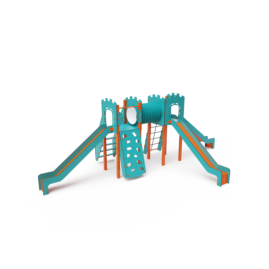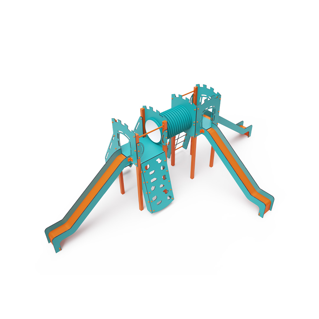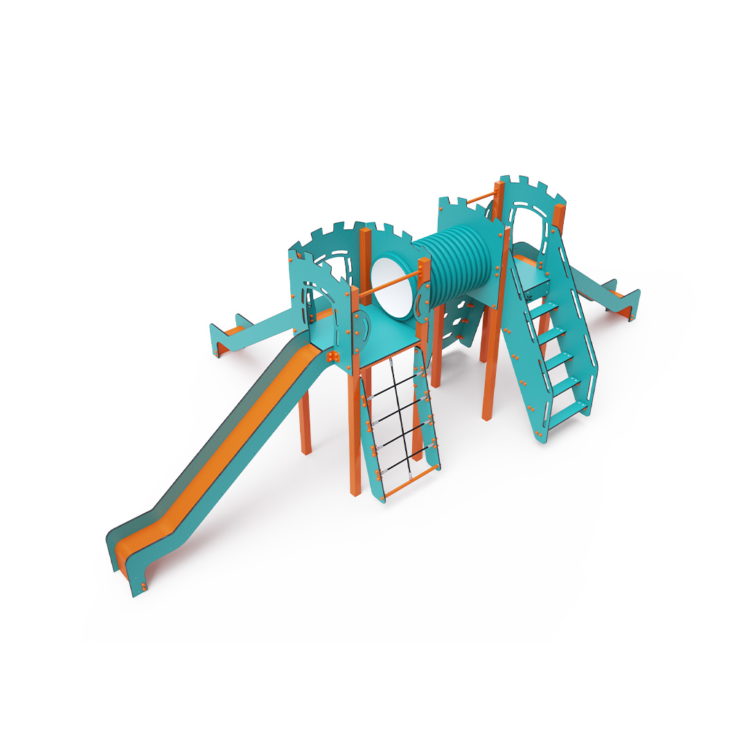 The double tower combination set features two towers connected by a tunnel. Children can climb the structure using stairs, a climbing wall with holds, or an arched rope net, and slide down one of the three slides. The turquoise-orange design is inviting from a distance. The steel construction is weather-resistant due to hot-dip galvanization and coating with durable powder paint. The HPL plastic used is chemically resistant, UV-resistant - colorfast, non-toxic, recyclable, and unbreakable, preventing injuries from sharp edges or fragments. The ropes are made from polyester fibers wound around a central core, enhancing their strength and resistance to mechanical stress. The polyester itself is resistant to microorganisms and weather conditions, dries quickly after rain, retains color, and is highly durable. All joints are stainless steel and covered with plastic caps to increase durability and safety.