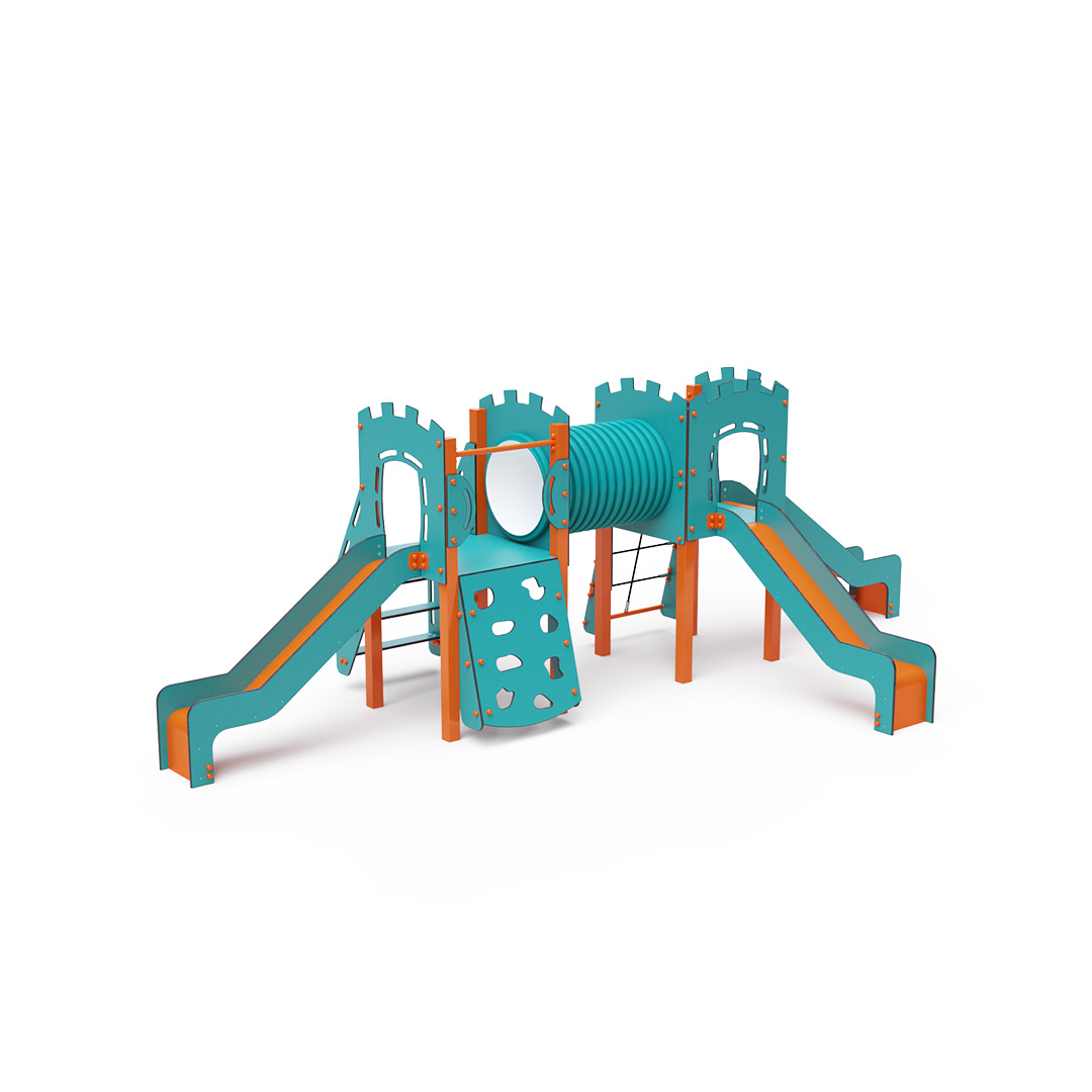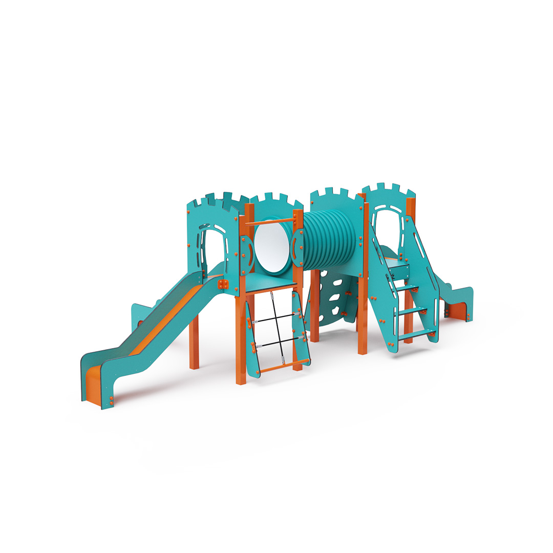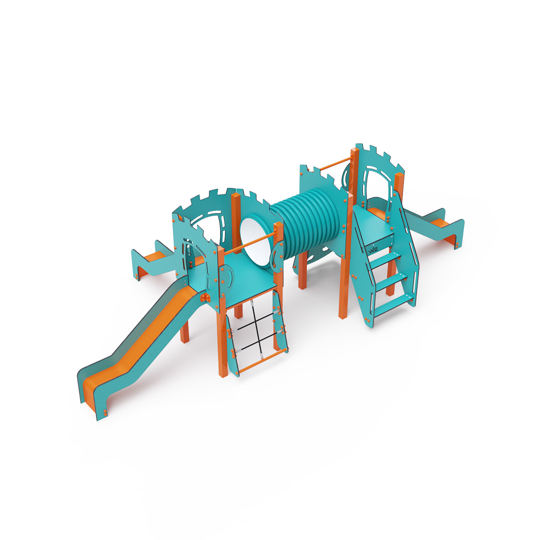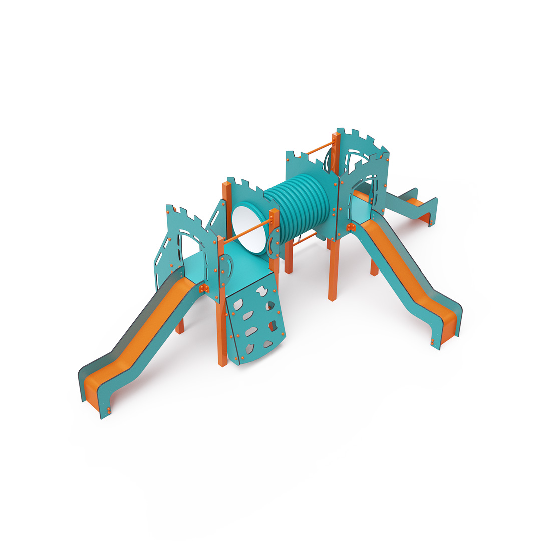 The double tower combination set features two towers connected by a tunnel. Children can climb the structure using stairs, a climbing wall with holds, or an arched rope net, and slide down one of the three slides. The turquoise-orange design is inviting from a distance. The steel construction is weather-resistant due to hot-dip galvanization and coating with durable powder paint. The HPL plastic used is chemically resistant, UV-resistant - colorfast, non-toxic, recyclable, and unbreakable, preventing injuries from sharp edges or fragments. The ropes are made from polyester fibers wound around a central core, enhancing their strength and resistance to mechanical stress. The polyester itself is resistant to microorganisms and weather conditions, dries quickly after rain, retains color, and is highly durable. All joints are stainless steel and covered with plastic caps to increase durability and safety.