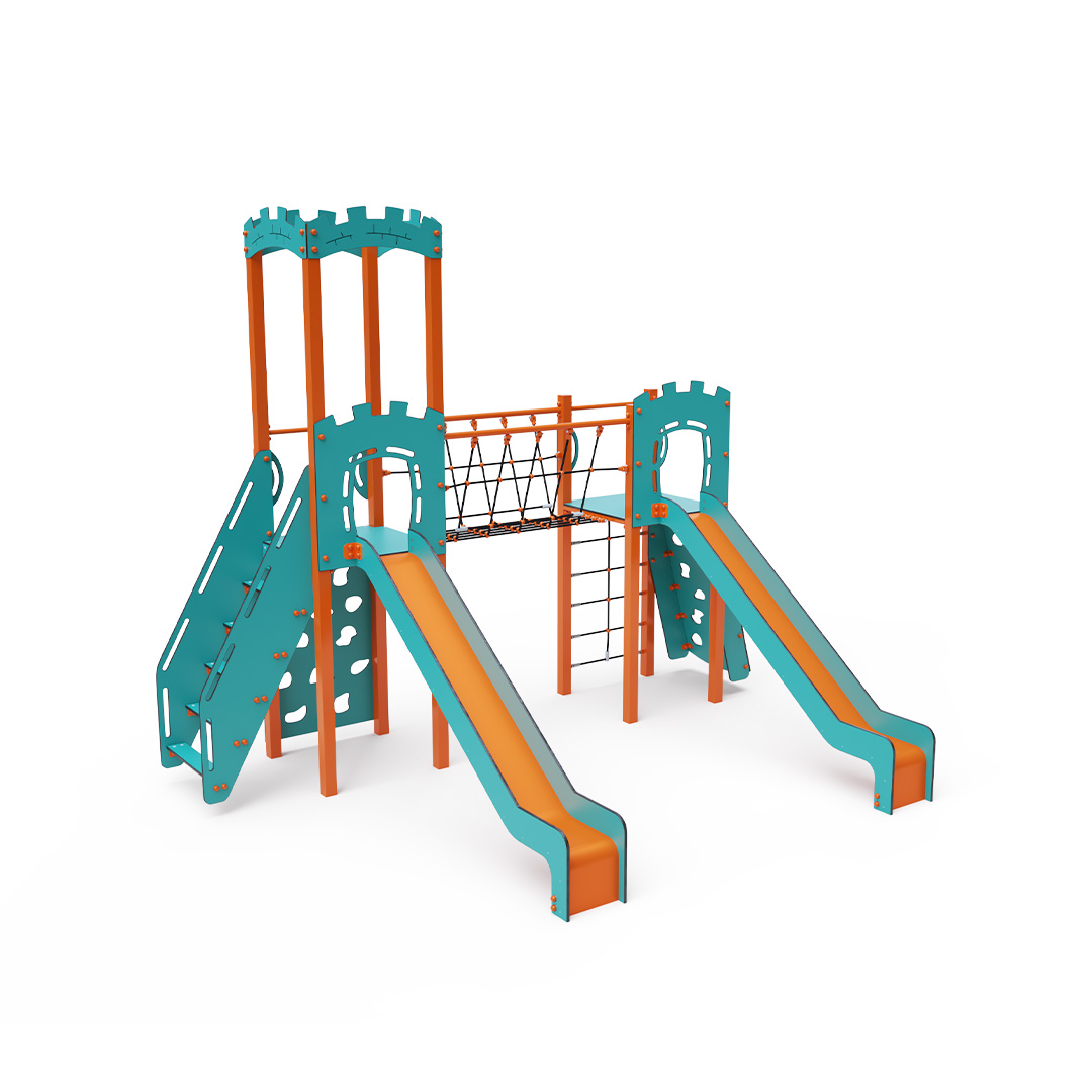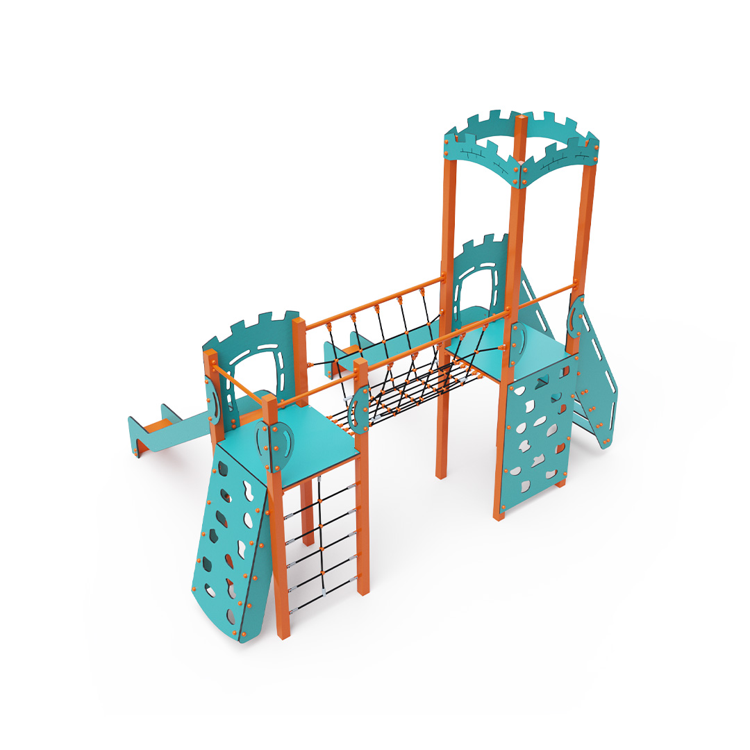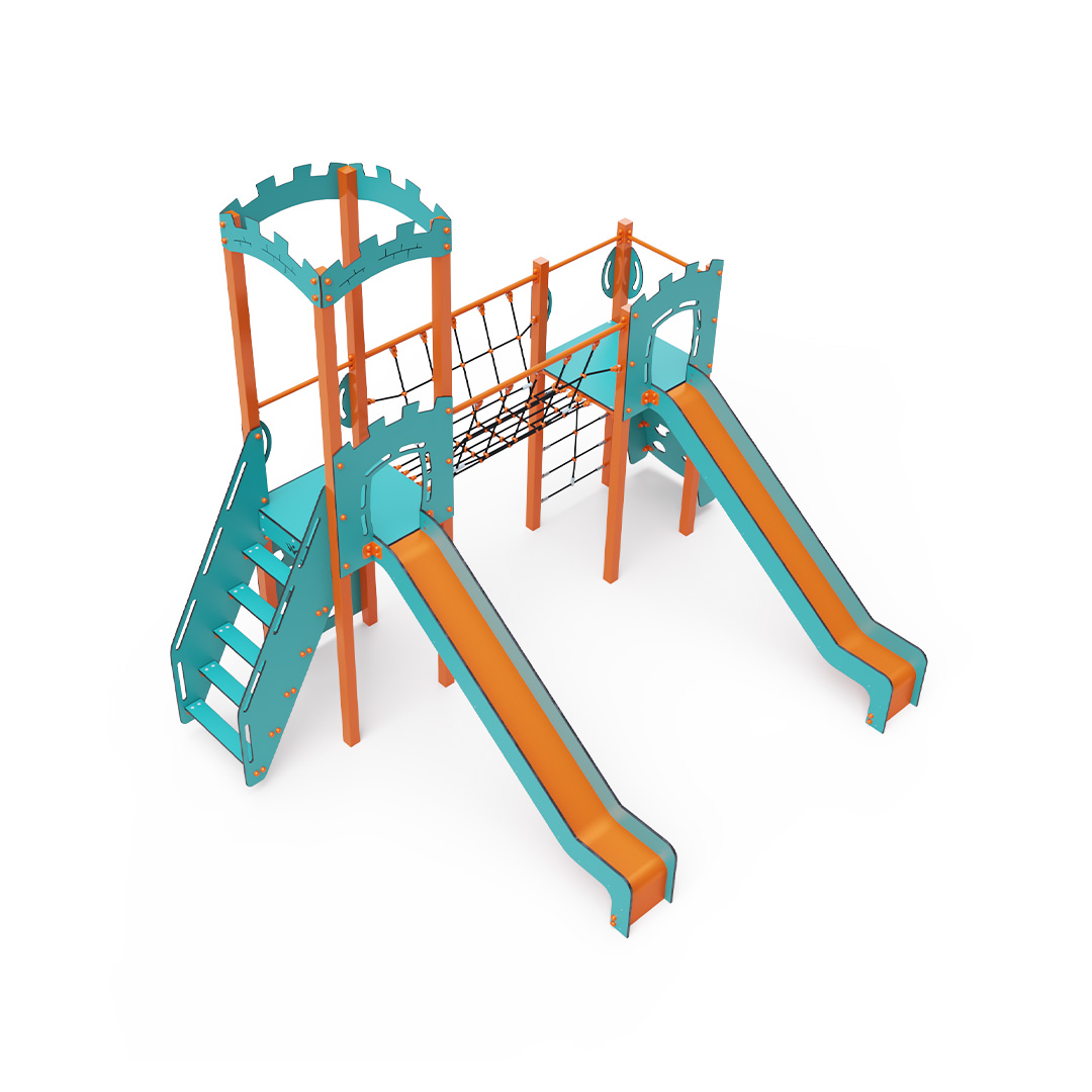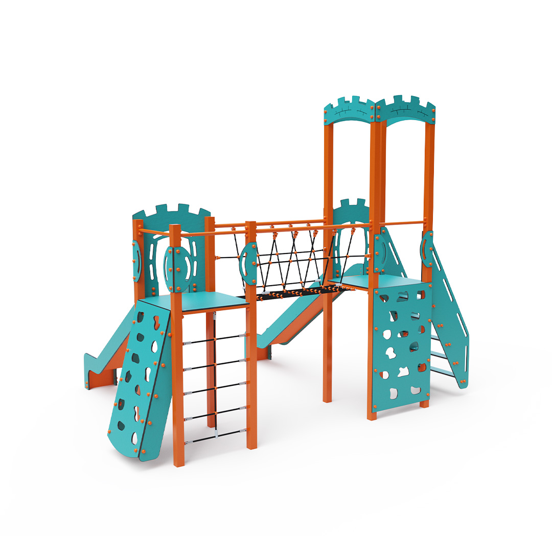 The double tower combination set features two towers connected by a rope balance bridge. Children can climb the structure using stairs, an inclined or vertical climbing wall with handholds, or a rope net, and they can slide down one of the two slides. The turquoise-orange design is appealing from a distance. The steel construction is weather-resistant due to hot-dip galvanizing and coating with a durable powder paint. The HPL material used is chemically resistant, UV-resistant - colorfast, non-toxic, recyclable, and unbreakable. This prevents injuries from sharp edges or fragments. The ropes are made from polyester fibers wound around a central core, which increases their strength and resistance to mechanical stress. The polyester itself is resistant to microorganisms and weather conditions, dries quickly after rain, retains its color, and has high strength. All joints are made of stainless steel and covered with plastic caps to enhance durability and safety.
