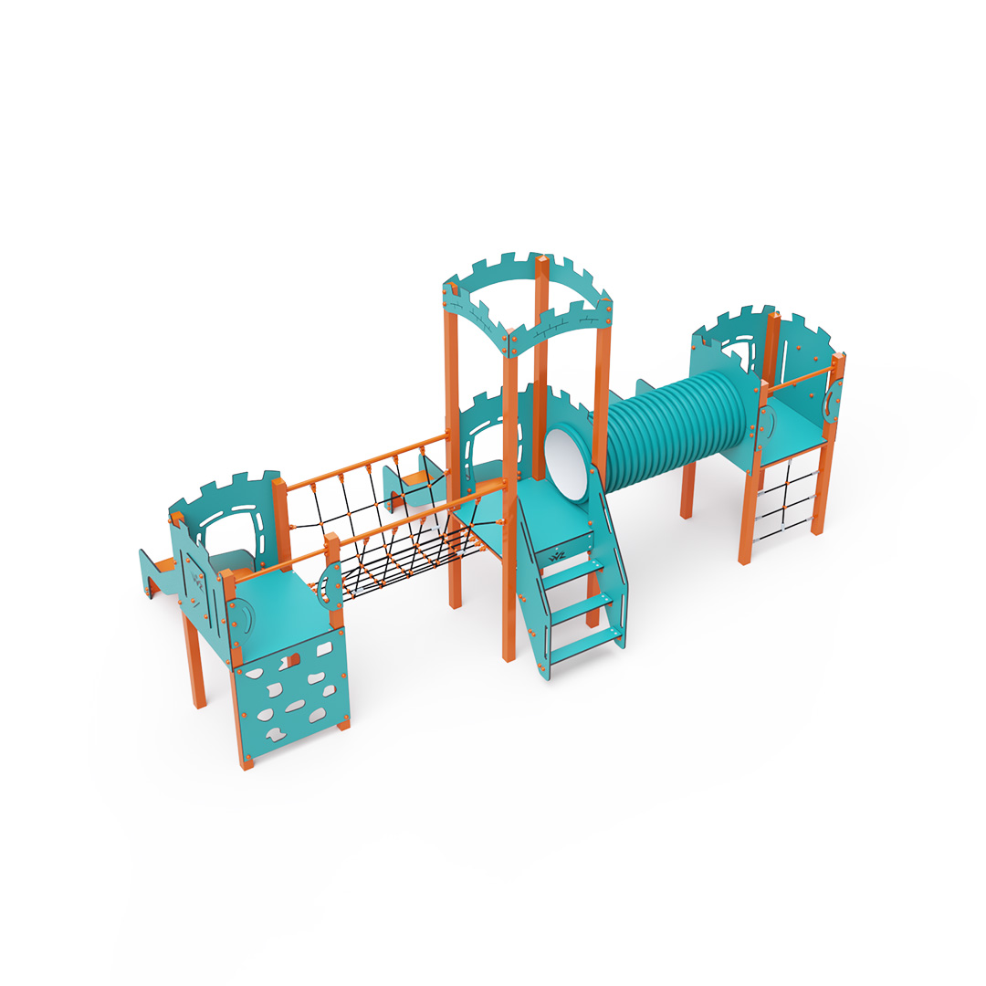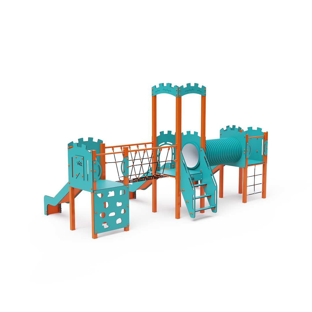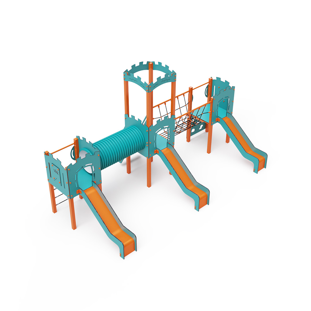 The triple tower combination set features two towers connected to a central tower with walls by a rope bridge and a tunnel. Children can climb the structure using stairs, a vertical climbing wall with handholds, or a rope net, and they can slide down one of the three slides. The turquoise-orange design is inviting from afar. The steel construction is weather-resistant due to hot-dip galvanizing and coating with a durable powder paint. The HPL material used is chemically resistant, UV-resistant - colorfast, non-toxic, recyclable, and unbreakable. This prevents injuries from sharp edges or fragments. The ropes are made from polyester fibers wound around a central core, which increases their strength and resistance to mechanical stress. Polyester itself is resistant to microorganisms and weather conditions, dries quickly after rain, retains its color, and has high strength. All joints are made of stainless steel and covered with plastic caps to enhance durability and safety.