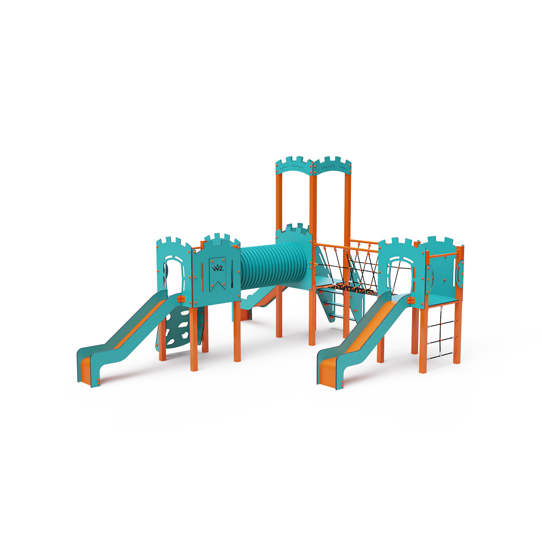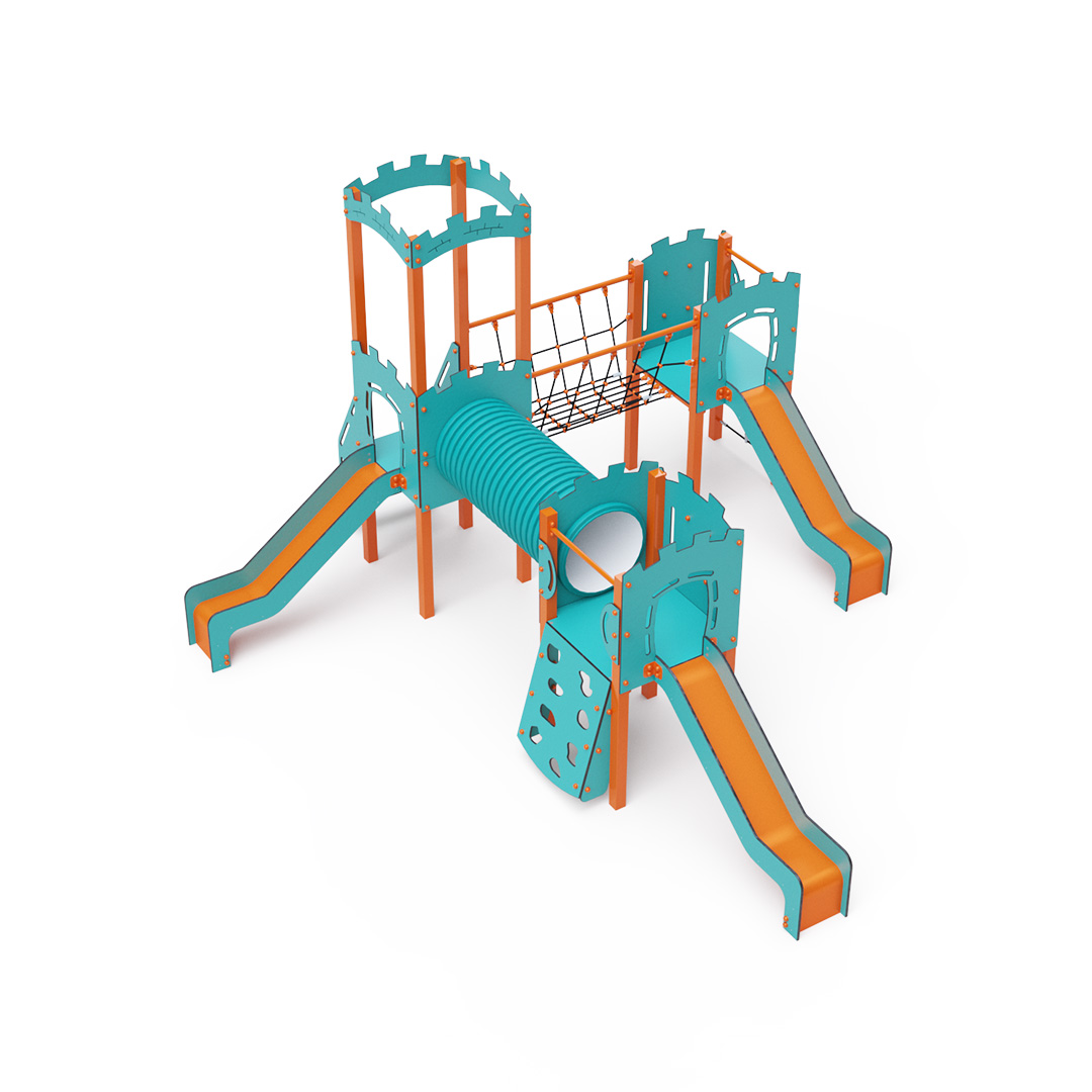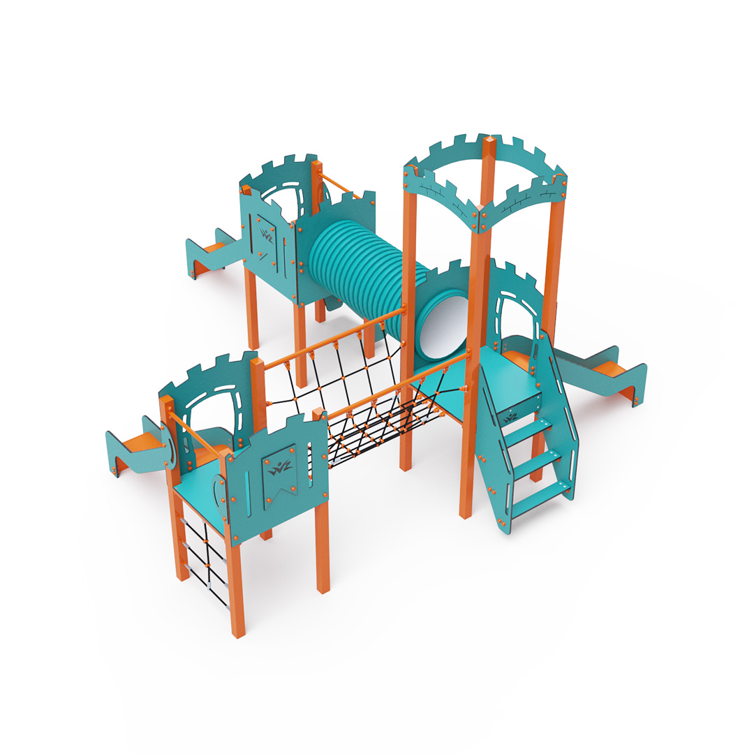 The triple tower combination set is designed in an L-shape. Two towers are connected to a central tower with walls by a rope bridge and a tunnel. Children can climb the structure using stairs, a sloped climbing wall with handholds and a rope, or a rope net, and can slide down one of three slides. The turquoise-orange design is visually appealing from a distance. The steel construction is weather-resistant due to hot-dip galvanizing and coating with a durable powder paint. The HPL material used is chemically resistant, UV-resistant—colorfast, non-toxic, recyclable, and unbreakable. This design minimizes the risk of injury from sharp edges or fragments. The ropes are made from polyester fibers wound around a central core, which enhances the rope's strength and resistance to mechanical stress. The polyester itself is resistant to microorganisms and weather conditions, dries quickly after rain, retains its color, and exhibits high strength. All joints are made of stainless steel and covered with plastic caps to increase durability and safety.