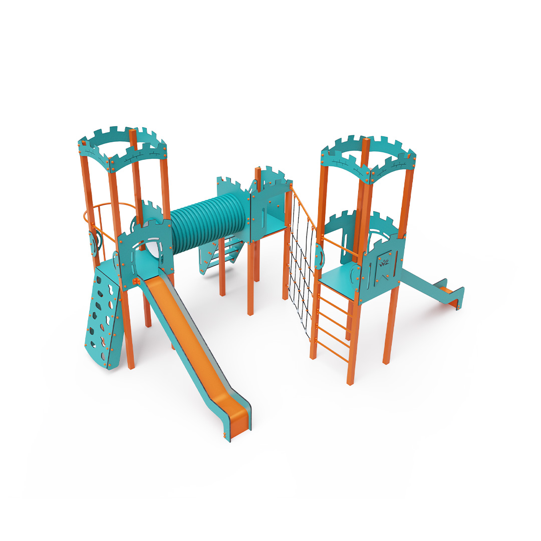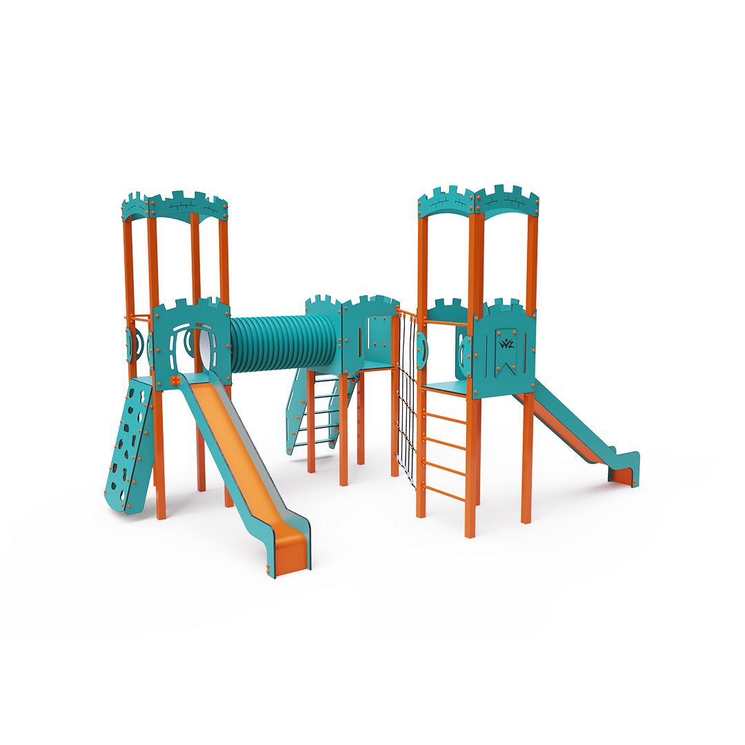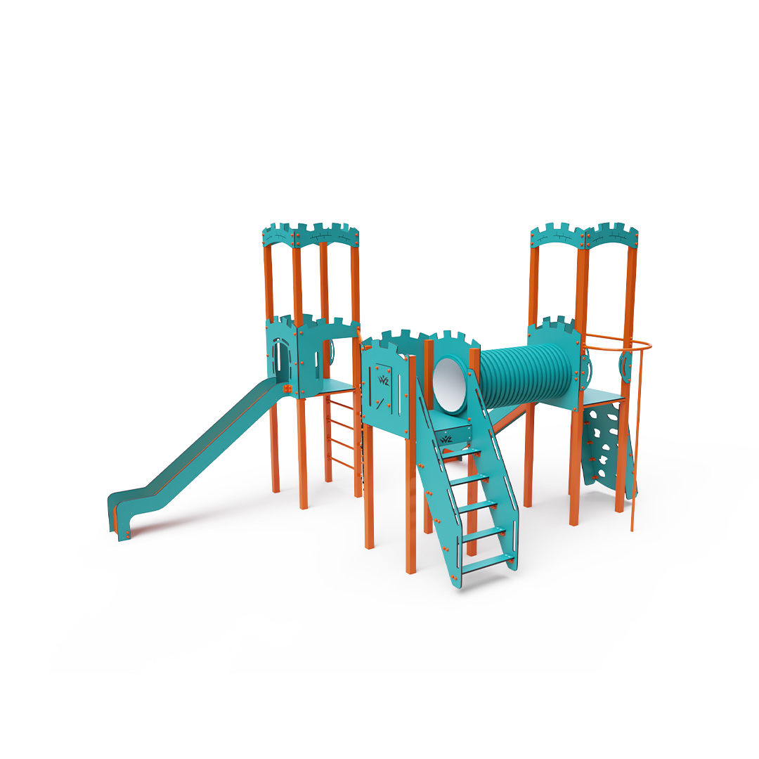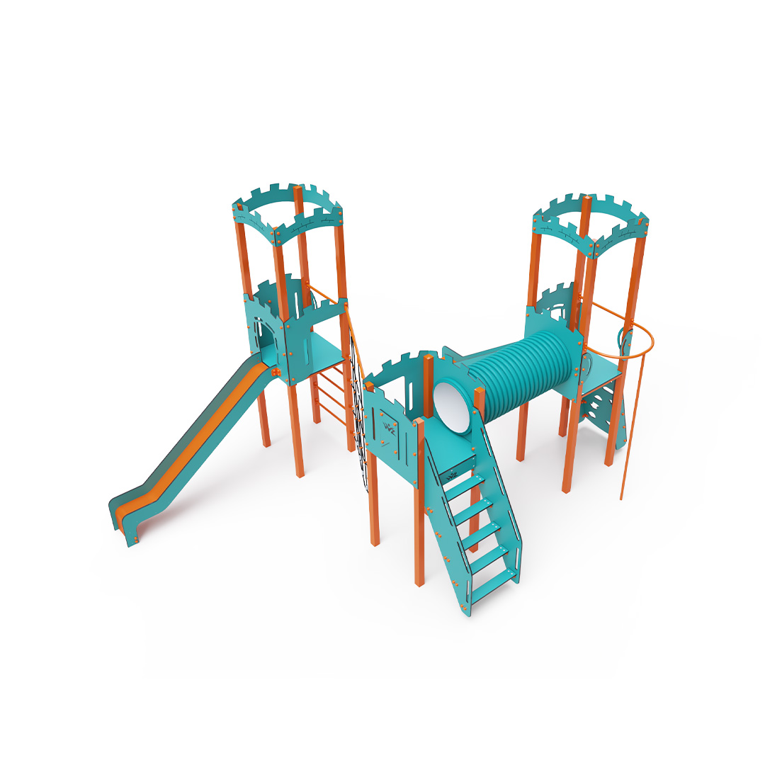 The triple tower combination set is designed in an L-shape. Two towers with walls are connected to a central tower by a diagonal rope wall and a tunnel. Children can climb the structure using stairs, a sloped climbing wall with handholds, a climbing pole, or a ladder, and can descend via one of two slides or the climbing pole. The turquoise-orange design is visually appealing from a distance. The steel construction is weather-resistant due to hot-dip galvanizing and coating with a durable powder paint. The HPL material used is chemically resistant, UV-resistant—colorfast, non-toxic, recyclable, and unbreakable. This design minimizes the risk of injury from sharp edges or fragments. The ropes are made from polyester fibers wound around a central core, which enhances the rope's strength and resistance to mechanical stress. The polyester itself is resistant to microorganisms and weather conditions, dries quickly after rain, retains its color, and exhibits high strength. All joints are made of stainless steel and covered with plastic caps to increase durability and safety.