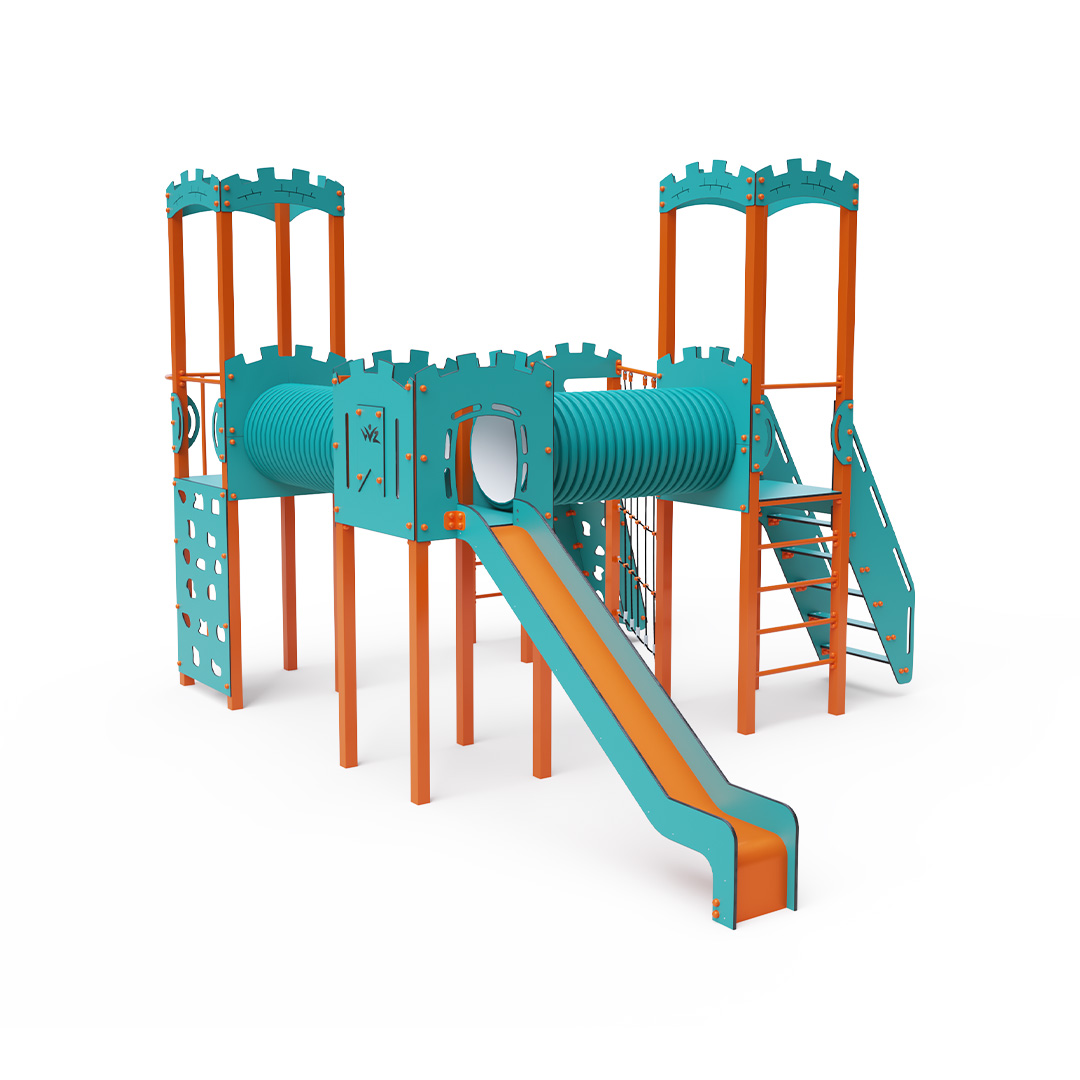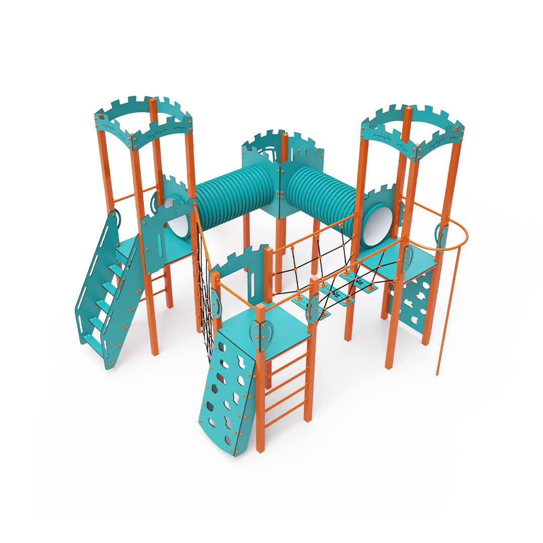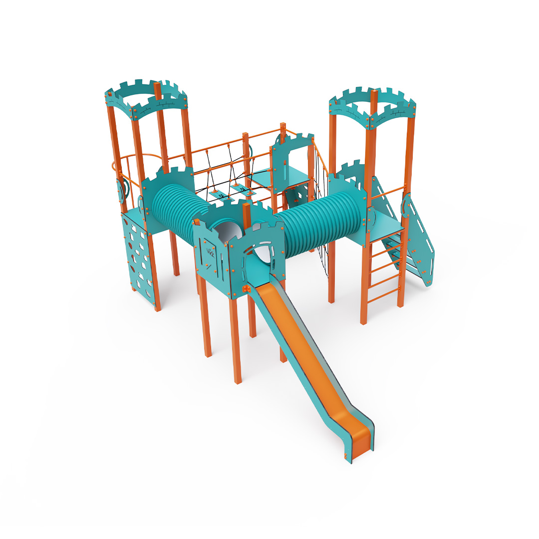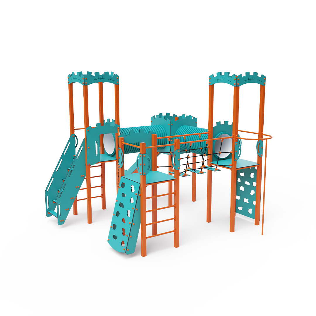 The four-tower combination set includes two towers with walls and two low towers connected by a diagonal rope wall, a rope bridge, and two tunnels. The set features stairs, a slanted climbing wall, a climbing pole, a slanted rope net, ladders, and two slides. The turquoise-orange design is visually appealing from afar. The steel construction is weather-resistant due to hot-dip galvanizing and coating with a durable powder paint. The HPL material used is chemically resistant, UV-resistant—colorfast, non-toxic, recyclable, and unbreakable. This design minimizes the risk of injury from sharp edges or fragments. The ropes are made from polyester fibers wound around a central core, which enhances their strength and resistance to mechanical stress. Polyester is resistant to microorganisms, weather conditions, dries quickly after rain, maintains its color, and has high strength. All joints are made of stainless steel and covered with plastic caps to increase durability and safety.