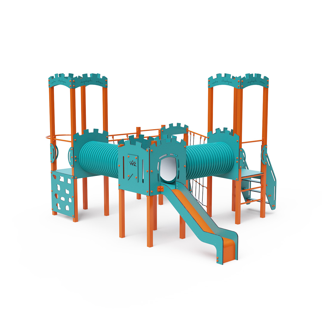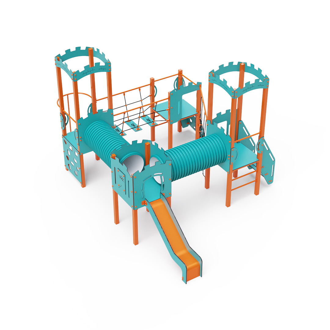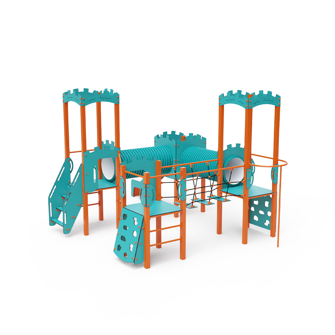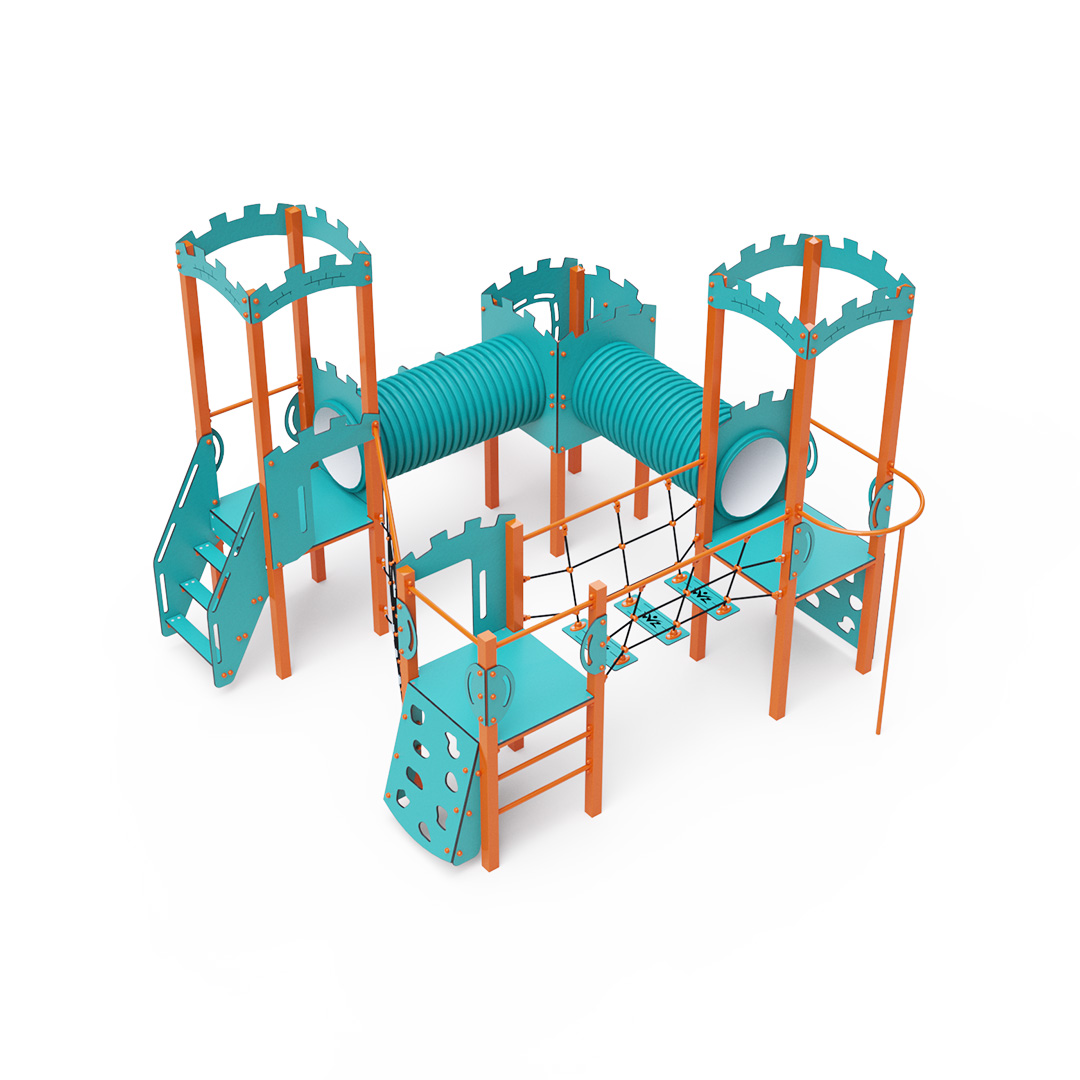 The four-tower combination set includes two towers with walls and two low towers connected by a diagonal rope wall, a rope bridge, and two tunnels. The set features stairs, a slanted climbing wall, a climbing pole, a slanted rope net, ladders, and two slides. The turquoise-orange design is visually appealing from afar. The steel construction is weather-resistant due to hot-dip galvanizing and coating with a durable powder paint. The HPL material used is chemically resistant, UV-resistant—colorfast, non-toxic, recyclable, and unbreakable. This design minimizes the risk of injury from sharp edges or fragments. The ropes are made from polyester fibers wound around a central core, which enhances their strength and resistance to mechanical stress. Polyester is resistant to microorganisms, weather conditions, dries quickly after rain, maintains its color, and has high strength. All joints are made of stainless steel and covered with plastic caps to increase durability and safety.