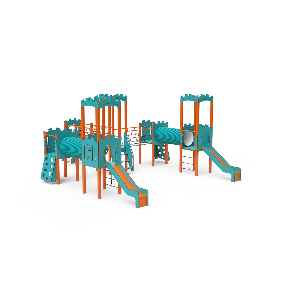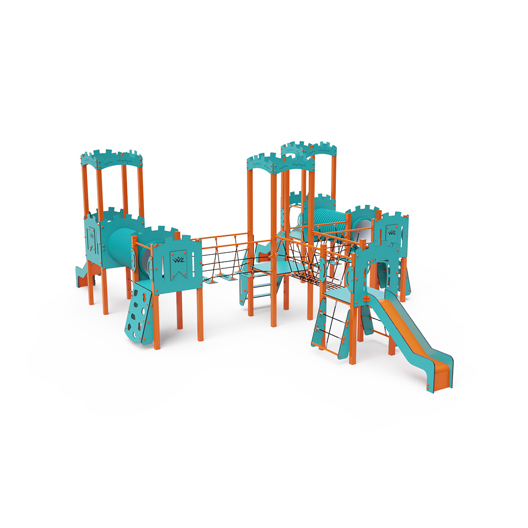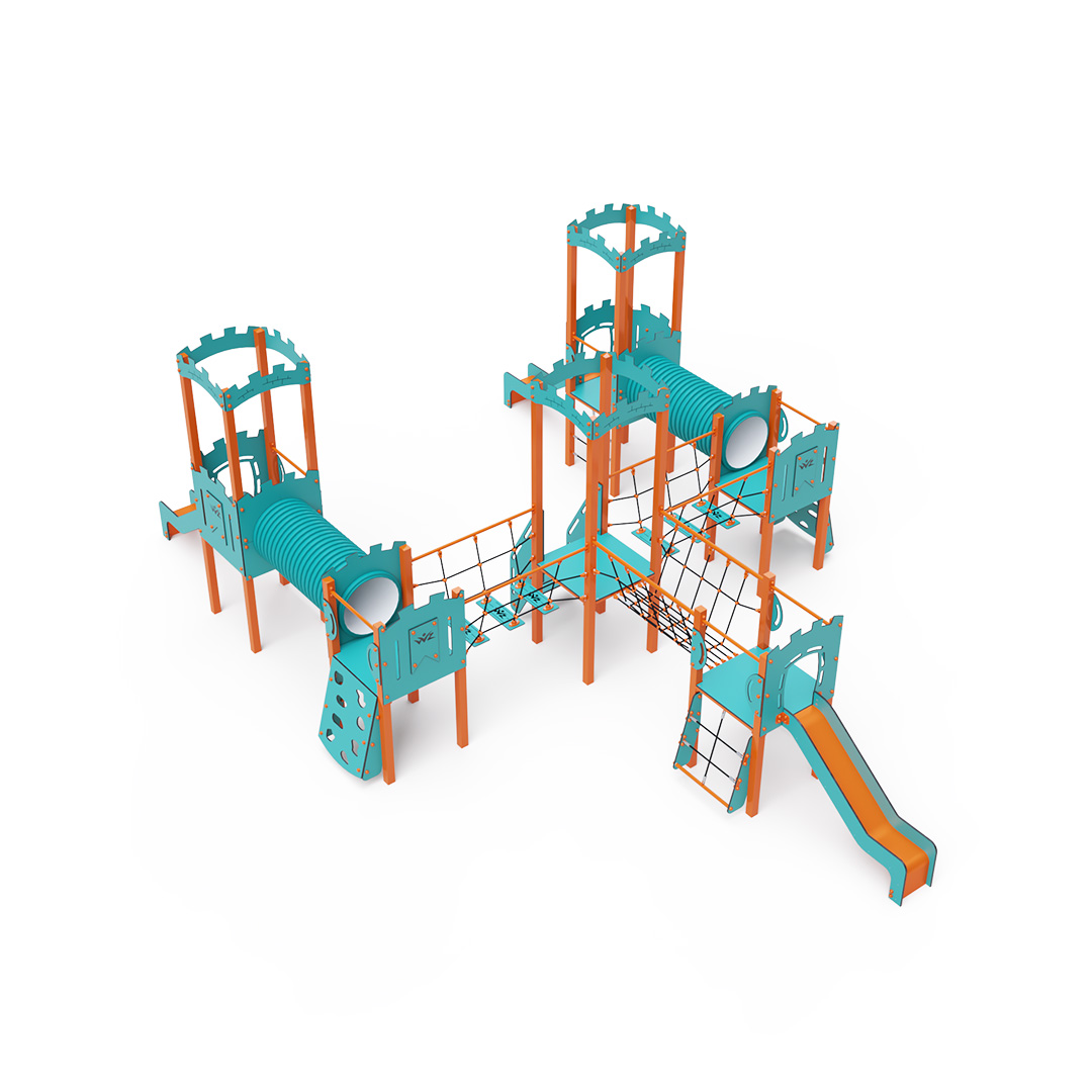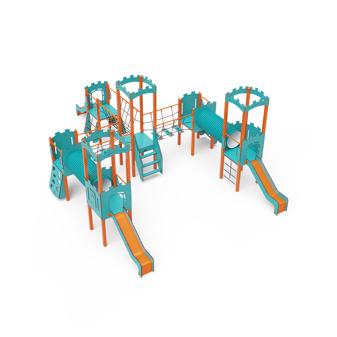 This six-tower combination set features three towers with walls and three low towers, interconnected by rope bridges, rope balance bridges, and a tunnel. The set includes stairs, slanted climbing walls, slanted rope nets, vertical rope nets, and three slides. The turquoise-orange design is visually appealing from afar. The steel construction is weather-resistant due to hot-dip galvanizing and coating with durable powder paint. The HPL material used is chemically resistant, UV-resistant—colorfast, non-toxic, recyclable, and unbreakable. This design minimizes the risk of injury from sharp edges or fragments. The ropes are made from polyester fibers wrapped around a central core, which enhances their strength and resistance to mechanical stress. Polyester is resistant to microorganisms, weather conditions, dries quickly after rain, maintains its color, and boasts high strength. All joints are made of stainless steel and covered with plastic caps to increase durability and safety.
