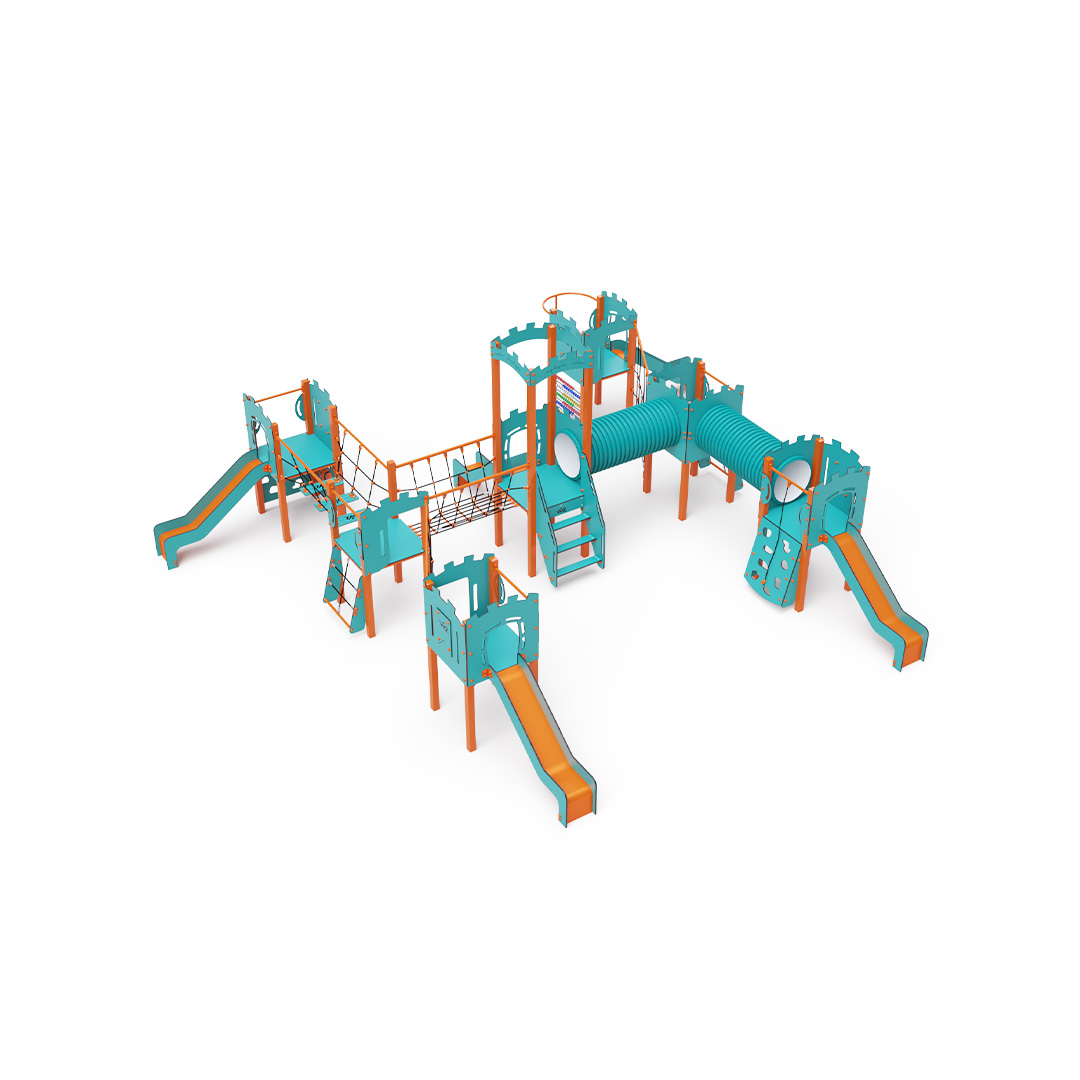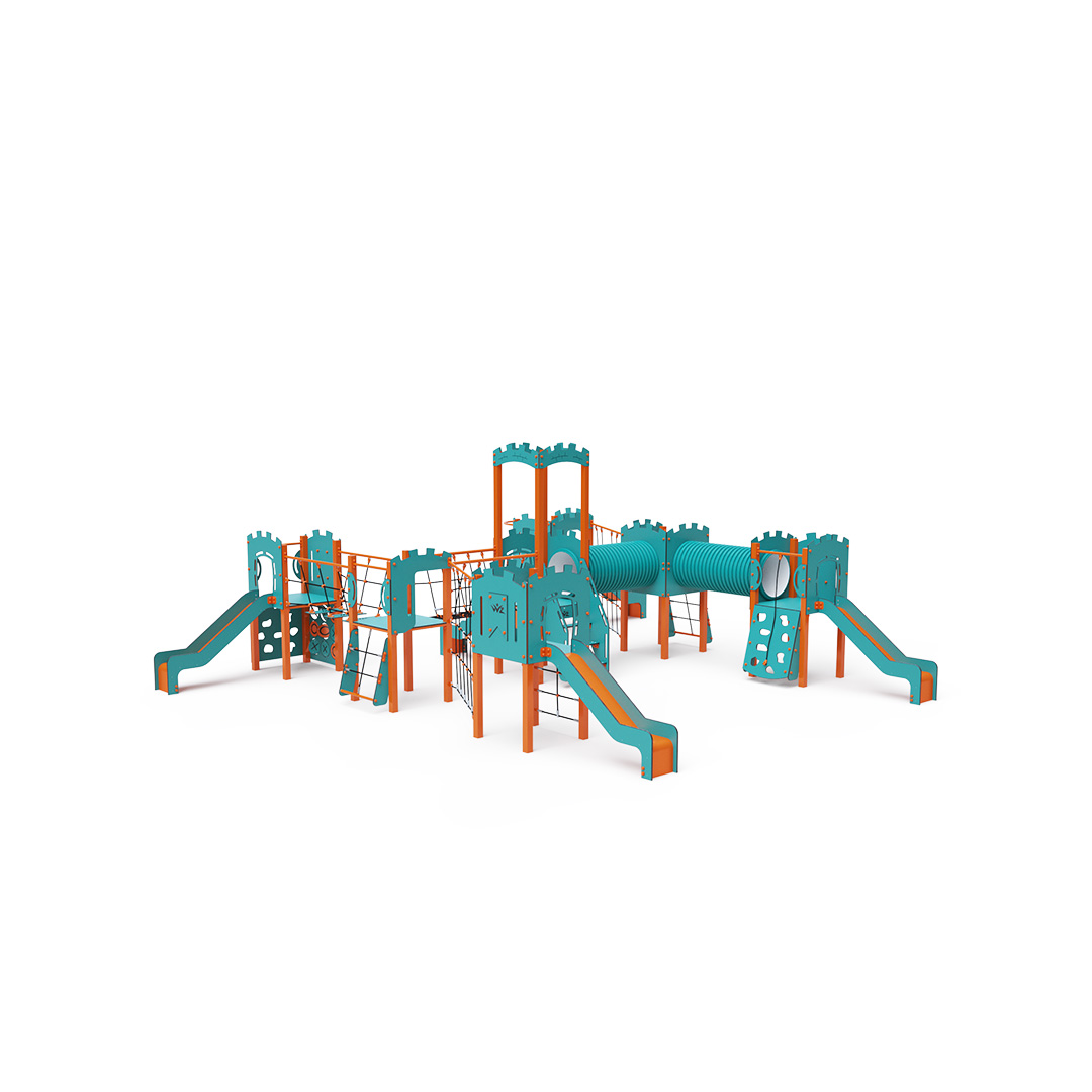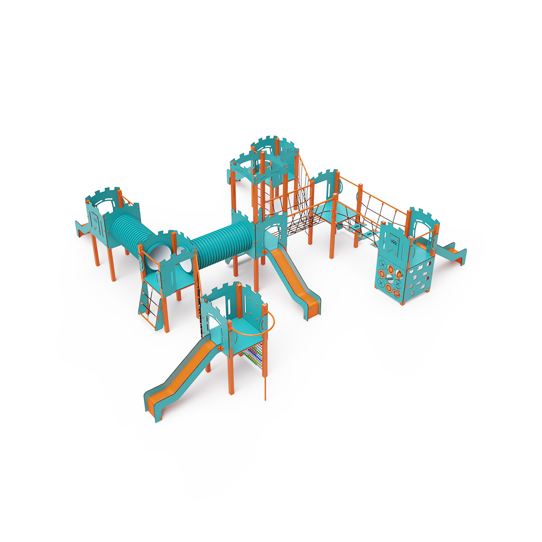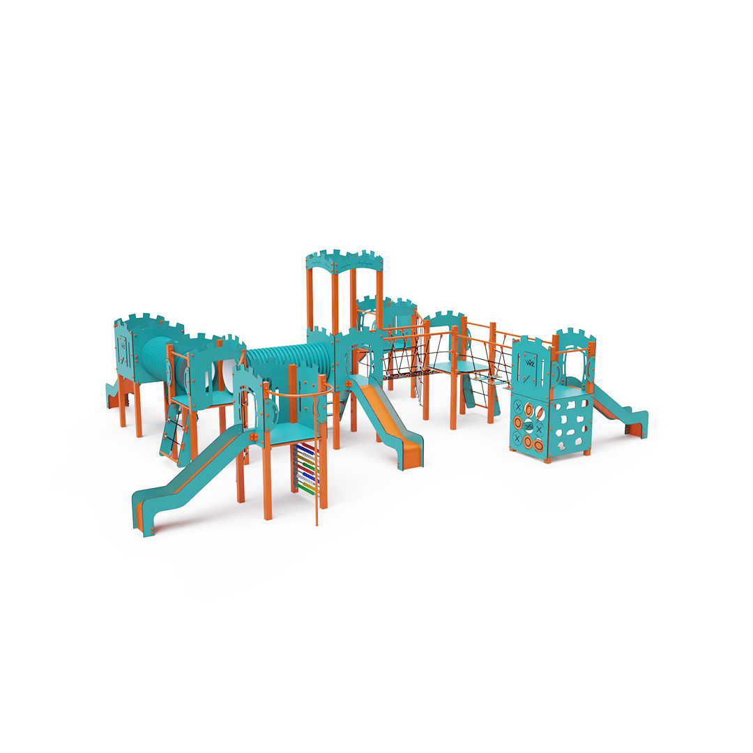 This seven-tower combination set features a central tower with walls and six low towers, all connected by a rope bridge, a rope balance bridge, a diagonal rope wall, and tunnels. The set includes steps, a sloped climbing wall with a rope, a vertical climbing wall, sloped rope nets, a counting frame, tic-tac-toe games, and five slides. The turquoise-orange design is inviting from afar.The steel construction is weather-resistant due to hot-dip galvanizing and coating with durable powder paint. The HPL material used is chemically resistant, UV-resistant—colorfast, non-toxic, recyclable, and unbreakable. This design minimizes the risk of injury from sharp edges or fragments. The ropes are made from polyester fibers wrapped around a central core, which enhances their strength and resistance to mechanical stress. Polyester is resistant to microorganisms, weather conditions, dries quickly after rain, maintains its color, and offers high strength. All joints are made of stainless steel and covered with plastic caps to increase durability and safety.