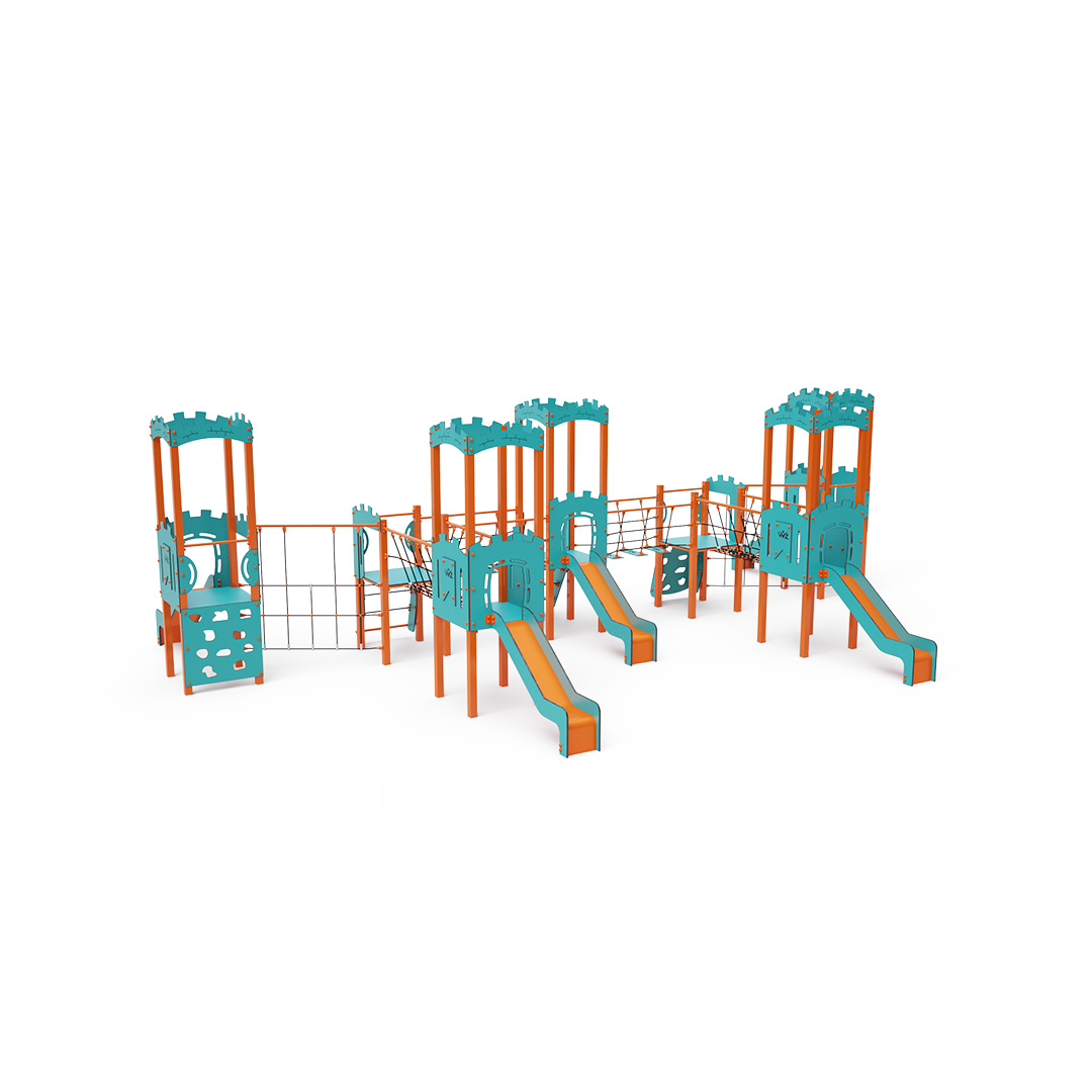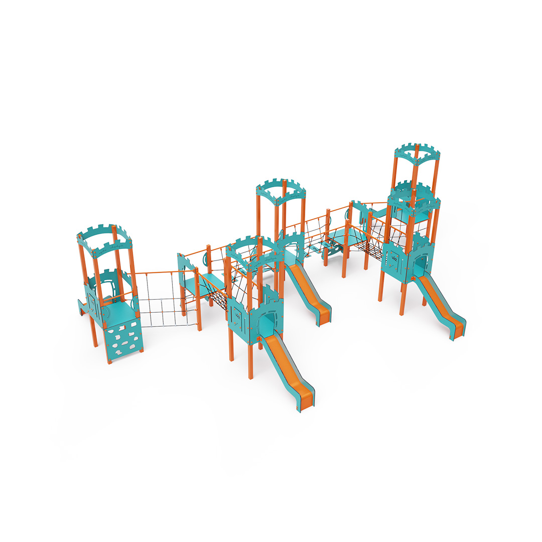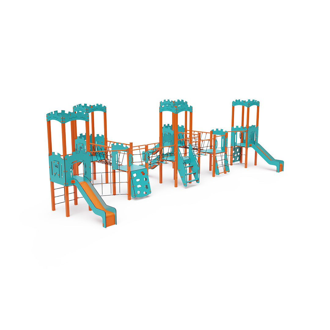 This seven-tower combination set features four towers with walls and three low towers, all interconnected by a rope bridge, a rope balance bridge, and a diagonal rope wall. The set includes steps, a sloped climbing wall, a sloped climbing wall with a rope, a vertical climbing wall, a sloped rope net, a vertical rope net, and five slides. The turquoise-orange design is visually appealing from a distance.The steel structure is weather-resistant thanks to hot-dip galvanizing and coating with durable powder paint. The HPL material used is chemically resistant, UV-resistant—colorfast, non-toxic, recyclable, and unbreakable. This design minimizes the risk of injury from sharp edges or fragments. The ropes are made from polyester fibers wrapped around a central core, which enhances their strength and resistance to mechanical stress. Polyester is resistant to microorganisms, weather conditions, dries quickly after rain, maintains its color, and offers high strength. All joints are made of stainless steel and covered with plastic caps to increase durability and safety.