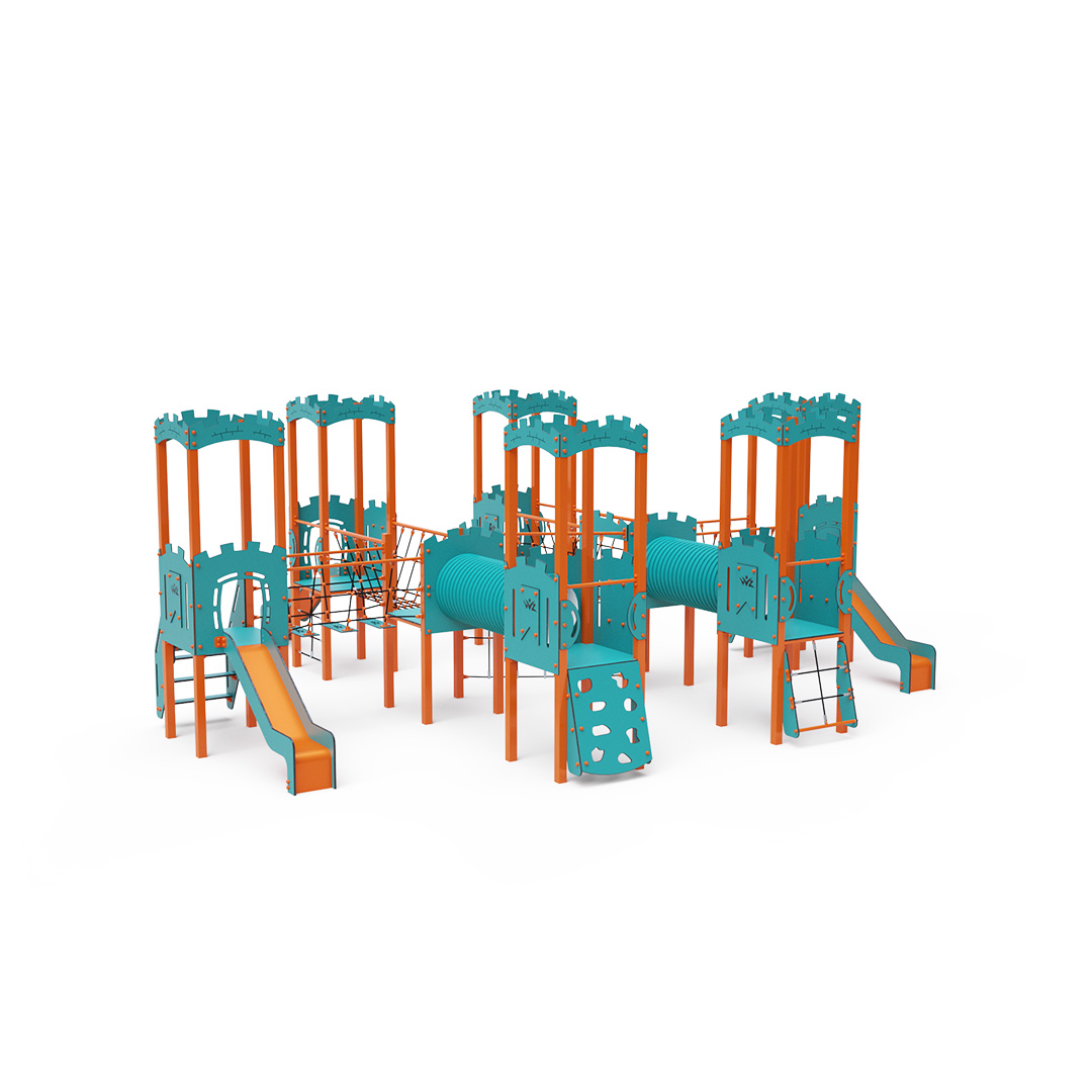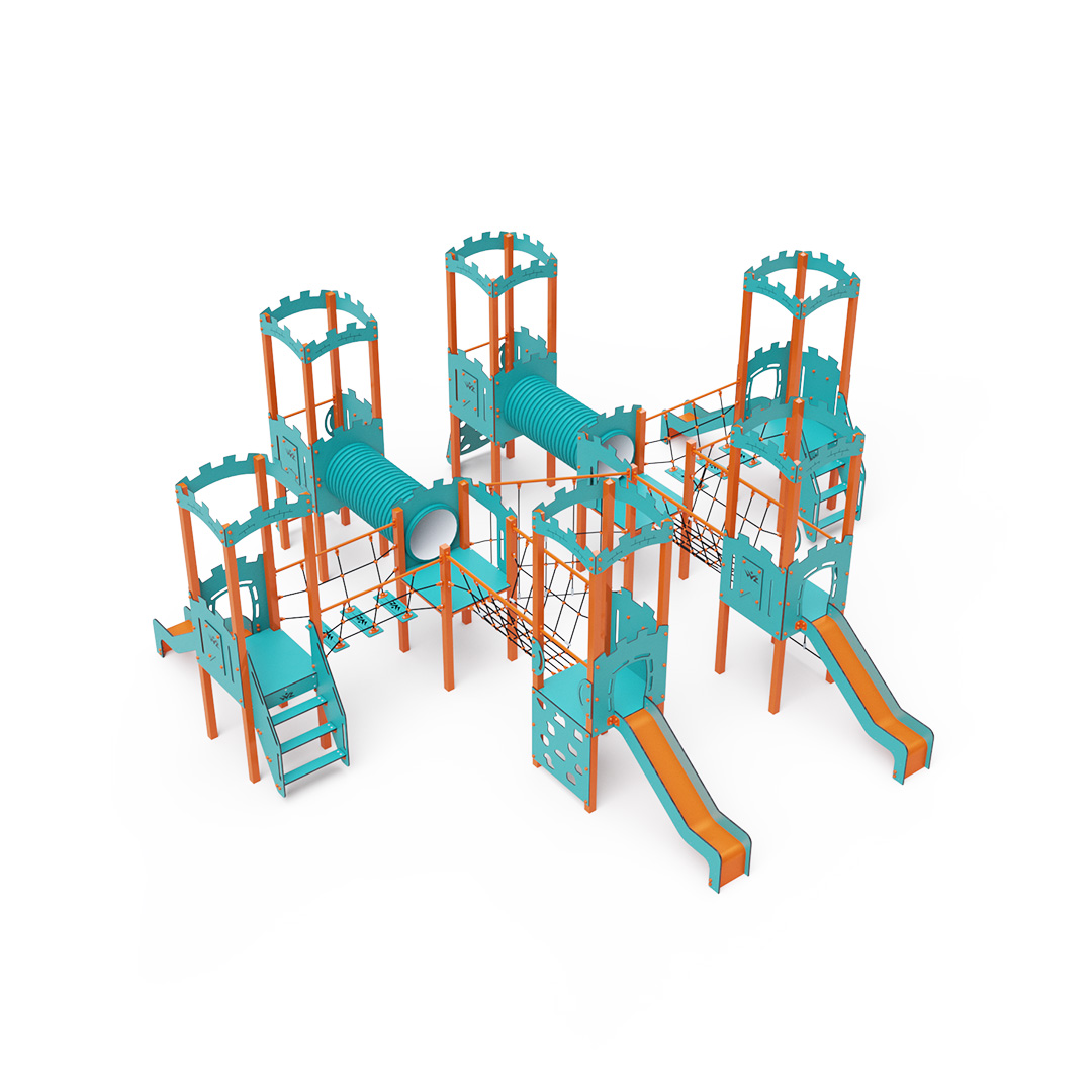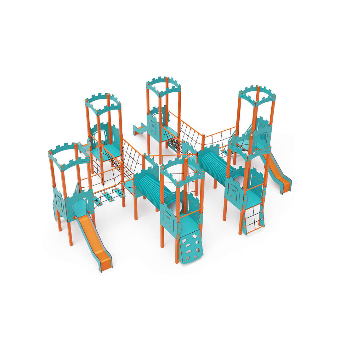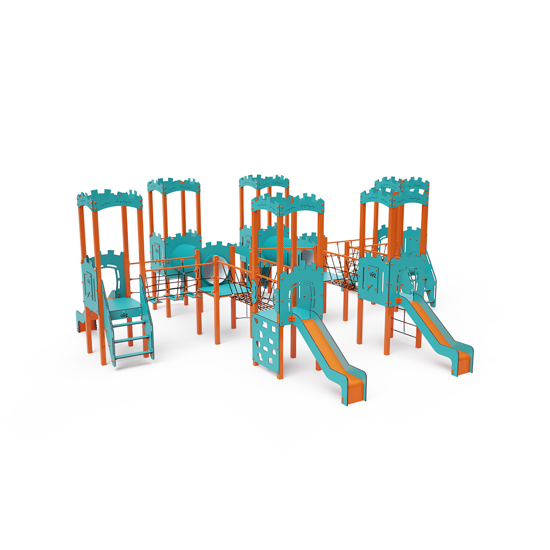 This eight-tower combination set includes six towers with walls and two low towers, all interconnected via rope bridges, rope balance bridges, tunnels, and a diagonal rope wall. The set features steps, a sloped climbing wall, a vertical climbing wall, a sloped rope net, a vertical rope net, and four slides. The vibrant turquoise-orange design is visually inviting from afar.The steel structure is designed to withstand weather conditions thanks to hot-dip galvanizing and coating with durable powder paint. The HPL material used is chemically resistant, UV-resistant—colorfast, non-toxic, recyclable, and unbreakable, reducing the risk of injury from sharp edges or fragments. The ropes are made from polyester fibers wrapped around a central core, which enhances their strength and resistance to mechanical stress. Polyester is resistant to microorganisms, weather conditions, dries quickly after rain, maintains its color, and offers high strength. All joints are stainless steel and covered with plastic caps to increase durability and safety.