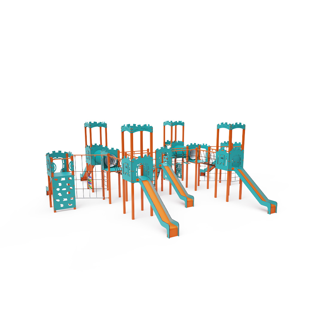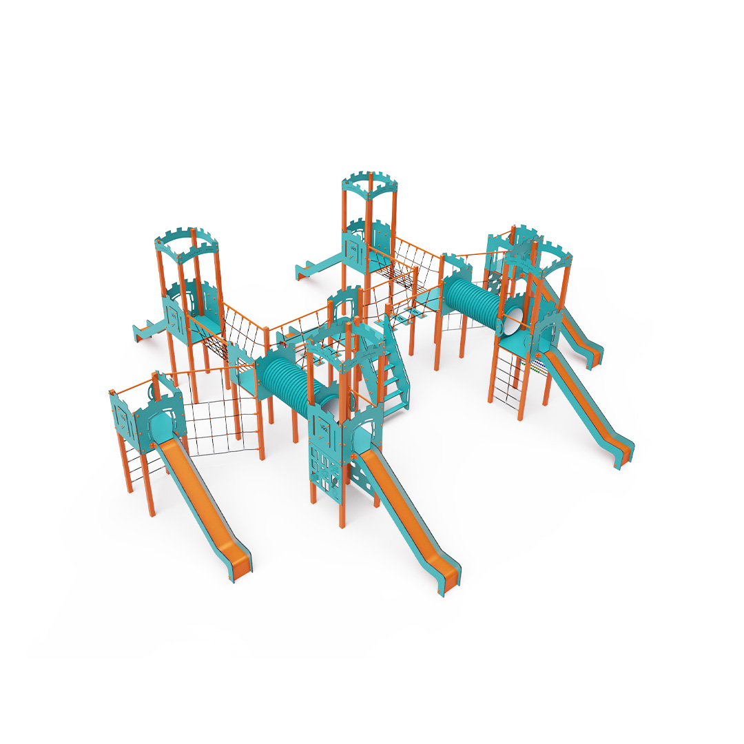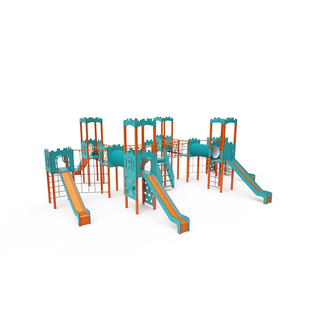 This nine-tower combination set features four towers with walls and five low towers, all interconnected by rope bridges, rope balance bridges, and diagonal rope walls. The set includes steps, vertical climbing walls, vertical rope nets, tic-tac-toe games, a counting frame, and seven slides. The turquoise-orange design is eye-catching from afar.The steel construction is weather-resistant due to hot-dip galvanizing and coating with durable powder paint. The HPL material used is chemically resistant, UV-resistant—colorfast, non-toxic, recyclable, and unbreakable. This design minimizes the risk of injury from sharp edges or fragments. The ropes are made from polyester fibers wrapped around a central core, which enhances their strength and resistance to mechanical stress. Polyester is resistant to microorganisms, weather conditions, dries quickly, maintains its color, and boasts high strength. All joints are made of stainless steel and covered with plastic caps to increase durability and safety.