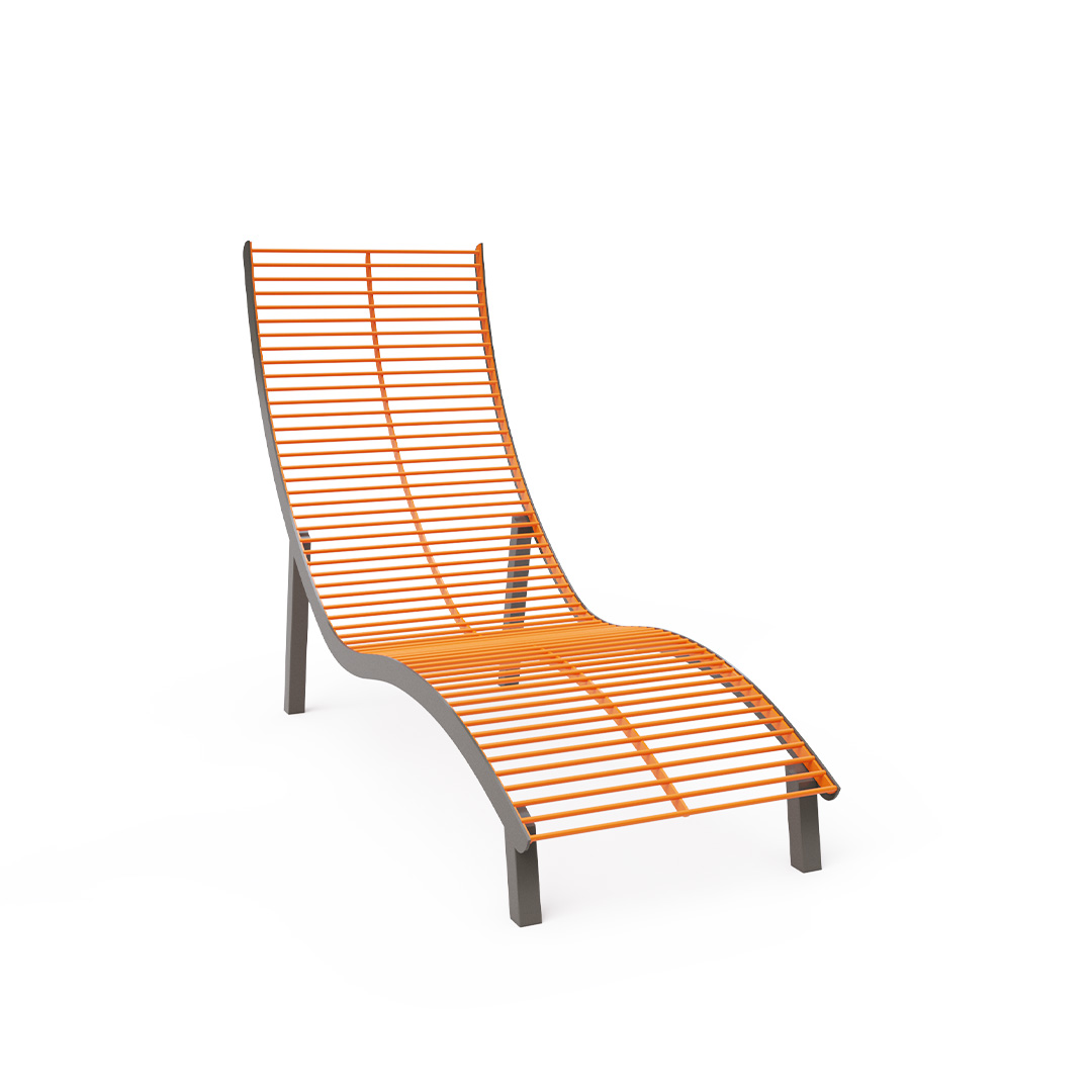 A designer deck chair suitable for relaxation zones, primarily intended for outdoor use—parks, playgrounds—but also for indoor use—shopping centers, airport terminals, etc.