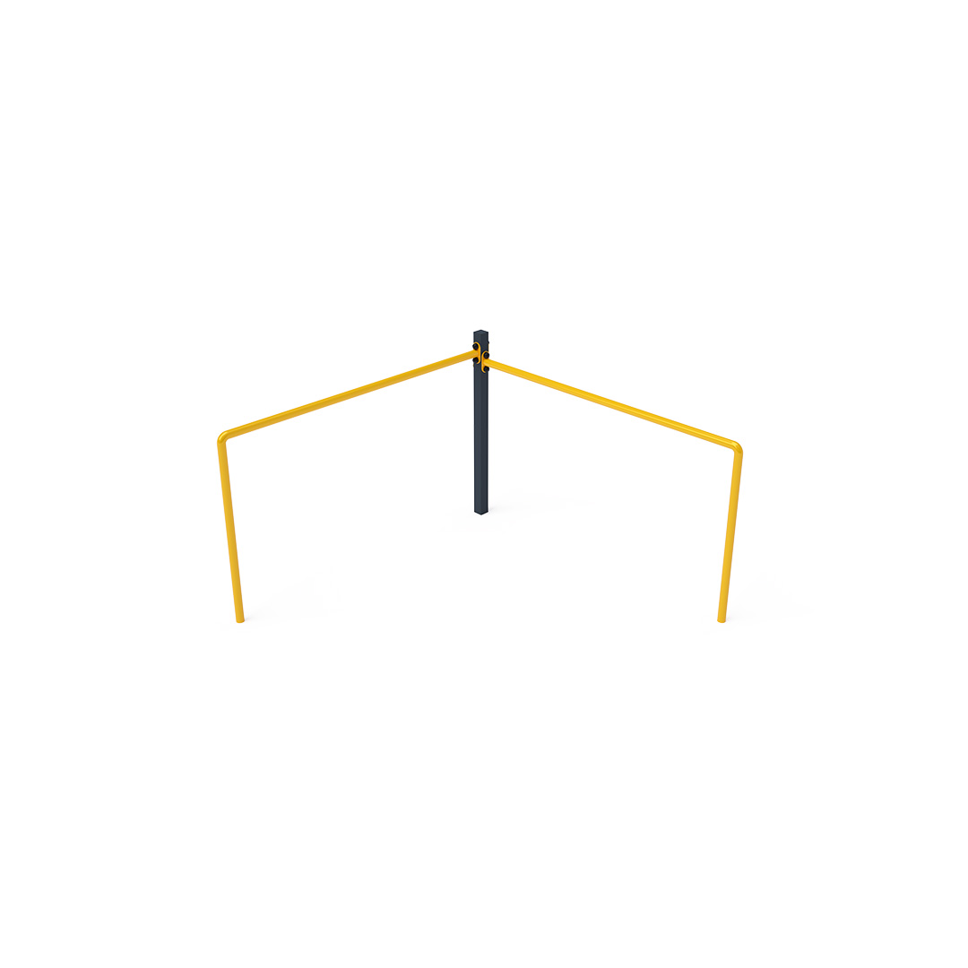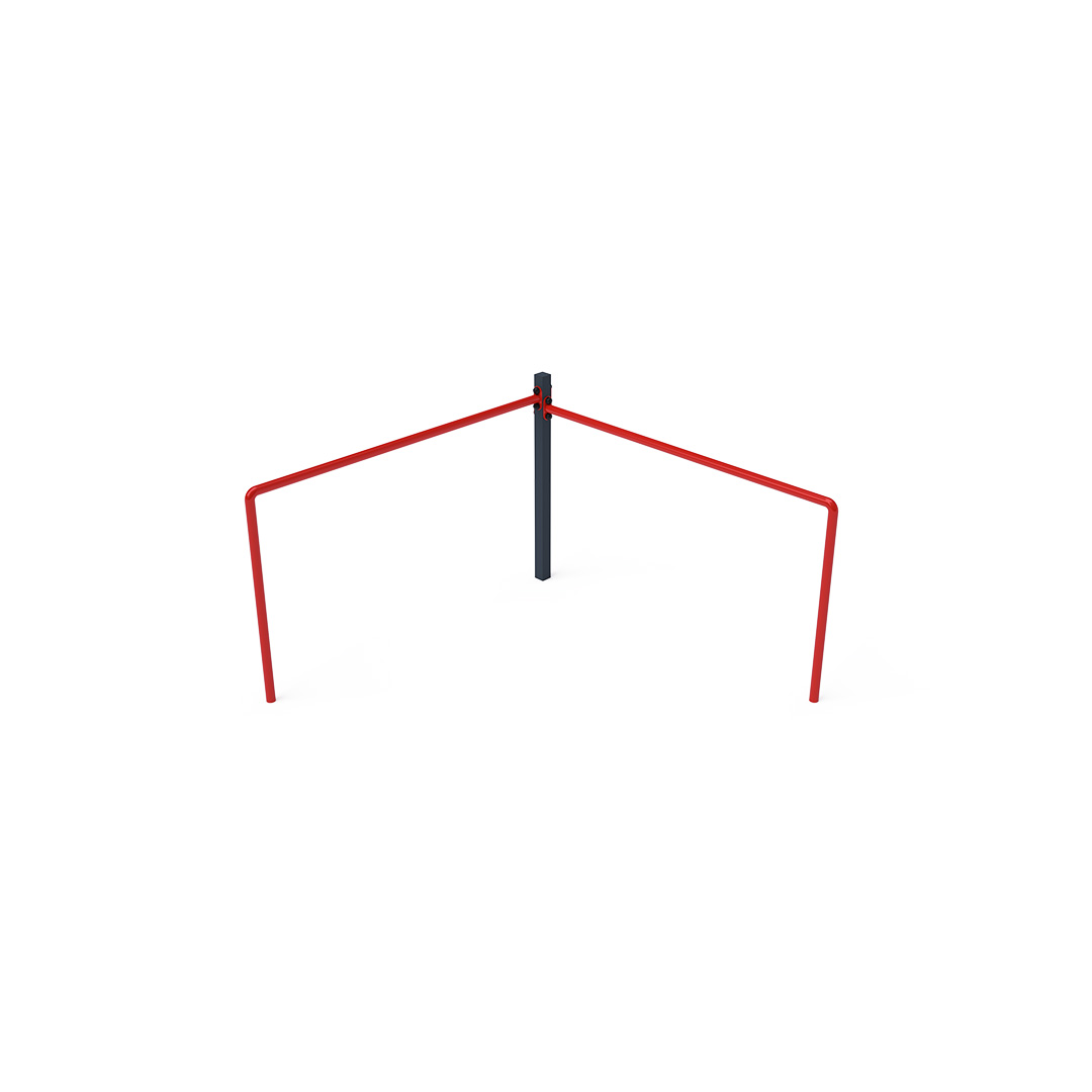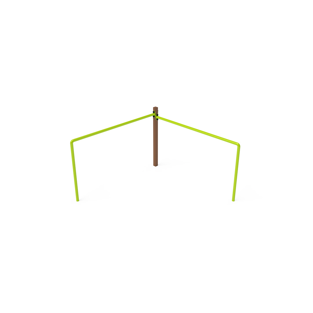 Maintenance-free double balance bar is a playground feature where children can train their strength, fitness, and agility. Each bar has a different height to accommodate both larger and smaller children. It is made of hot-dip galvanized steel, coated with powder-baked paint. Stainless steel fasteners are used and are protected with covers to enhance their lifespan and safety. A grassy surface can be used as an impact-absorbing area, though we recommend using a grass reinforcement grid for safety.