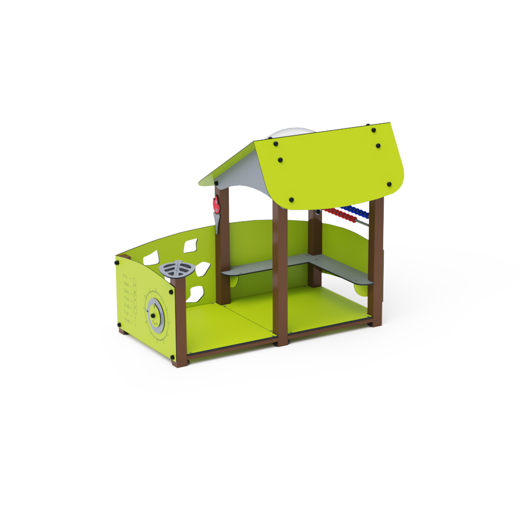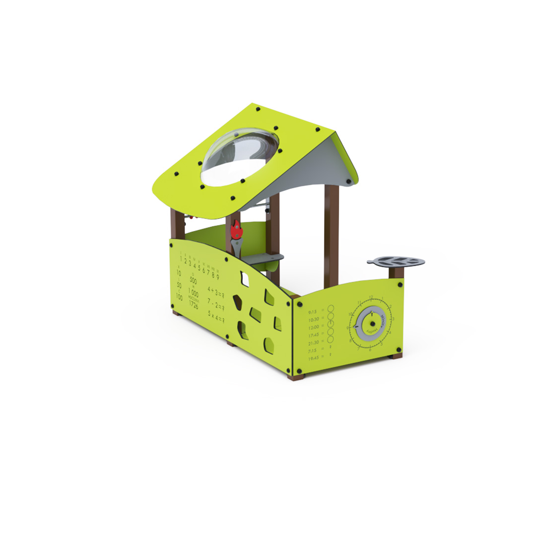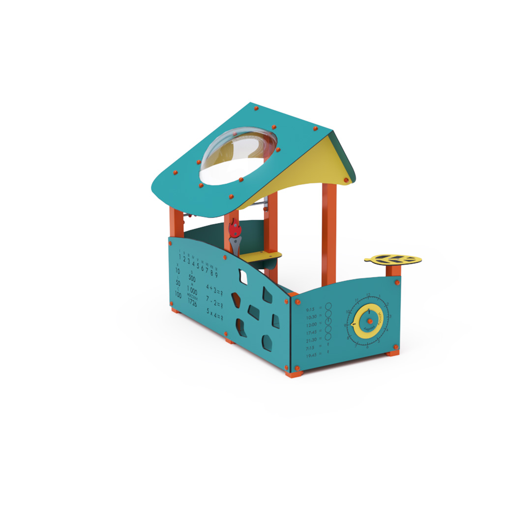 Educational playhouse full of fun that not only teaches new things but primarily entertains a group of children. The house with a sloping roof is complemented by educational panels with numbers and clocks, a mini climbing wall, and a small abacus.Construction of the playhouse is made of galvanized and powder-coated steel. All panels are crafted from HPL material with UV protection, ensuring color stability, non-toxicity, and durability. All joints are stainless steel and covered with plastic caps.