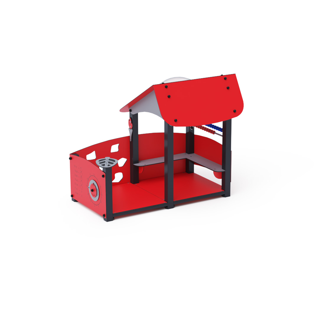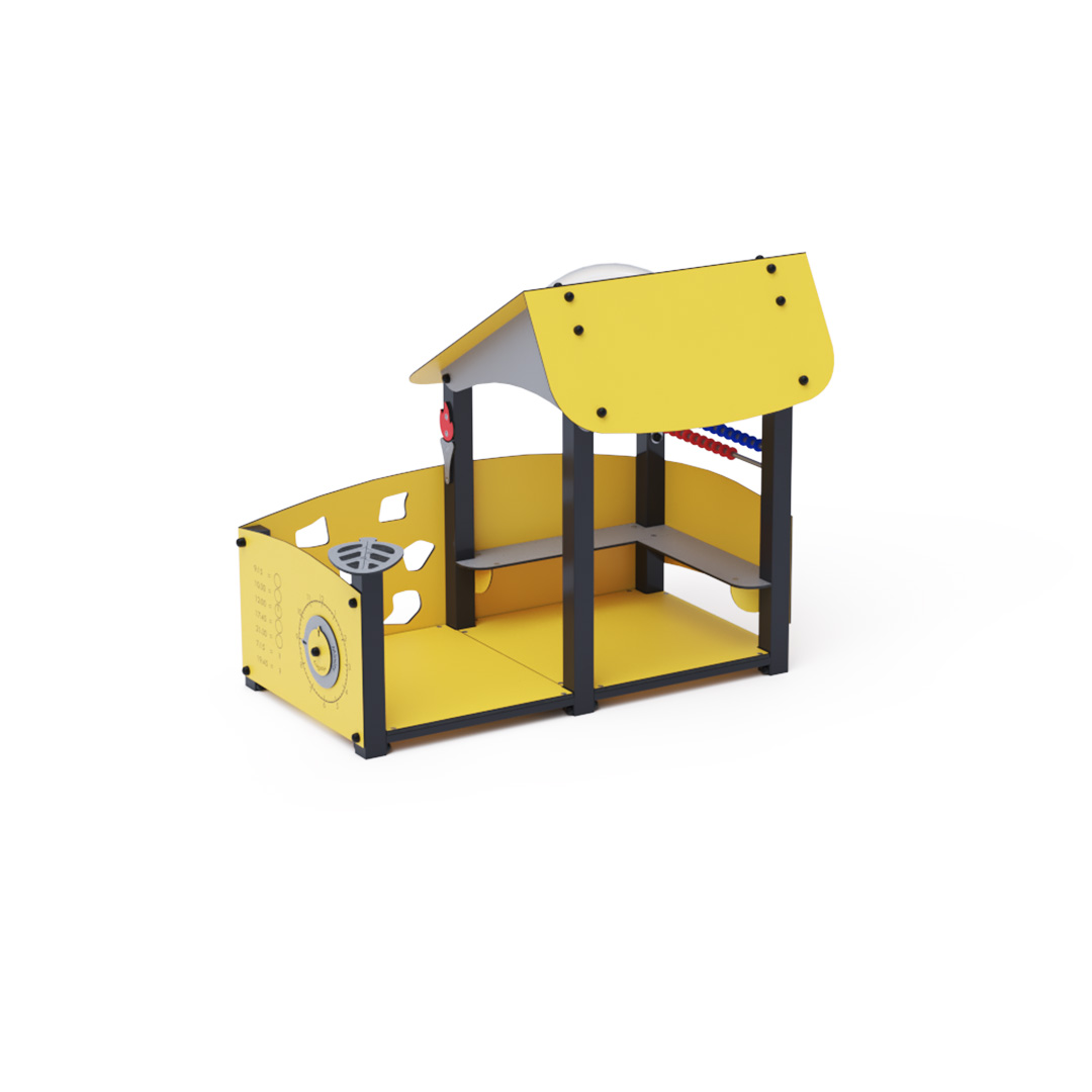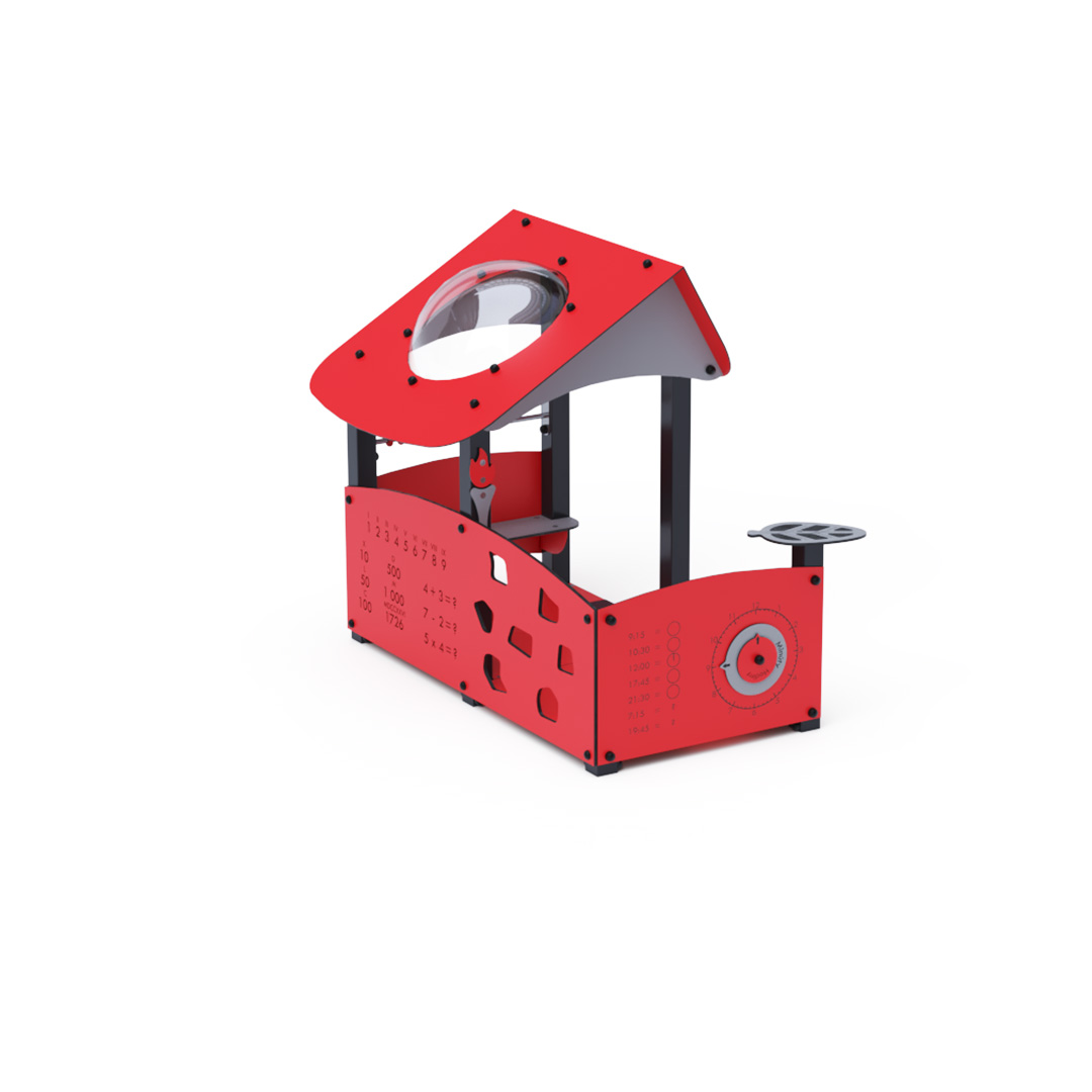 Educational playhouse full of fun that not only teaches new things but primarily entertains a group of children. The house with a sloping roof is complemented by educational panels with numbers and clocks, a mini climbing wall, and a small abacus.Construction of the playhouse is made of galvanized and powder-coated steel. All panels are crafted from HPL material with UV protection, ensuring color stability, non-toxicity, and durability. All joints are stainless steel and covered with plastic caps.