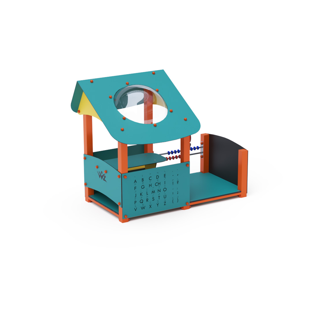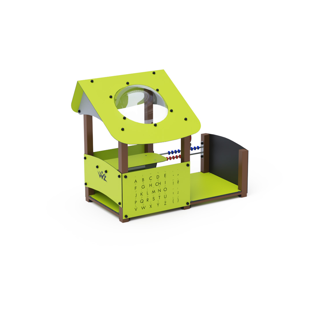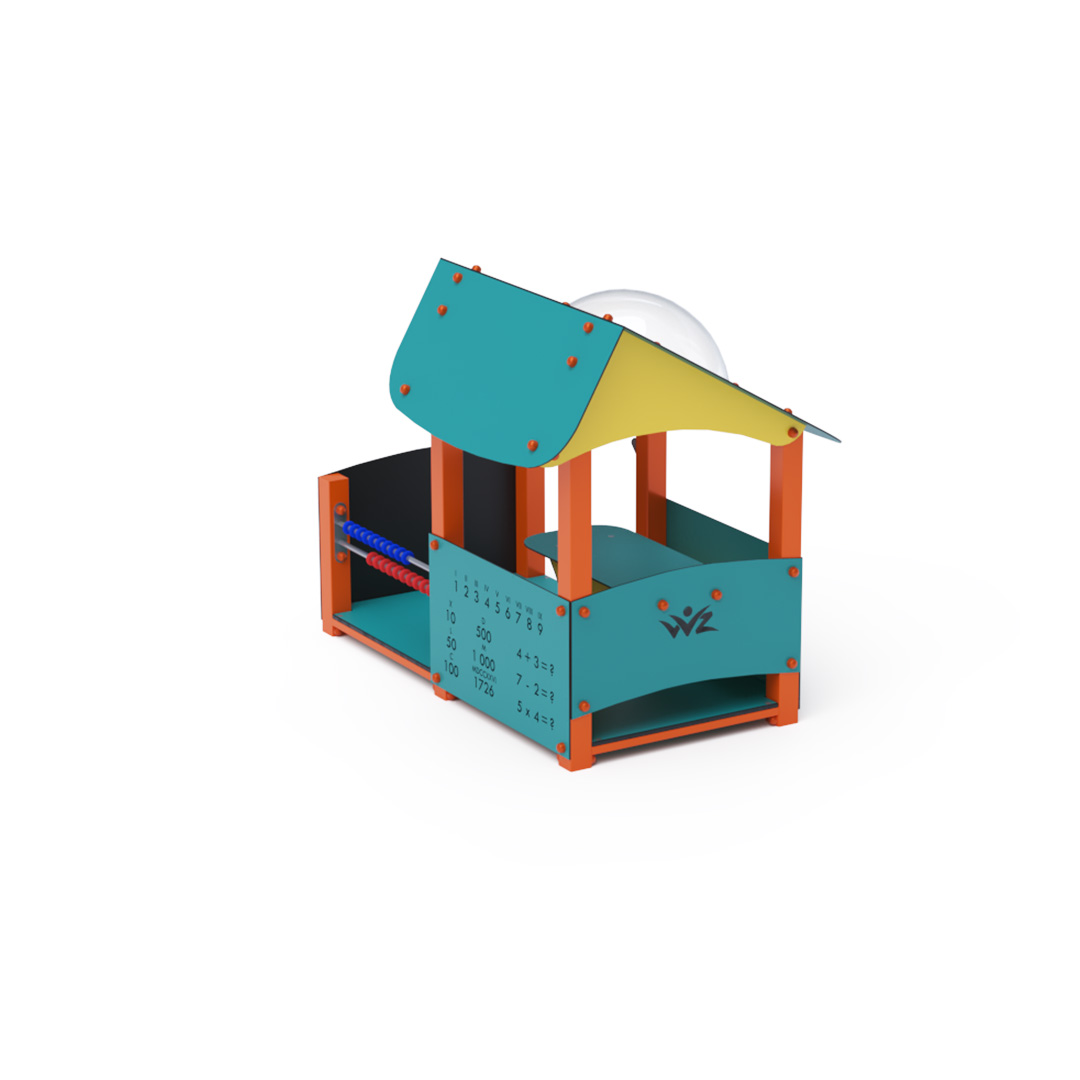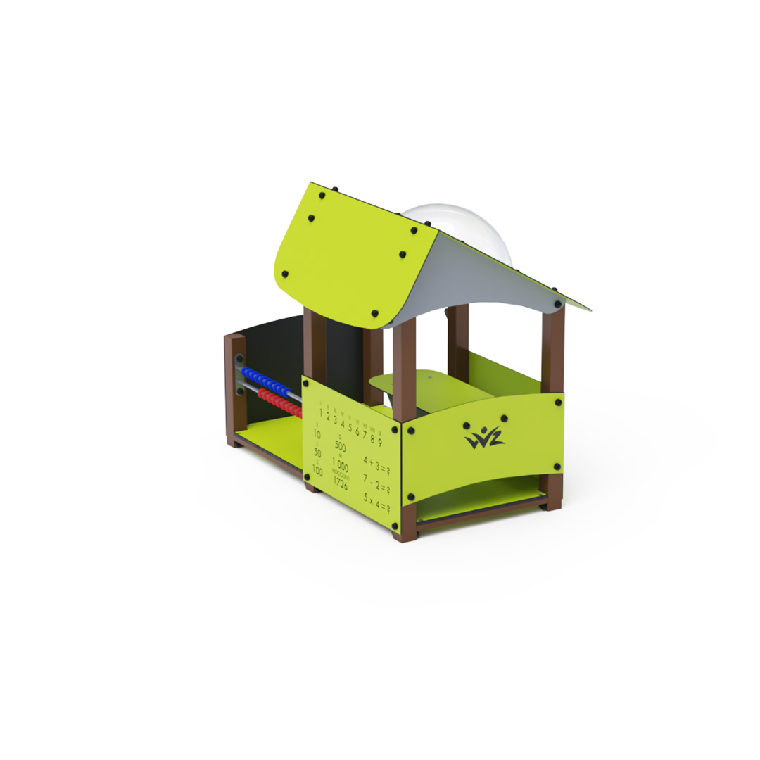 Educational playhouse full of fun that not only teaches new things but primarily entertains a group of children. The house with a sloping roof is complemented by an educational panel with numbers, a drawing board, and a small abacus.Construction of the playhouse is made of galvanized and powder-coated steel. All panels are crafted from HPL material with UV protection, ensuring color stability, non-toxicity, and durability. All joints are stainless steel and covered with plastic caps.