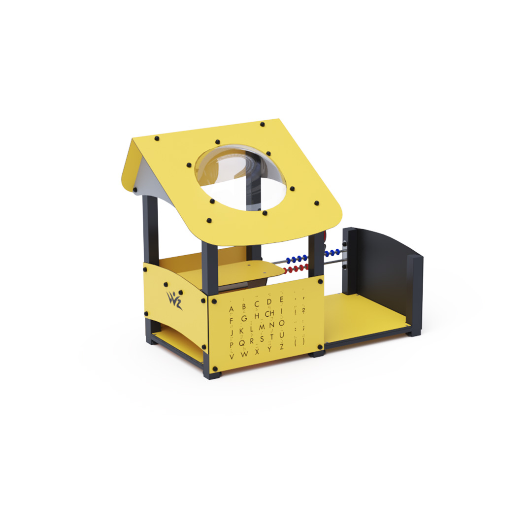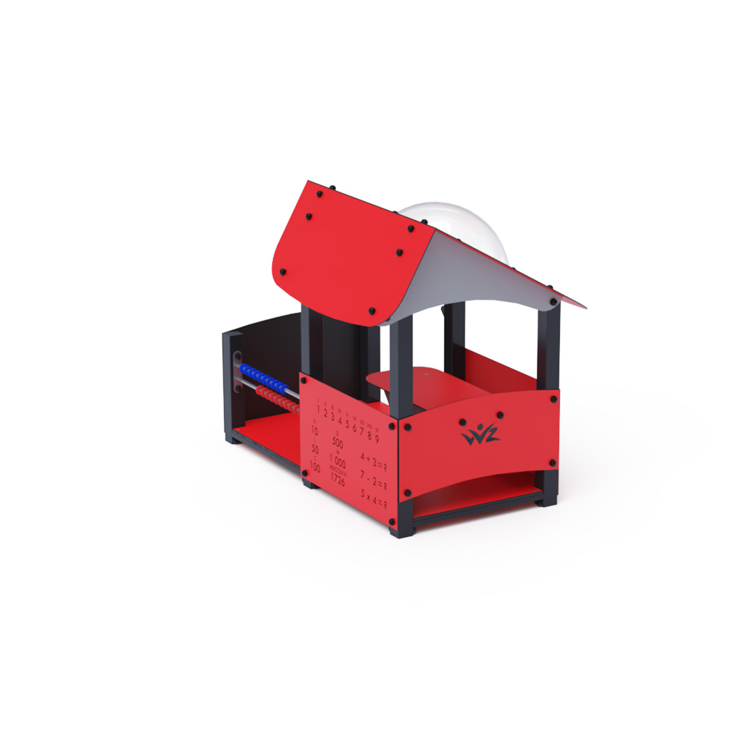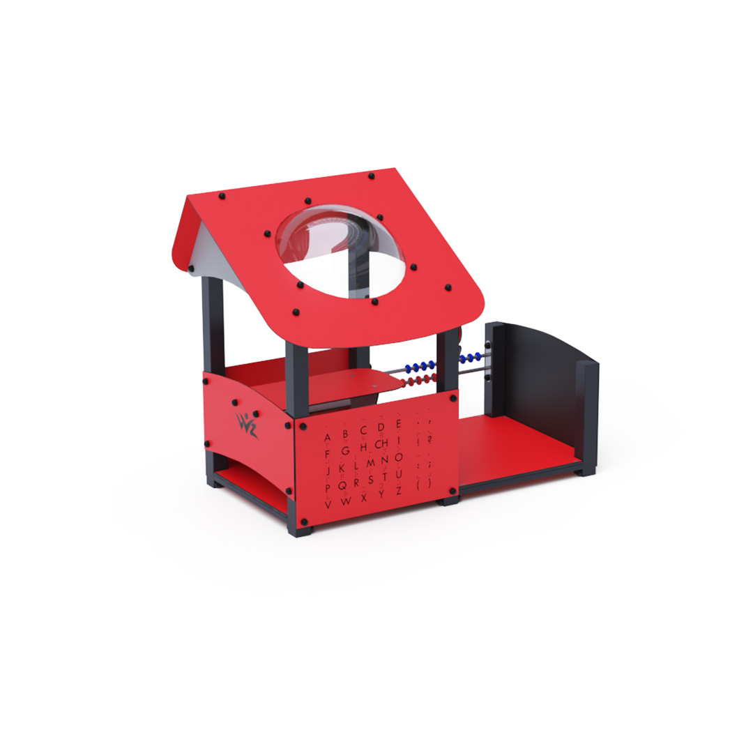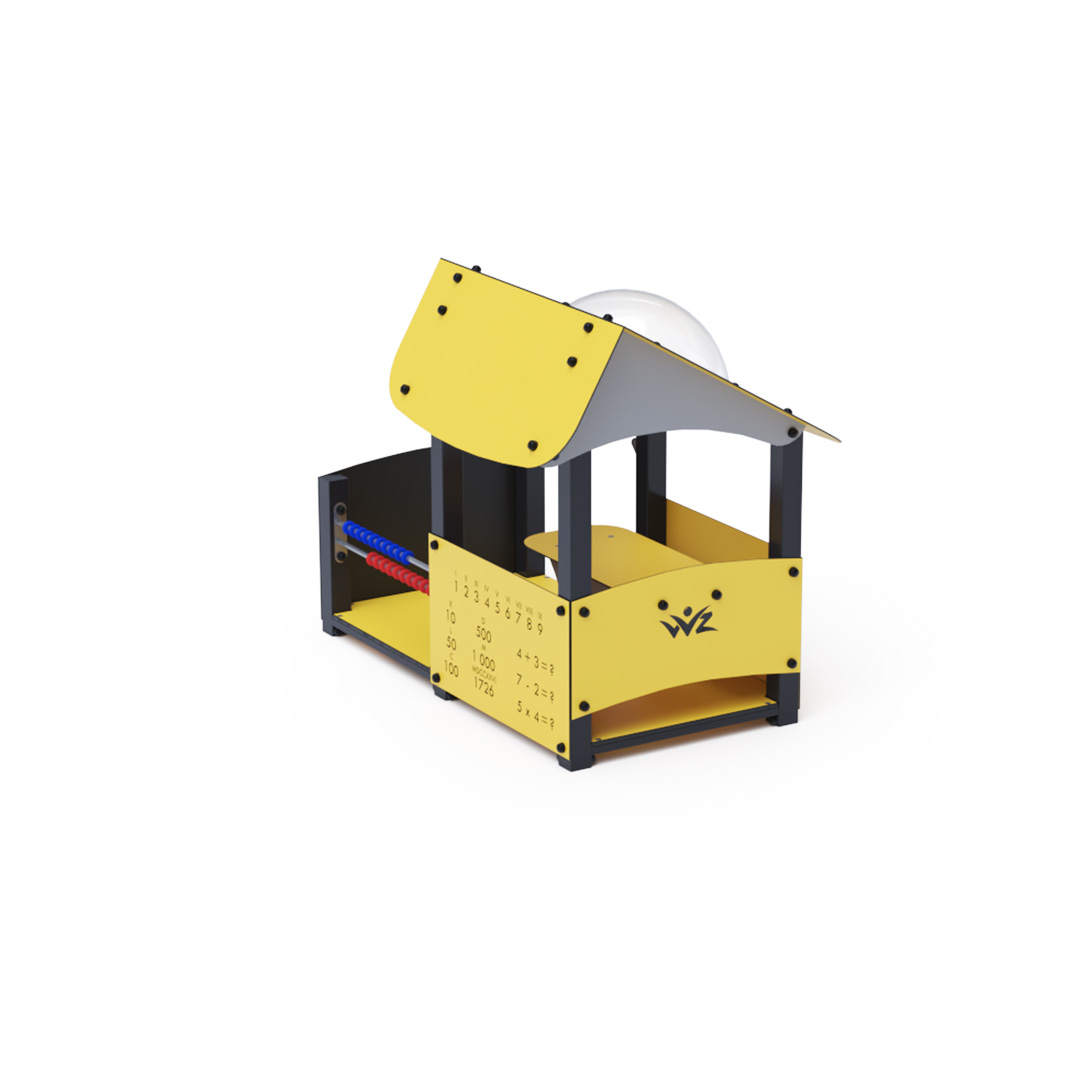 Educational playhouse full of fun that not only teaches new things but primarily entertains a group of children. The house with a sloping roof is complemented by an educational panel with numbers, a drawing board, and a small abacus.Construction of the playhouse is made of galvanized and powder-coated steel. All panels are crafted from HPL material with UV protection, ensuring color stability, non-toxicity, and durability. All joints are stainless steel and covered with plastic caps.