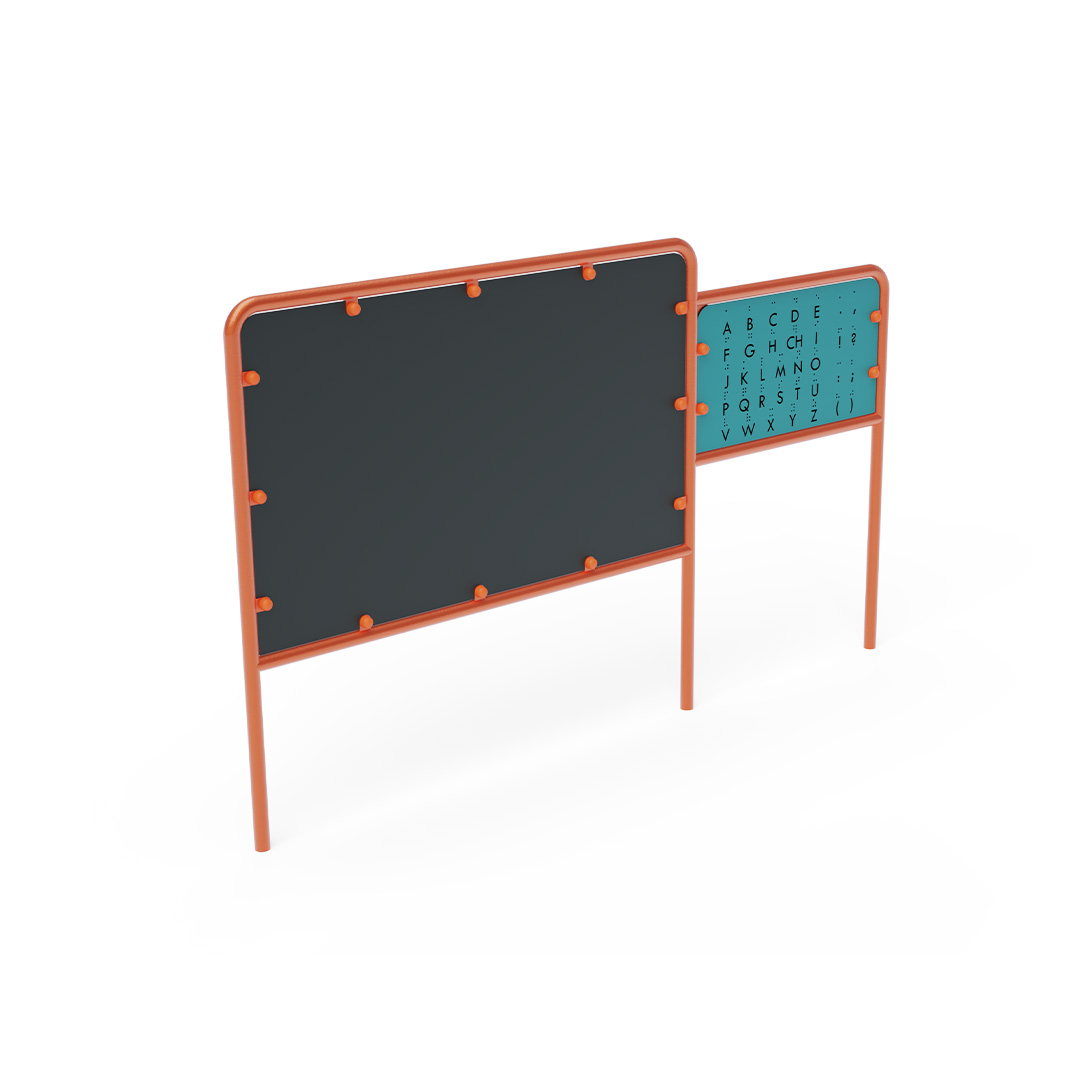 Drawing with chalk on a board never gets old. The drawing board is an ideal play element for kindergartens or playgrounds in residential areas. A double-sided drawing board made of HPL material measuring 1.5 x 1.0 m provides ample space for children's imagination. HPL material is chemically resistant, UV-resistant - colorfast, non-toxic, recyclable, and shatterproof. If children want to practice writing letters, they can trace the alphabet template on the panel.The construction of the educational panel is made of galvanized steel treated with powder coating. Joints are stainless steel and covered with plastic caps to increase safety and durability. The discs of the alphabet are made of HPL material, which is chemically resistant, UV-resistant, non-toxic, recyclable, and shatterproof, thereby eliminating the risk of injury to children from sharp edges or fragments.