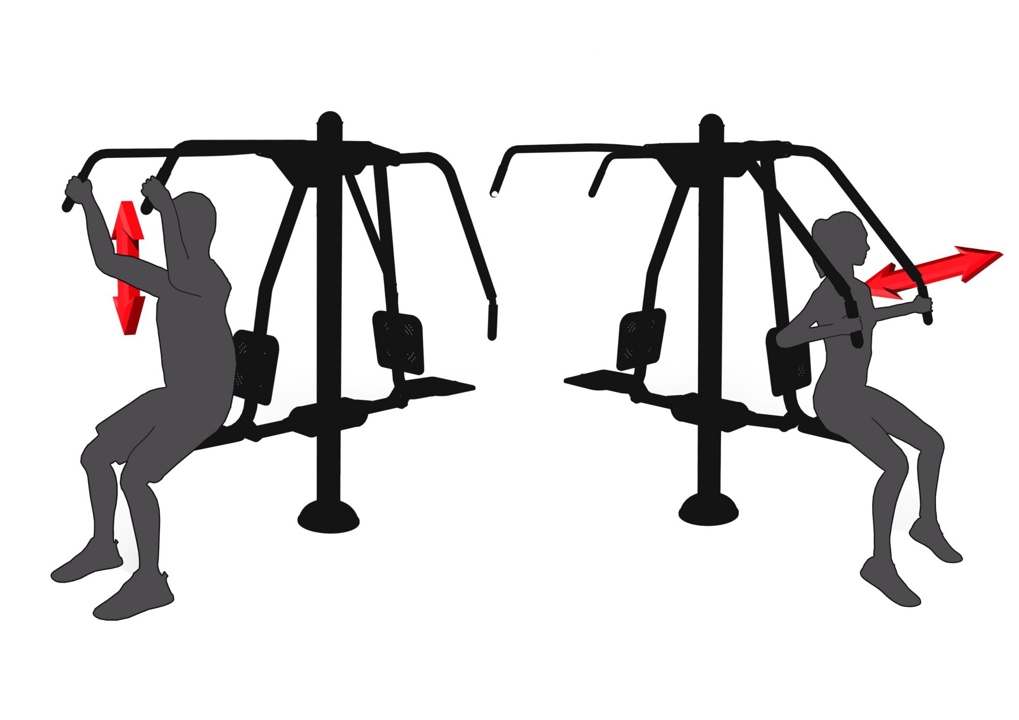 Back: Sit upright and firmly grasp the handles. Slowly pull your arms down to chest level, then return them to the original position. Inhale while pulling down, exhale while moving upward.Press: Sit straight with a firm back. Grasp the handles and push forward until your arms are almost fully extended and straight. Slowly return your arms to the starting position. Inhale while pushing, exhale when returning to the starting position.
