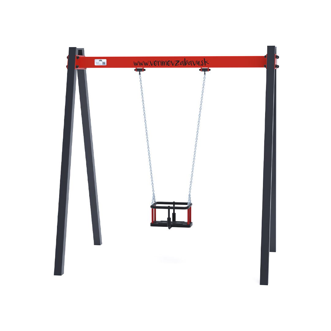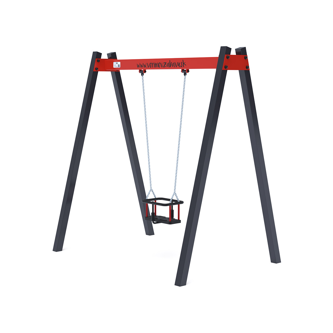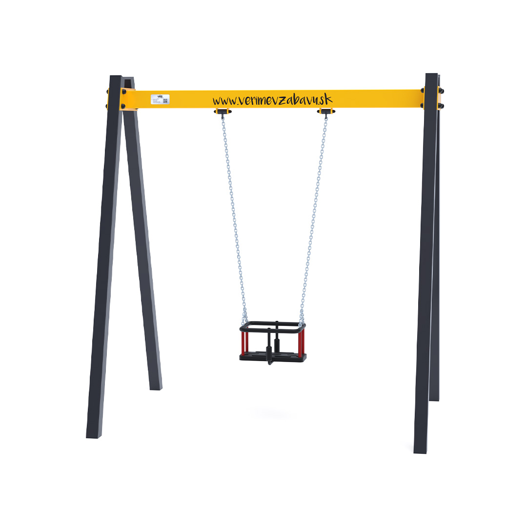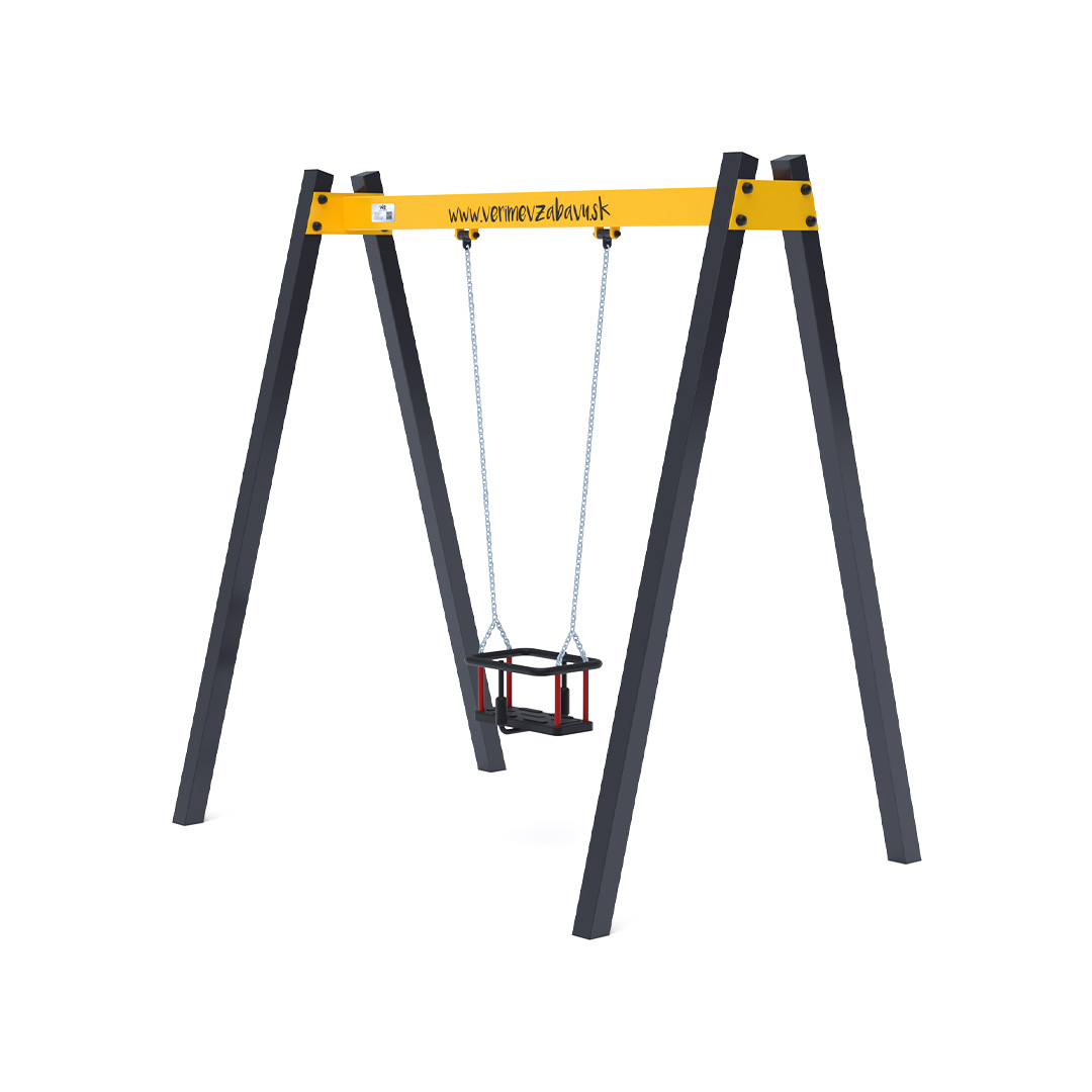 The VVZ-VH002 hanging swing with a baby seat for one child is made of hot-dip galvanized steel, finished with a powder coating. The connecting materials are stainless steel and covered with plastic caps to enhance durability and safety. The VVZ-VH002 swing is certified according to the STN EN 1176 standard. It is recommended to use a grass reinforcement mat as the impact surface.