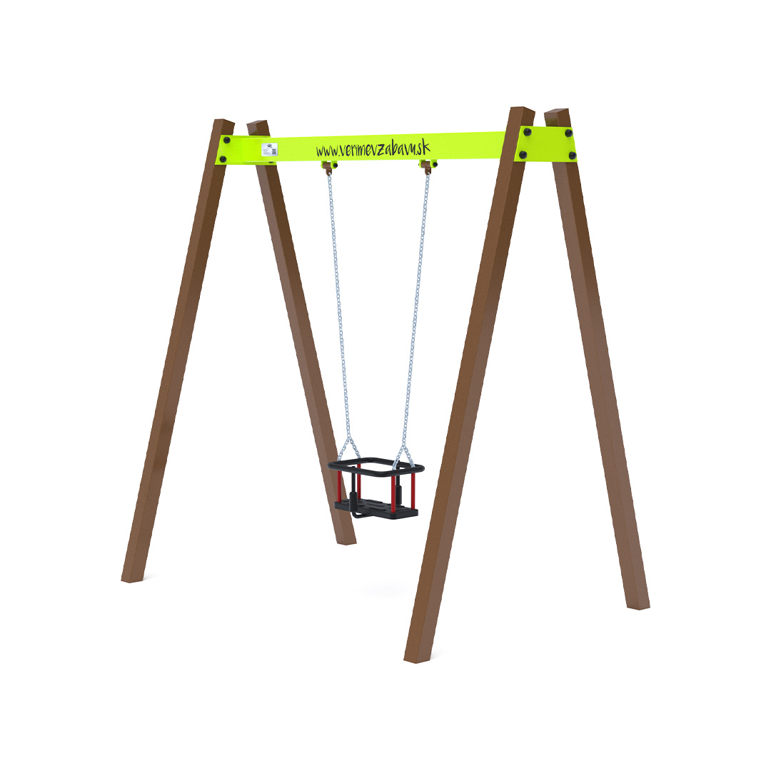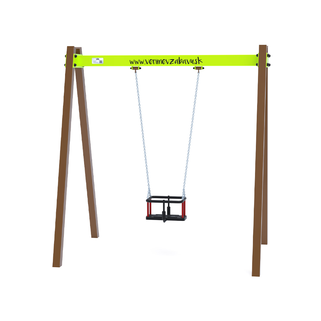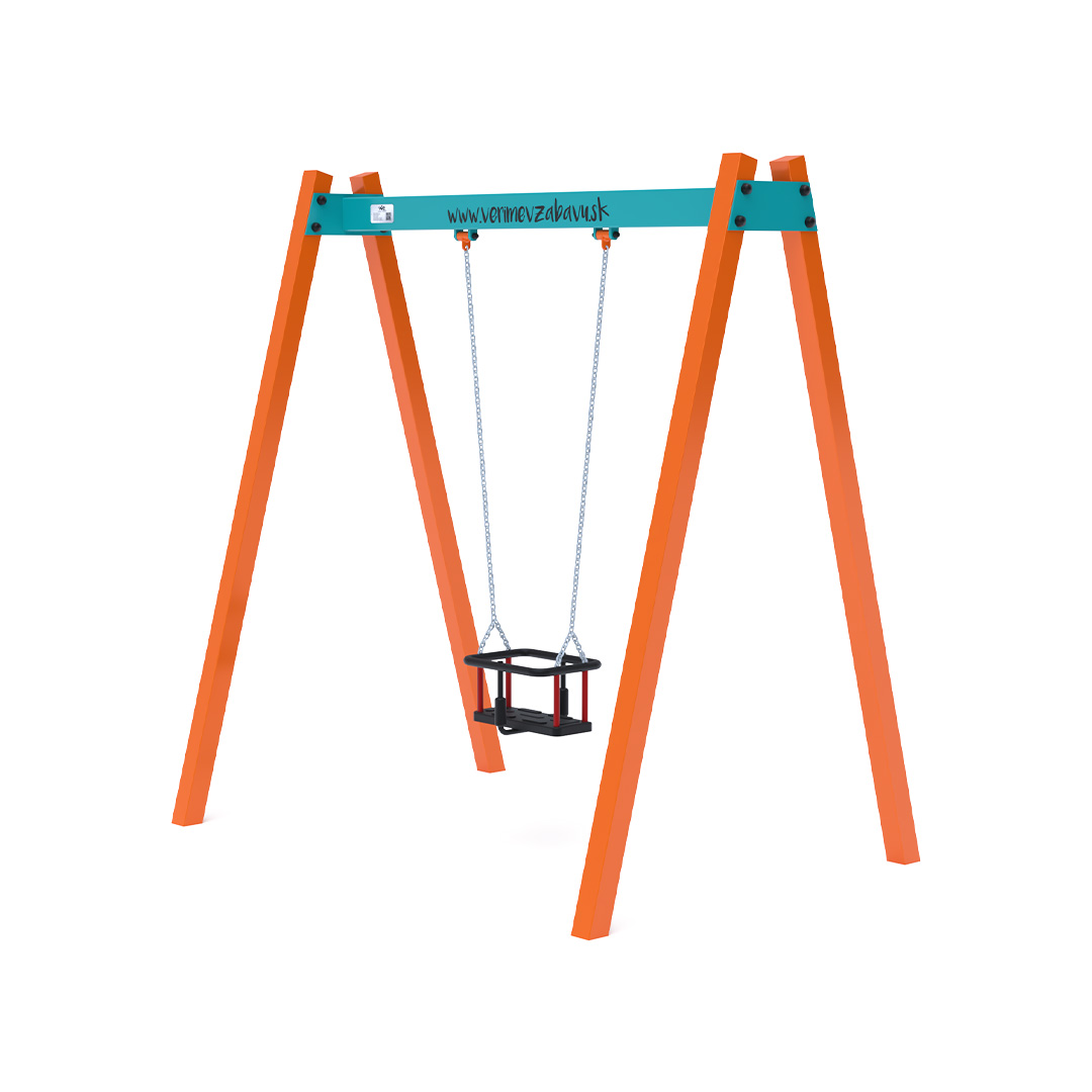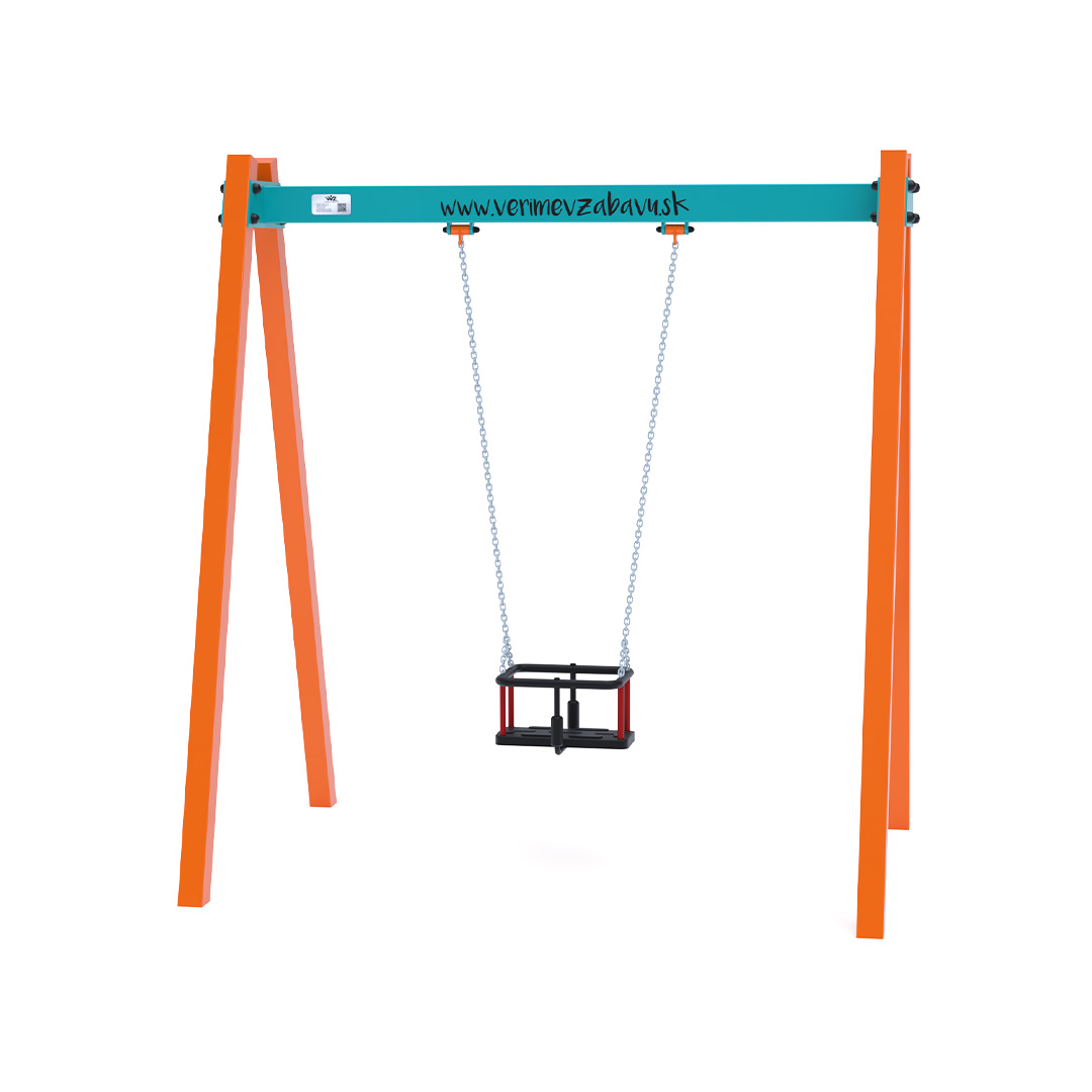 The VVZ-VH002 hanging swing with a baby seat for one child is made of hot-dip galvanized steel, finished with a powder coating. The connecting materials are stainless steel and covered with plastic caps to enhance durability and safety. The VVZ-VH002 swing is certified according to the STN EN 1176 standard. It is recommended to use a grass reinforcement mat as the impact surface.