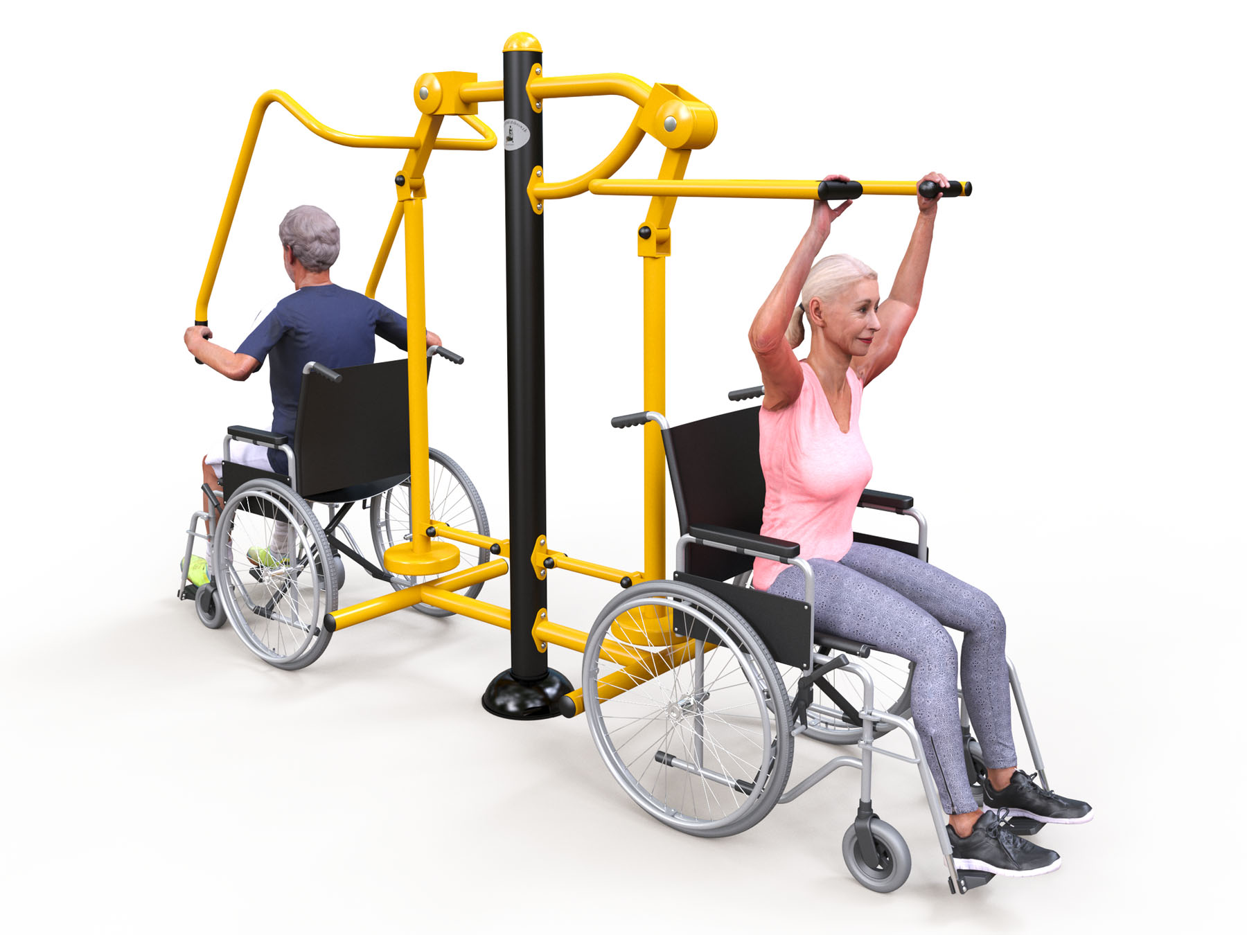 How to exercise – Pushing: Position yourself with your wheelchair so that your back is facing the structure and the handles are in front of you. Grasp the handles and push the arms of the machine upward to a height that is comfortable for you. Then lower the arms of the machine in a controlled motion. Pulling: Position yourself with your wheelchair so that your back is facing the structure and the handles are above you. Grasp the handles and pull the arm of the machine downward to a position that is comfortable for you. Then lift the arm back up to its original height in a controlled motion. After several sets, take a break.