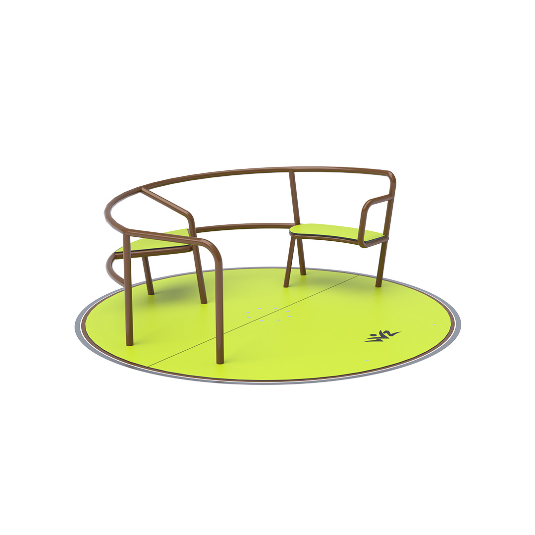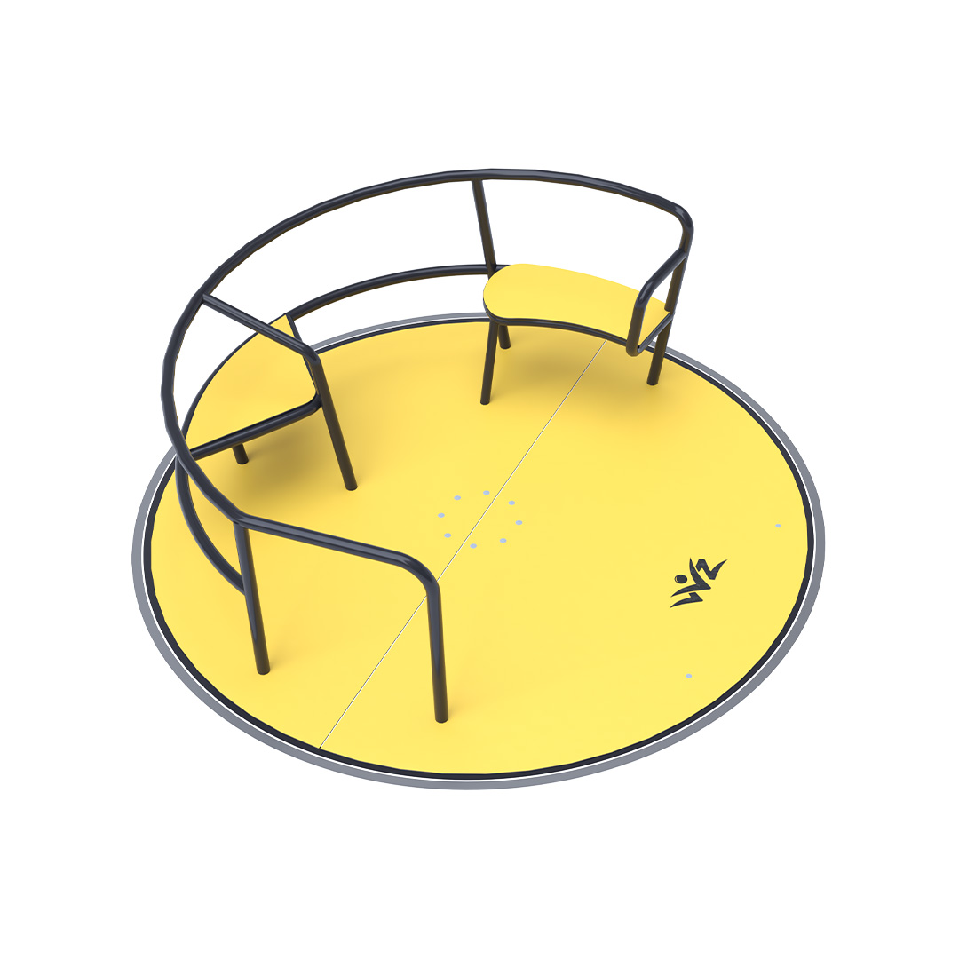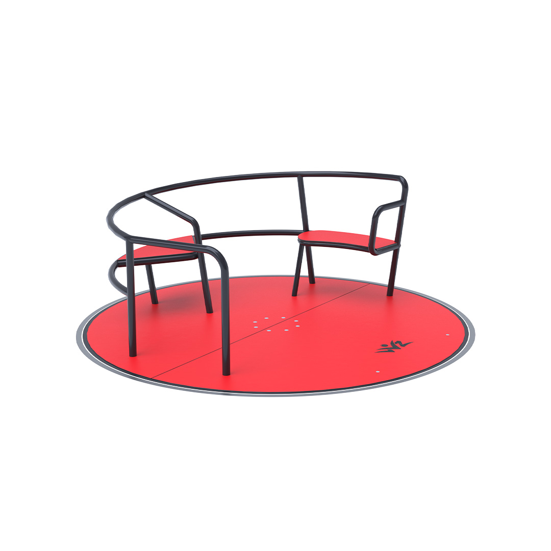 The children’s inclusive carousel with seats is made of galvanized steel, which is treated with powder paint. It is designed with regard to achieving a long service life and operational safety. The floor and seats are made from ecological HPL material that is resistant to UV, non-toxic and recyclable and unbreakable so there is no danger of children being injured by sharp