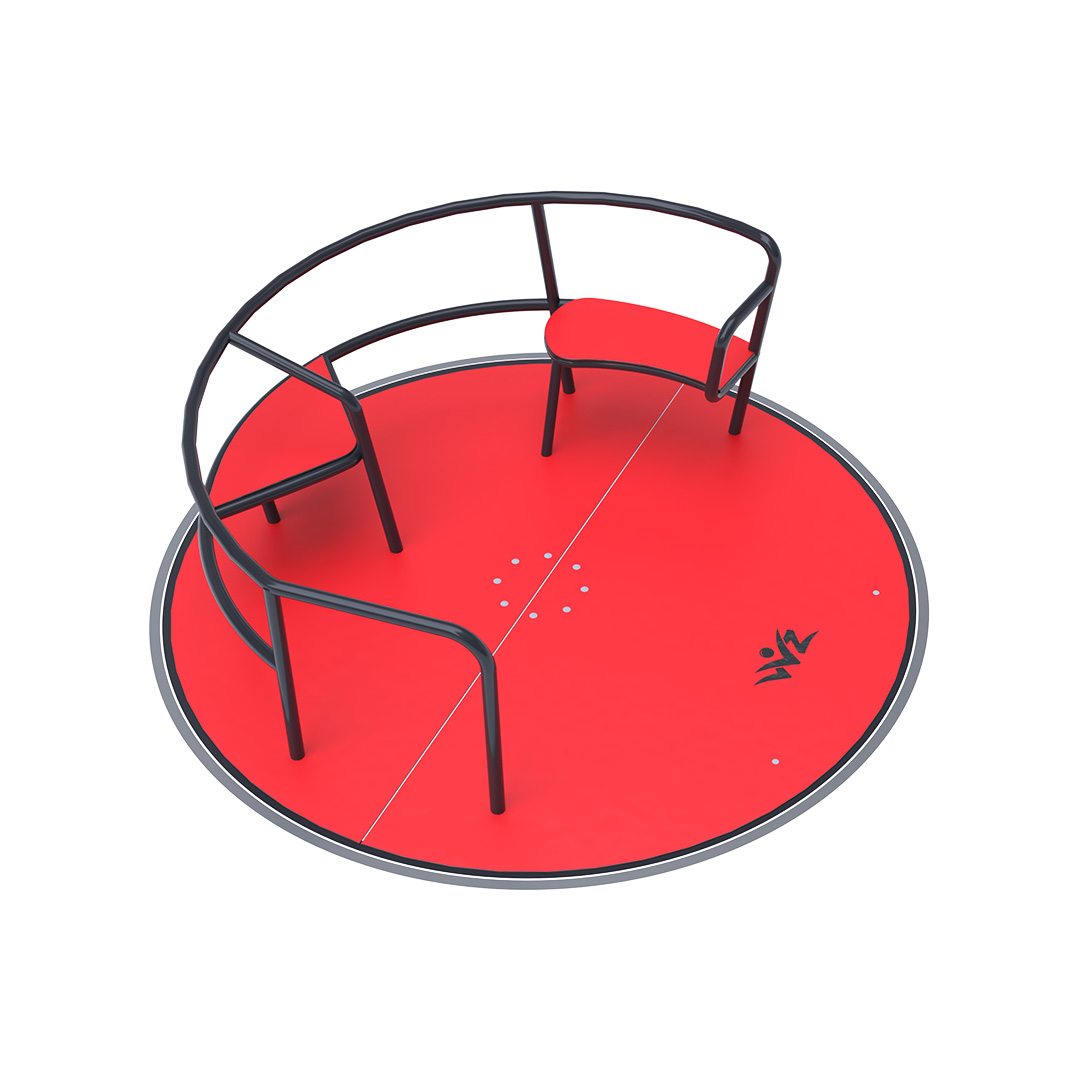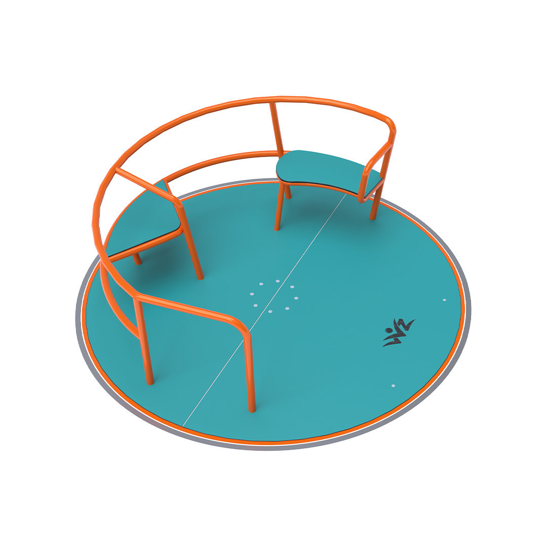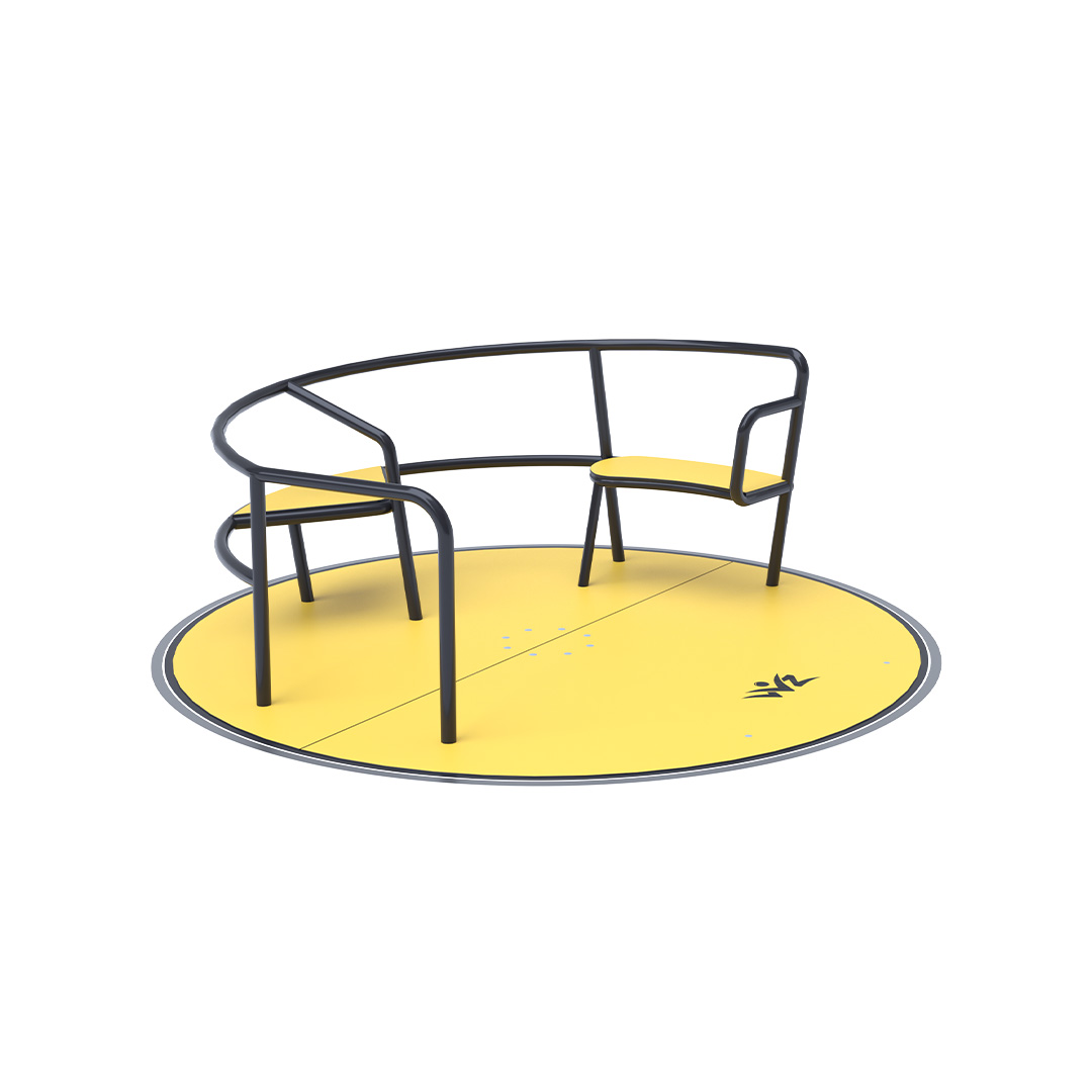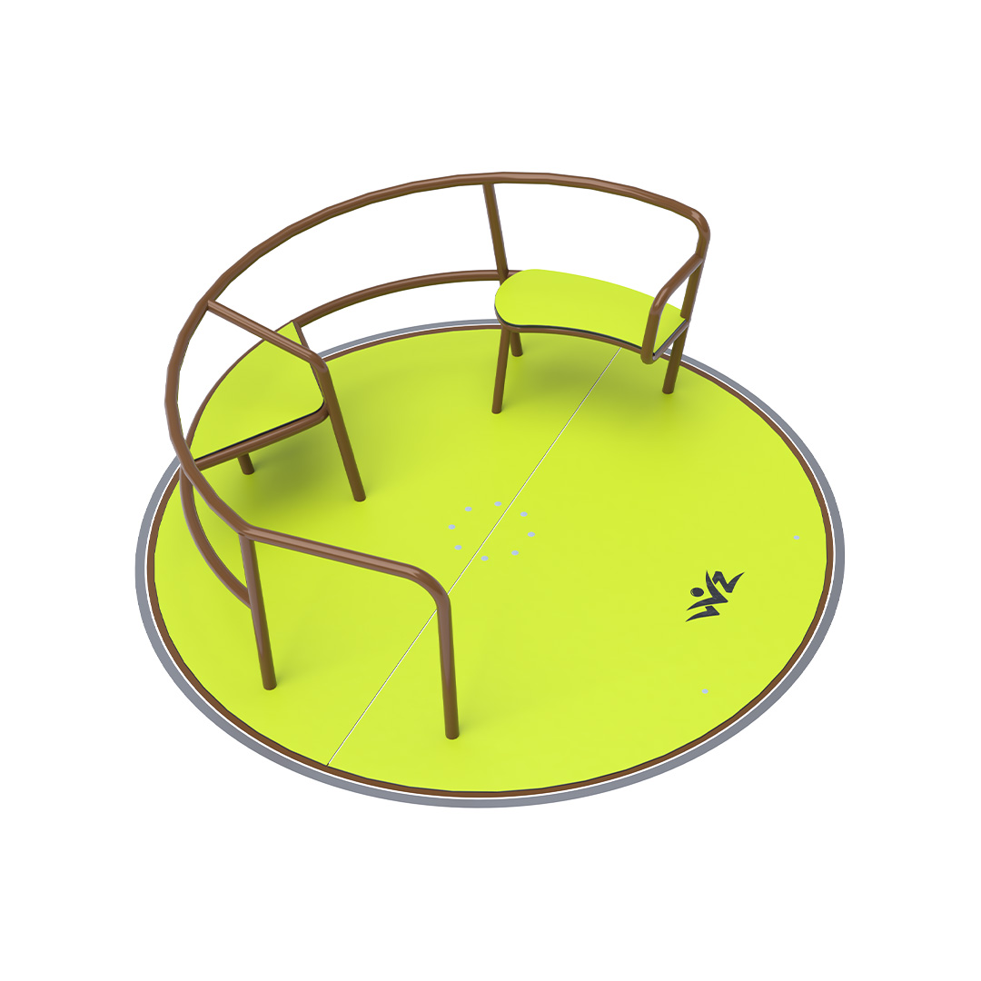 The children’s inclusive carousel with seats is made of galvanized steel, which is treated with powder paint. It is designed with regard to achieving a long service life and operational safety. The floor and seats are made from ecological HPL material that is resistant to UV, non-toxic and recyclable and unbreakable so there is no danger of children being injured by sharp