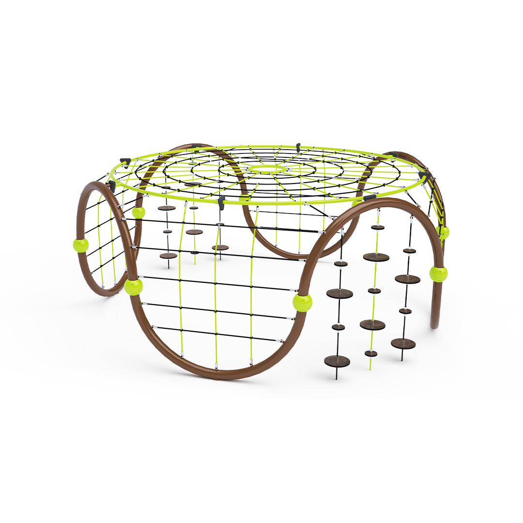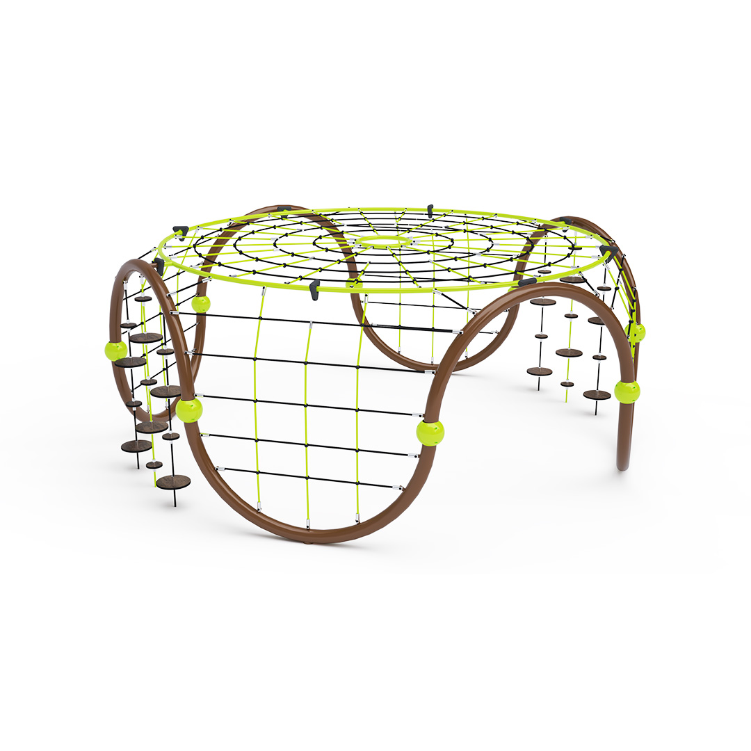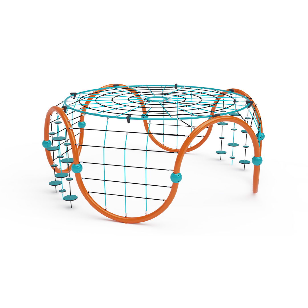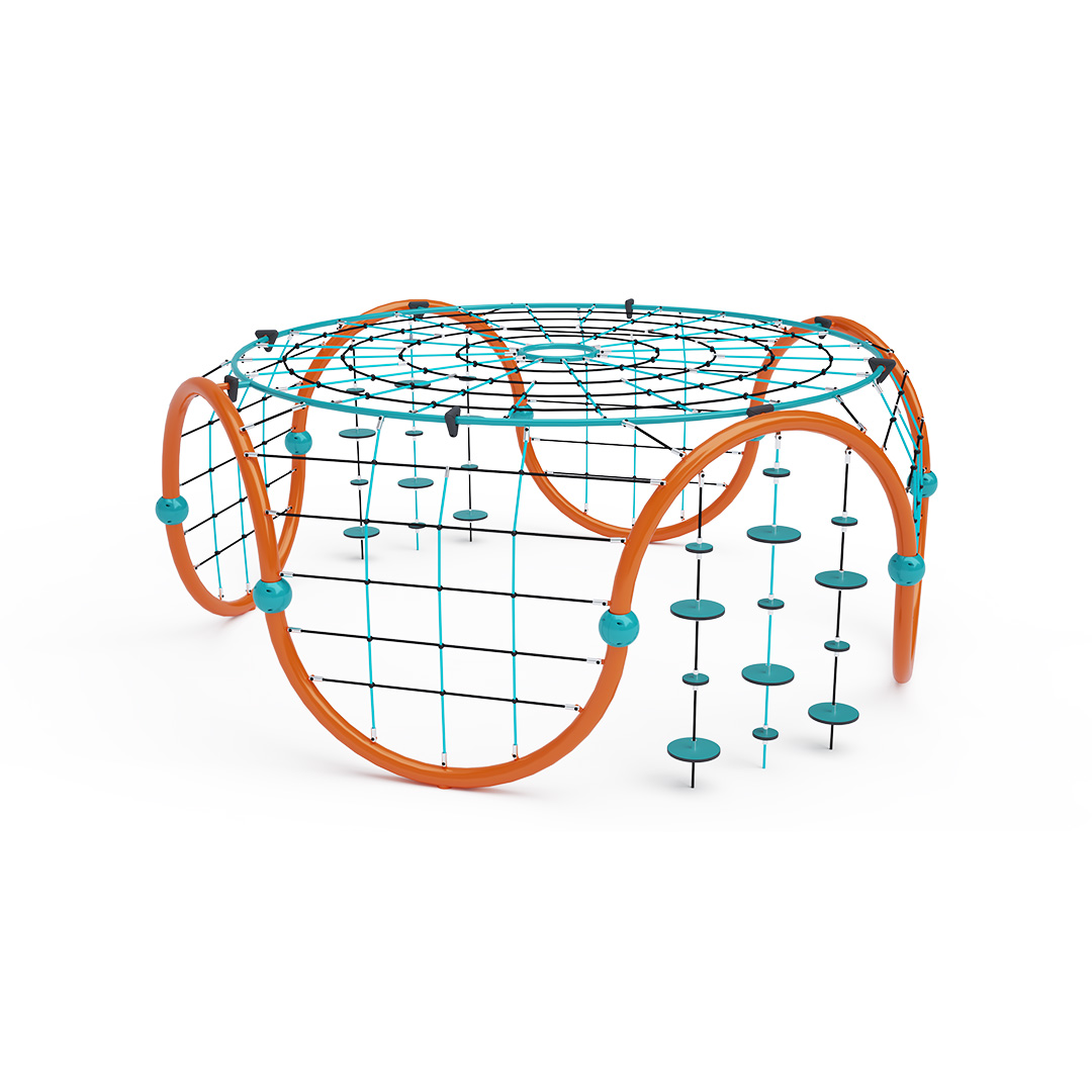 Medium-sized rope igloo with four rope exits and a large top rope net, complemented by two sets of hanging balance stones. The play element is made of galvanized steel with a quality surface finish - powder coating. Joints are stainless steel and covered with plastic caps to enhance safety and durability. Ropes are made of polyester fibers with a steel core, wound around the center. This rope construction increases its strength and resistance to mechanical stress. Polyester itself has many positive properties: it is resistant to microorganisms and weather conditions, dries quickly after rain, is colorfast, and exhibits high strength.