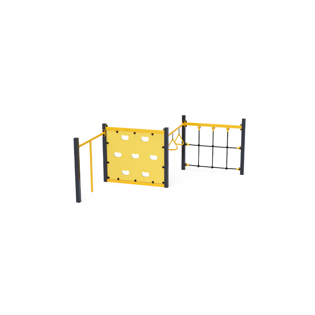 The Mini Gymcenter consists of four different segments: a climbing pole, a climbing wall with climbing grips, "ring" handles for gripping, and a climbing rope net. The play element is made of hot-dip galvanized steel with a high-quality surface finish. The joints are made of stainless steel and covered with plastic caps to enhance the safety and durability of the connections. The ropes are made from polyester fibers, wound around the center, which increases their strength and resistance to mechanical strain. Polyester offers numerous advantages: it is resistant to microorganisms, weather conditions, dries quickly after rain, is colorfast, and has high strength. The Mini Gymcenter VVZ-MGYM002 is certified according to the STN EN 1176 standard.